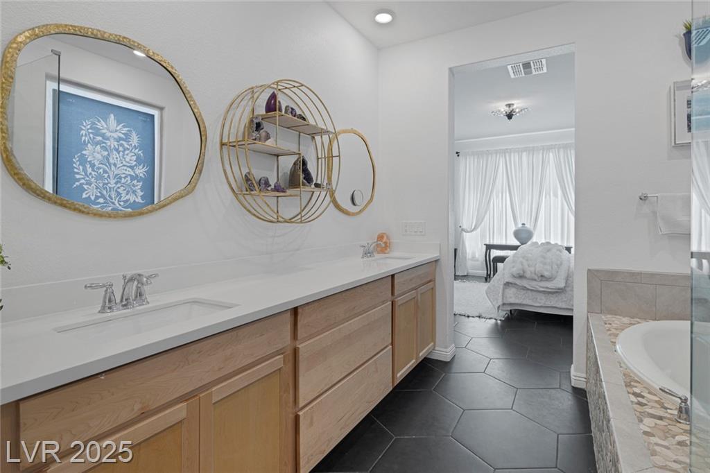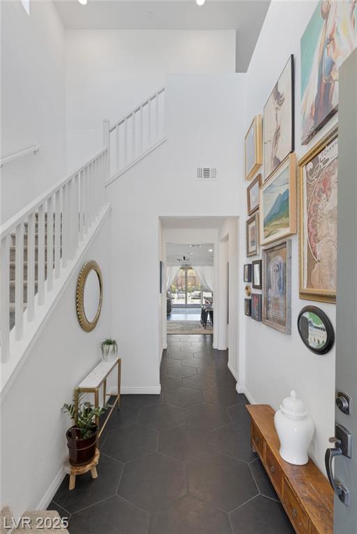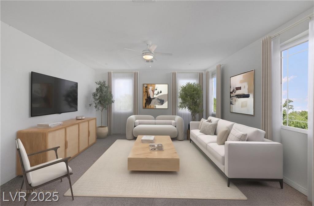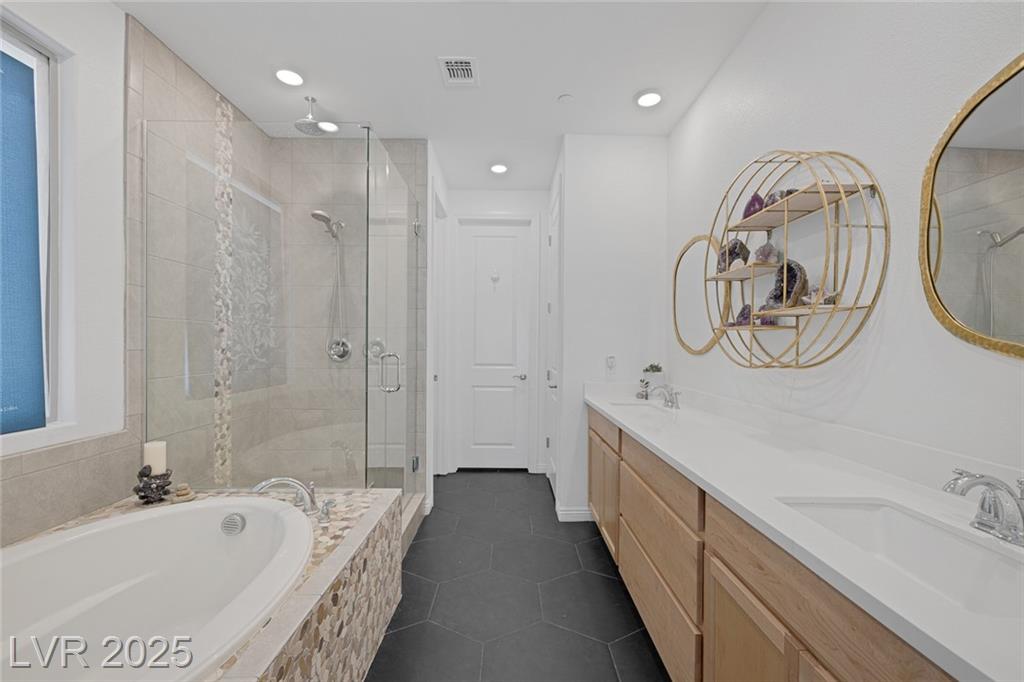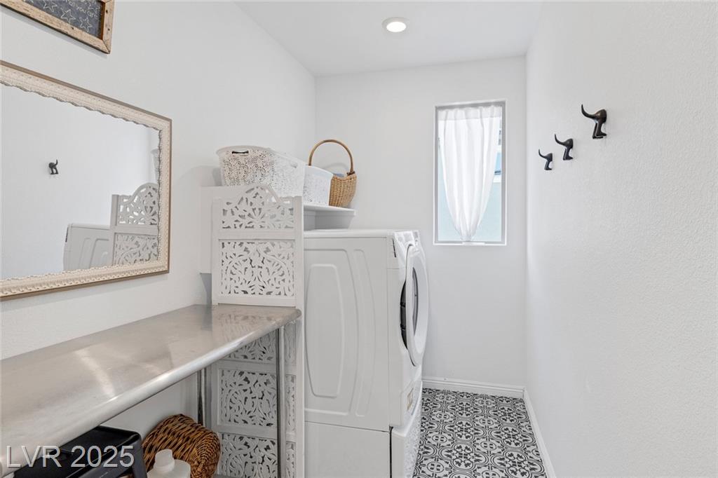 NEW PHOTOS ARE IN | Clean and bright with immaculate energy, this tranquil home lives like a single story with the Primary Suite on the main level and a RARE 4th bathroom. Open gathering rooms are filled with natural light and ample hidden storage expands usable areas, making it feel a little easier to breathe. Soaring vaulted ceiling with abundant light makes a cheerful entry and a large loft adds a 2nd living space. Spacious bedrooms include large closets and an ensuite upstairs. Nestled on a quiet tree lined cul-de-sac, find peace in this gated community with gorgeous views. Enormous pool-sized yard has been beautifully landscaped with rows of trees and smooth river pebbles, with a natural clover lawn on order! Located in the rare, small cross-section where the highest-rated elementary, middle and high schools converge, this community enjoys above-average appreciation. Near the best hiking, biking, and climbing in the highly sought after Summerlin community. SCHEDULE A TOUR TODAY!