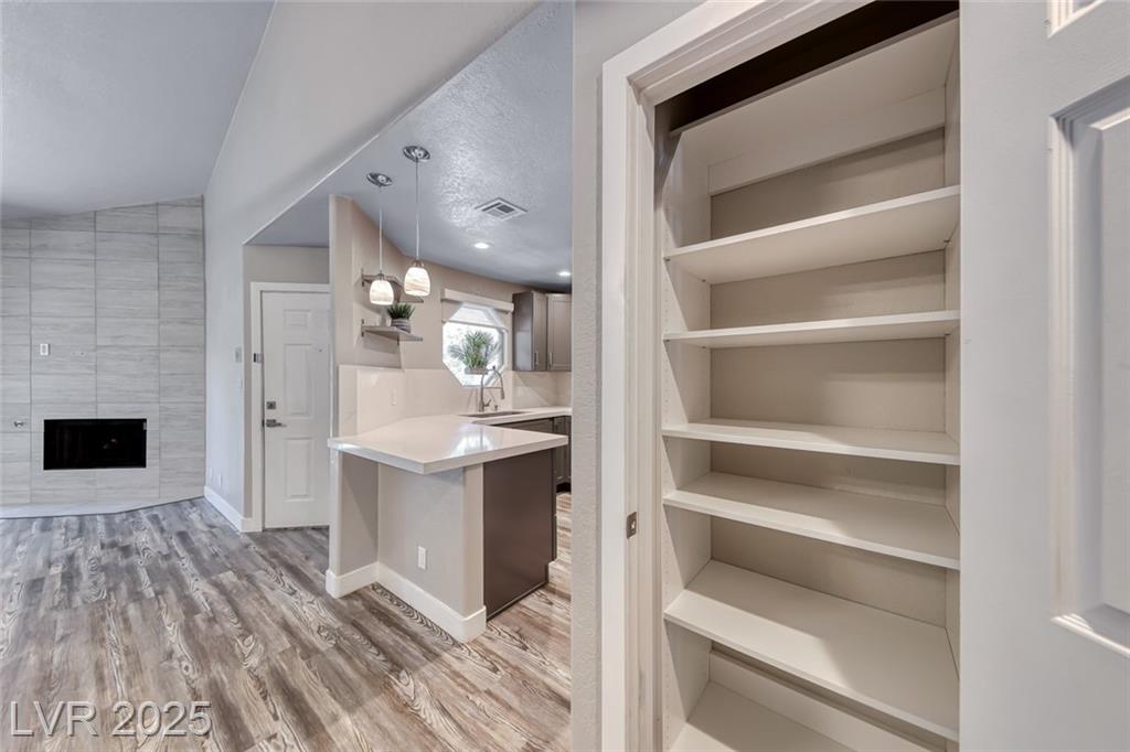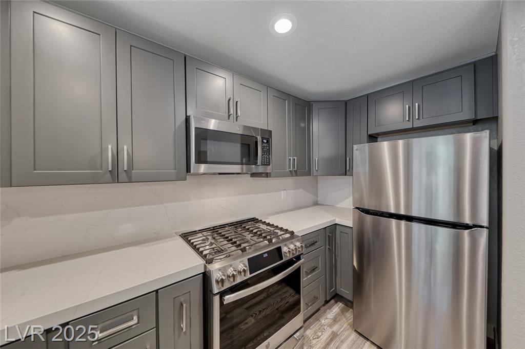 Stunning 1 bed/1 bath 2nd-floor condo (841 SF) in the gated Vizcaya at the Trails community! This beautifully upgraded unit features luxury vinyl plank flooring (NO CARPET), designer lighting, and a remodeled kitchen and bathroom (2021). Kitchen features quartz countertop/backspalsh, stainless appliances, extra-tall cabinetry with soft close cabinets and drawers.. Cathedral ceilings, LED lighting, and a cozy gas fireplace create an elegant living space. Two balconies offer indoor-outdoor living. The spacious bedroom has a walk-in closet with custom organizers and a balcony helps create an expansive feel. The bath boasts a large walk-in shower with designer tile and a window, a marble-top vanity and a linen closet. Upscale window coverings top it all off! Unit includes 1 covered parking space. Enjoy the community amenities including a clubhouse with gym, theater, 6 pools, 4 spas, 2 tennis courts, and mature landscaping. Turnkey and beautifully updated! Come see it before it is gone!