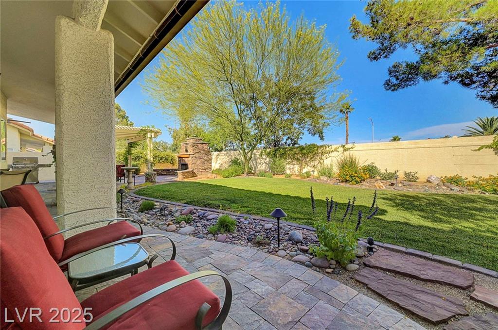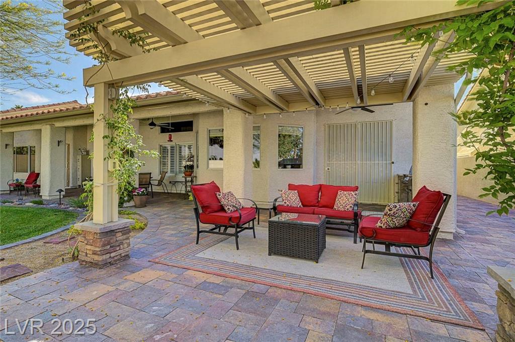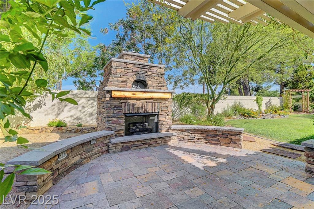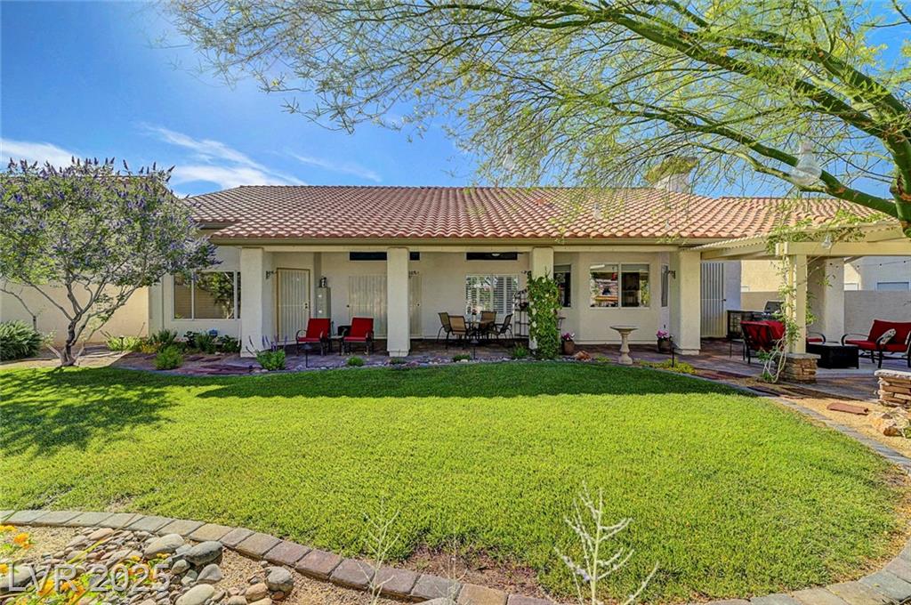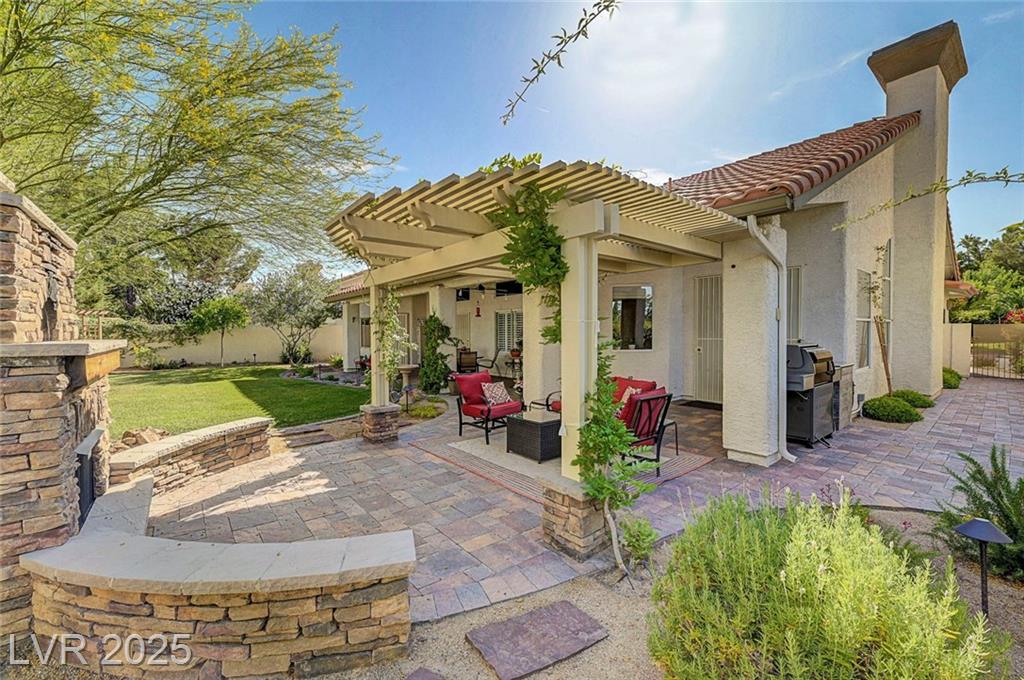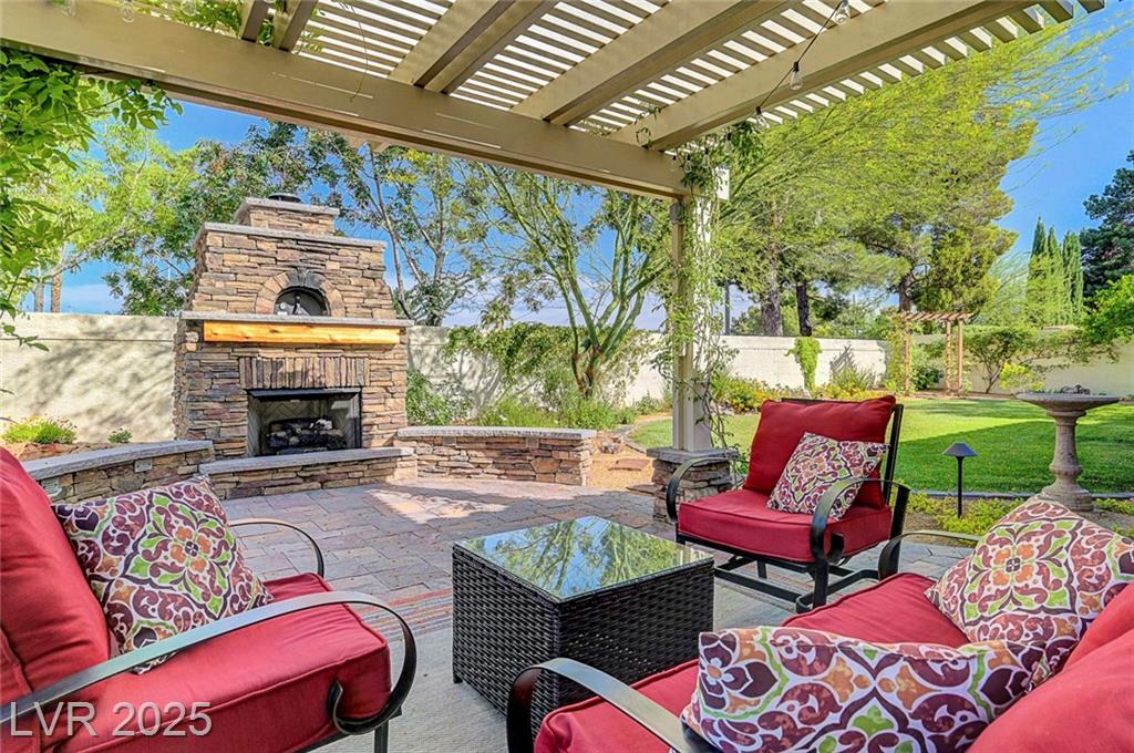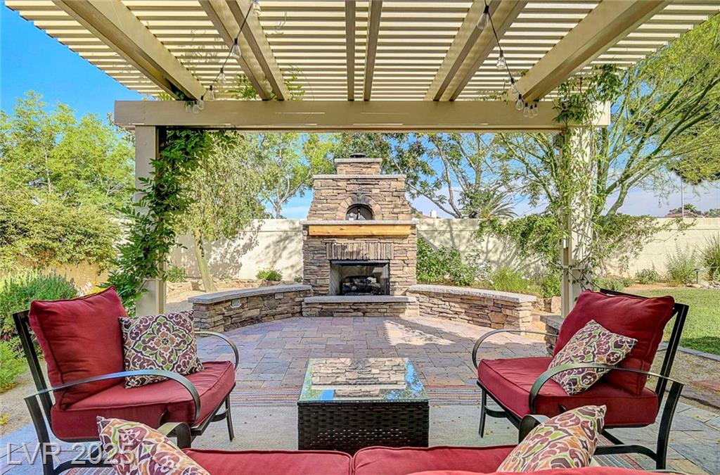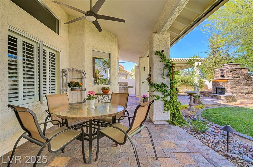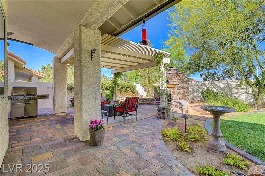 Beautifully renovated home in the heart of Peccole Ranch, where tree-lined walking paths, clubhouse, and playground create a welcoming community just minutes from Downtown Summerlin, Red Rock, and Tivoli Village. Sun-filled living spaces showcase wood flooring in bedrooms, elegant tile in living areas, and plantation shutters throughout. The gourmet kitchen is designed for both function and style, featuring Silestone counters, solid maple KraftMaid cabinets with roll-out shelves, island, walk-in pantry, and Kenmore Elite stainless appliances including double ovens and new water system. The spa-inspired primary suite offers freestanding tub, tiled shower, and spacious walk-in closet for a true retreat. Step outside to private backyard oasis with covered patio, misting system, pizza oven, fireplace, and BBQ stub—ideal for memorable gatherings. With no rear neighbors, solar screens, and heat/theft-resistant tinted windows, this move-in ready gem blends comfort, privacy, and peace of mind.
