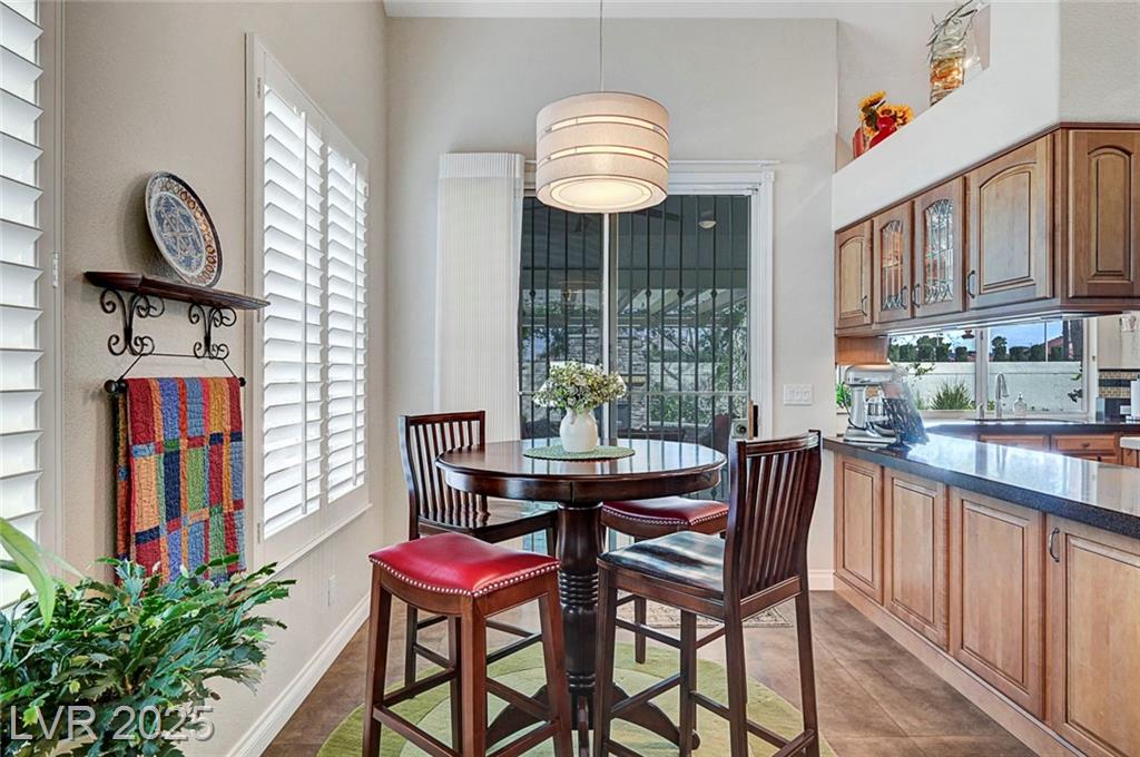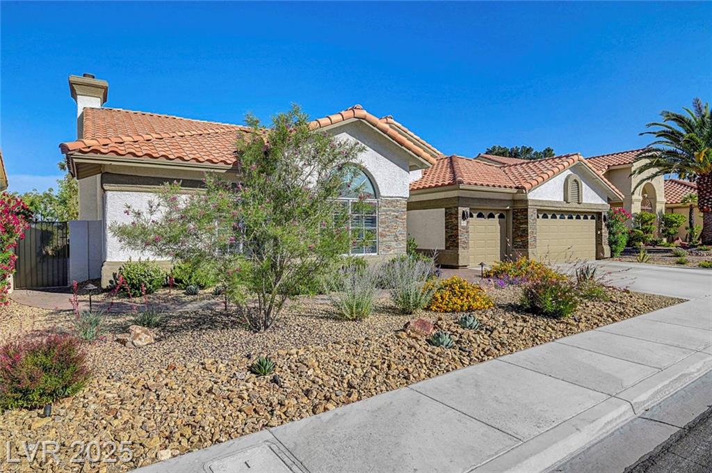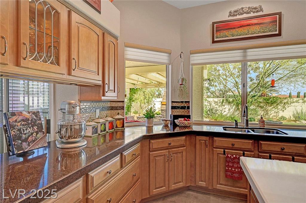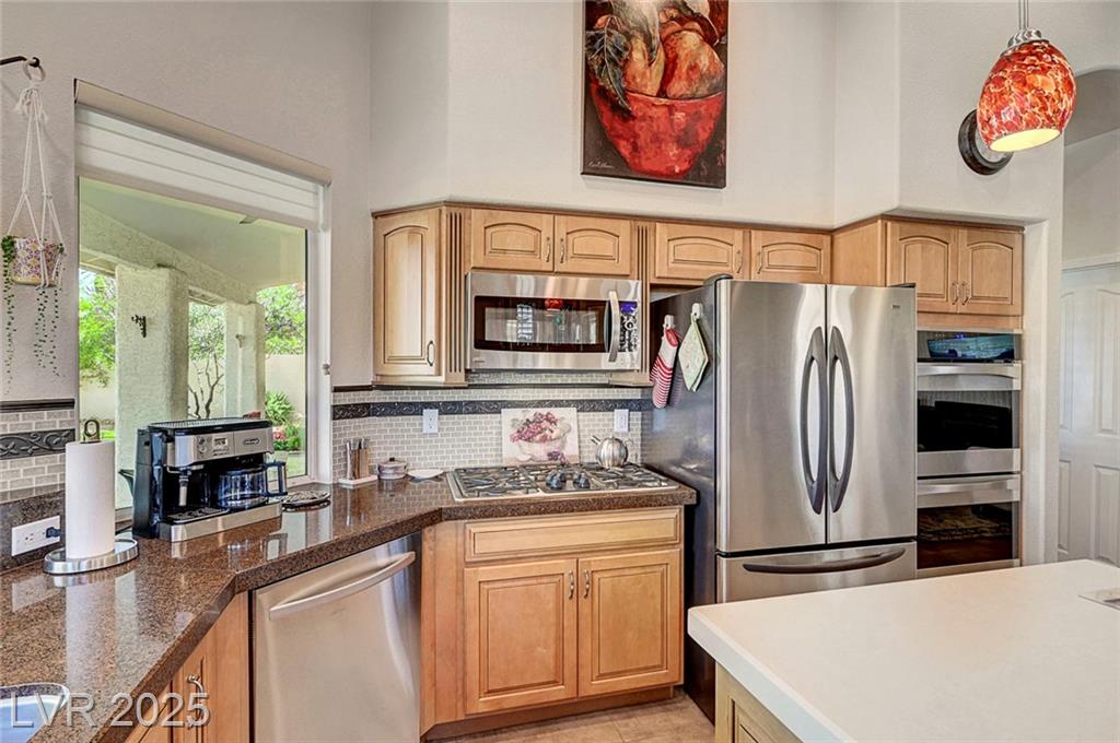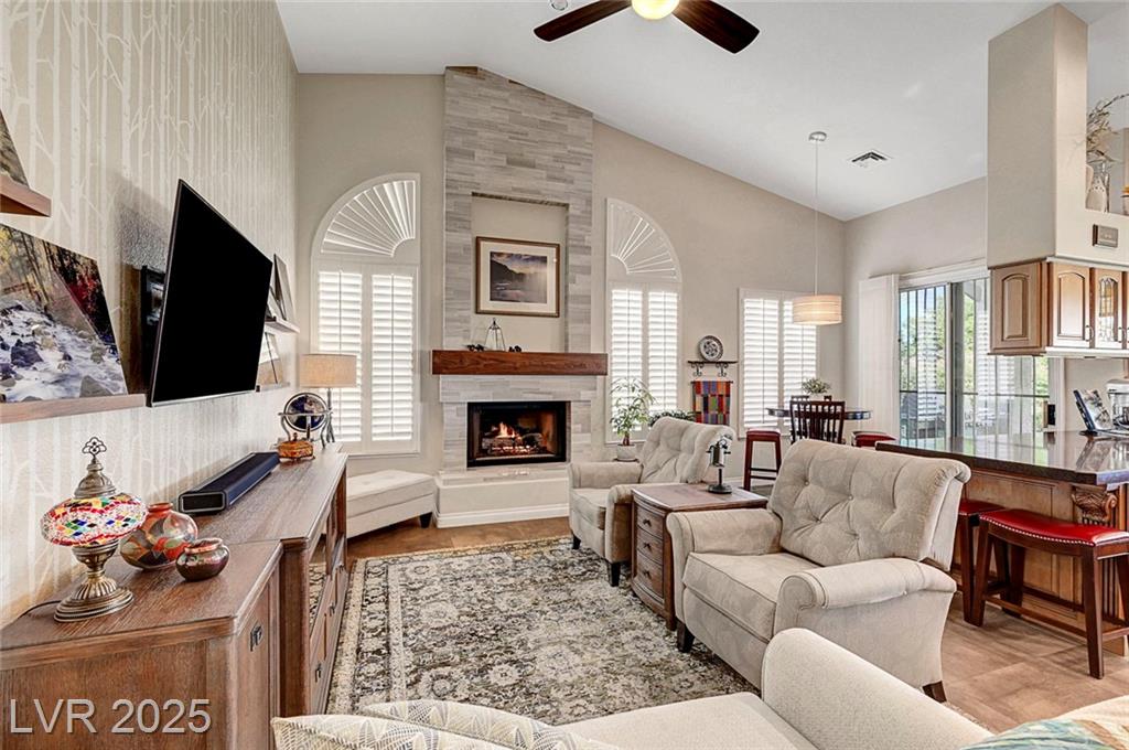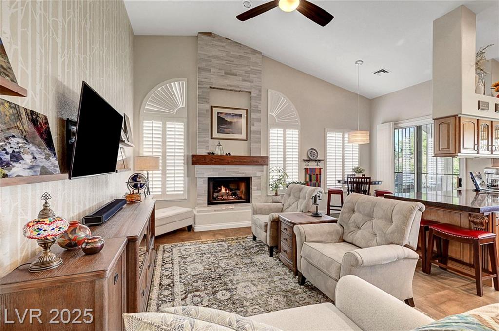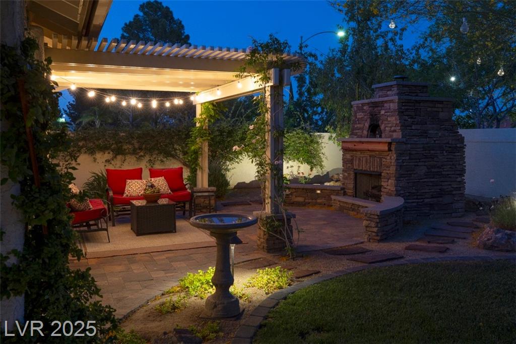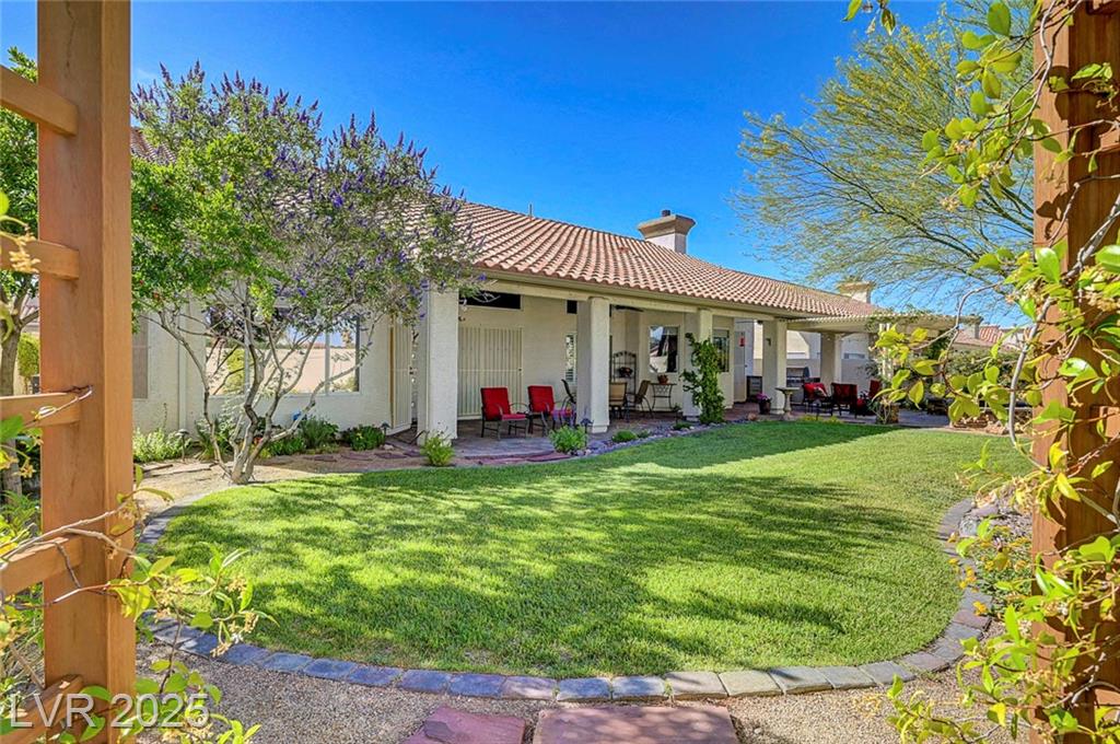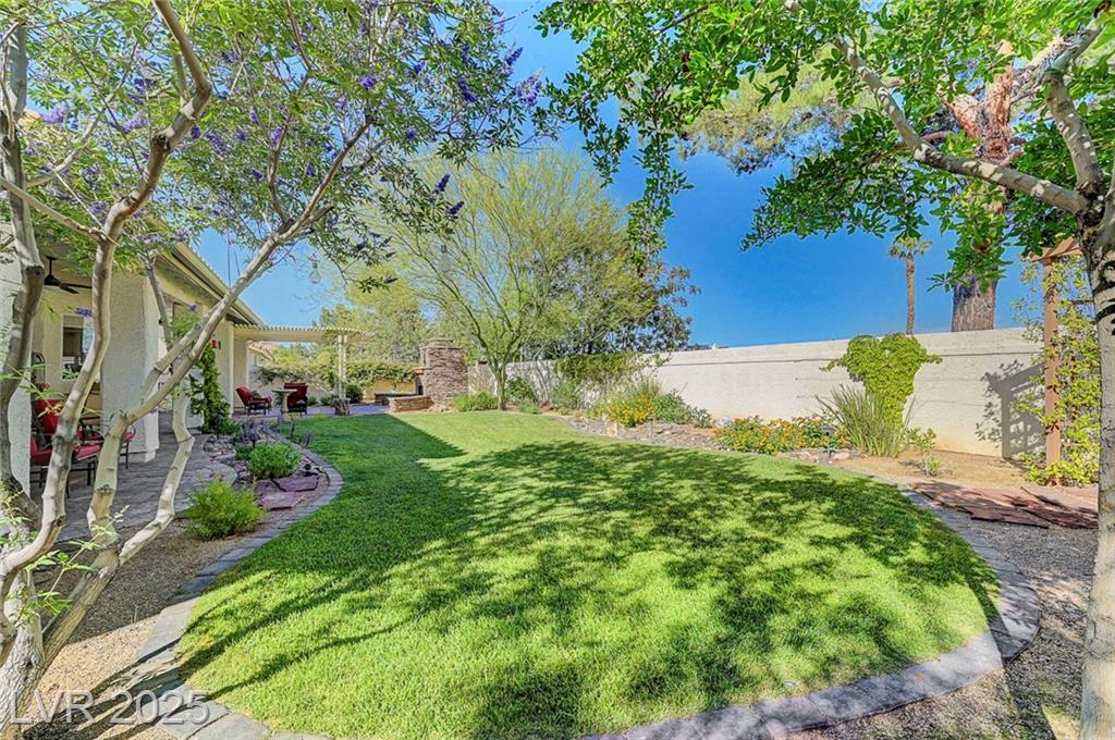 Beautifully renovated home in the heart of Peccole Ranch, where tree-lined walking paths, clubhouse, and playground create a welcoming community just minutes from Downtown Summerlin, Red Rock, and Tivoli Village. Sun-filled living spaces showcase wood flooring in bedrooms, elegant tile in living areas, and plantation shutters throughout. The gourmet kitchen is designed for both function and style, featuring Silestone counters, solid maple KraftMaid cabinets with roll-out shelves, island, walk-in pantry, and Kenmore Elite stainless appliances including double ovens and new water system. The spa-inspired primary suite offers freestanding tub, tiled shower, and spacious walk-in closet for a true retreat. Step outside to private backyard oasis with covered patio, misting system, pizza oven, fireplace, and BBQ stub—ideal for memorable gatherings. With no rear neighbors, solar screens, and heat/theft-resistant tinted windows, this move-in ready gem blends comfort, privacy, and peace of mind.