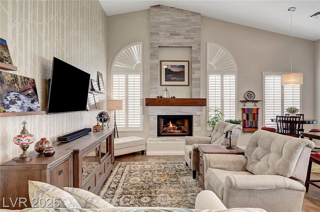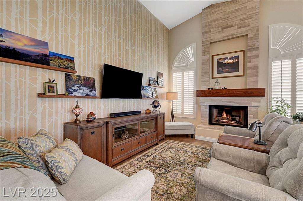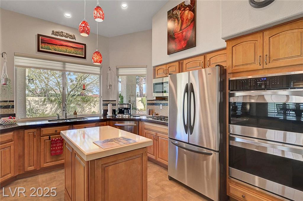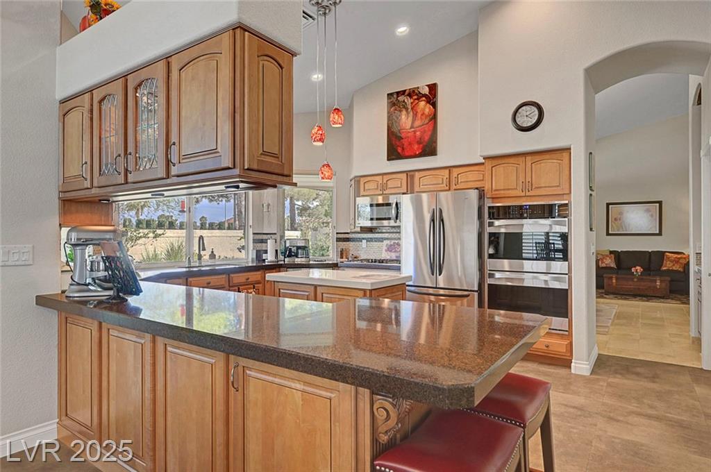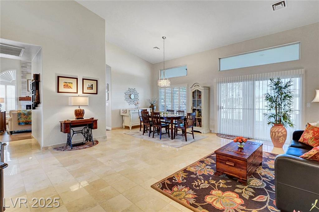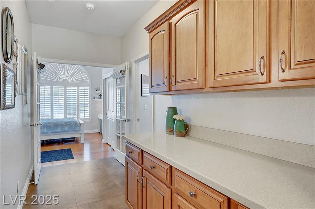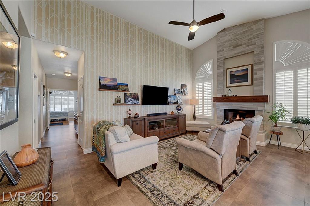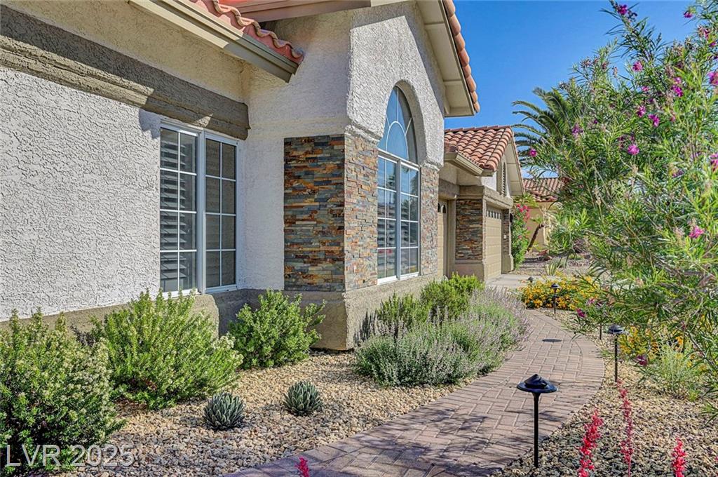 Beautifully renovated home in the heart of Peccole Ranch, where tree-lined walking paths, clubhouse, and playground create a welcoming community just minutes from Downtown Summerlin, Red Rock, and Tivoli Village. Sun-filled living spaces showcase wood flooring in bedrooms, elegant tile in living areas, and plantation shutters throughout. The gourmet kitchen is designed for both function and style, featuring Silestone counters, solid maple KraftMaid cabinets with roll-out shelves, island, walk-in pantry, and Kenmore Elite stainless appliances including double ovens and new water system. The spa-inspired primary suite offers freestanding tub, tiled shower, and spacious walk-in closet for a true retreat. Step outside to private backyard oasis with covered patio, misting system, pizza oven, fireplace, and BBQ stub—ideal for memorable gatherings. With no rear neighbors, solar screens, and heat/theft-resistant tinted windows, this move-in ready gem blends comfort, privacy, and peace of mind.