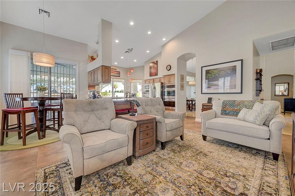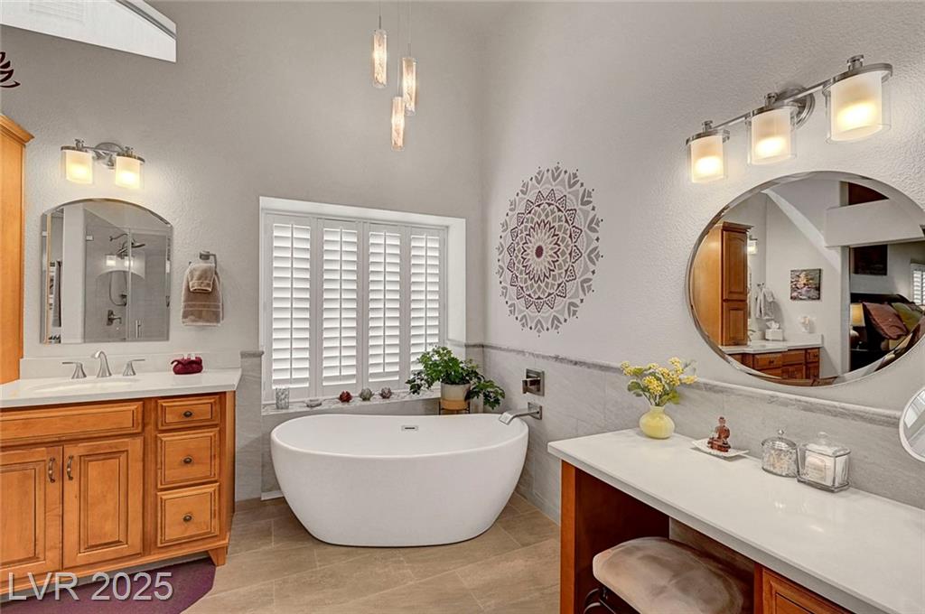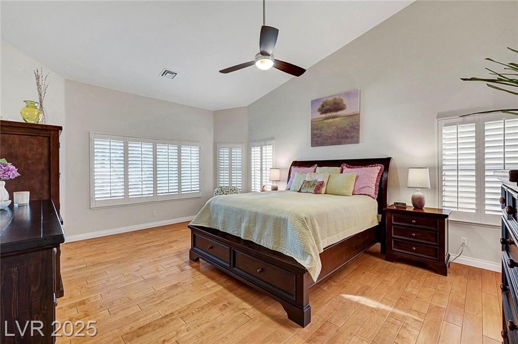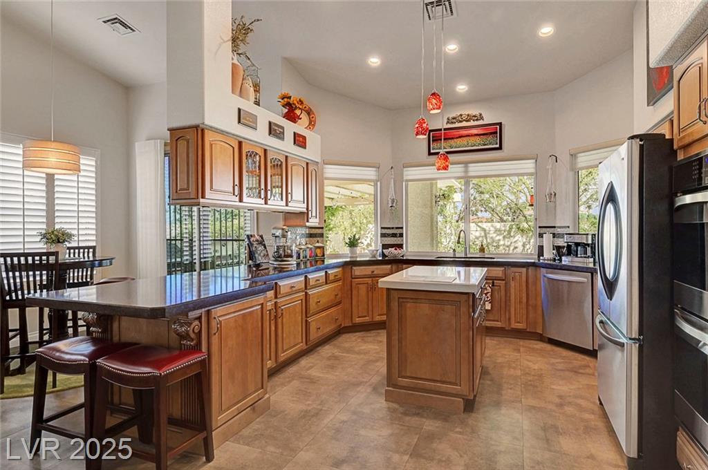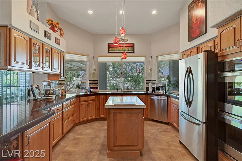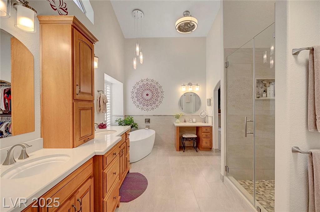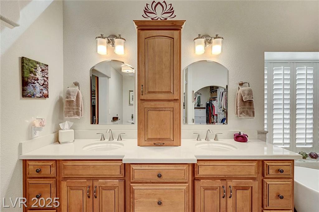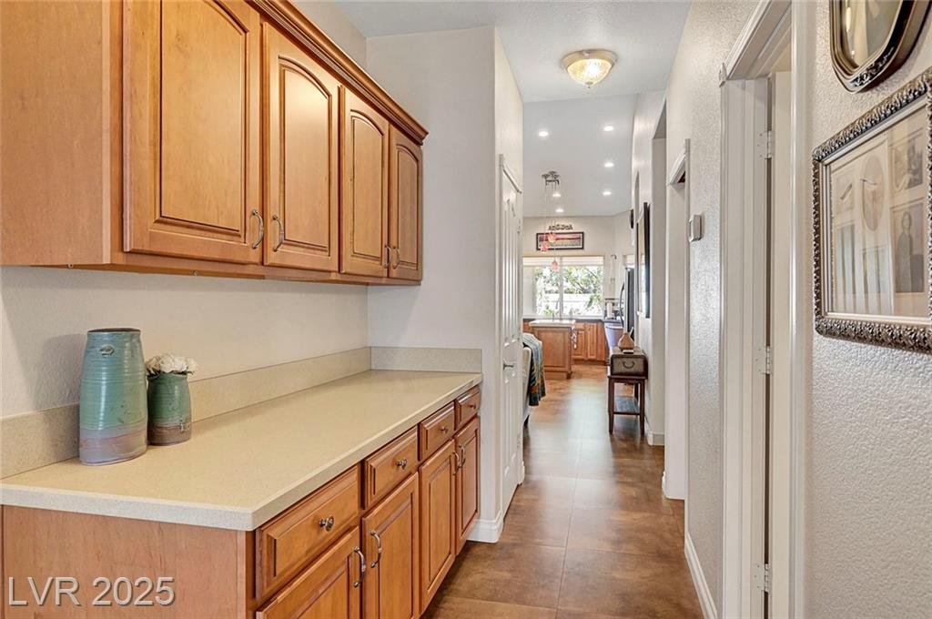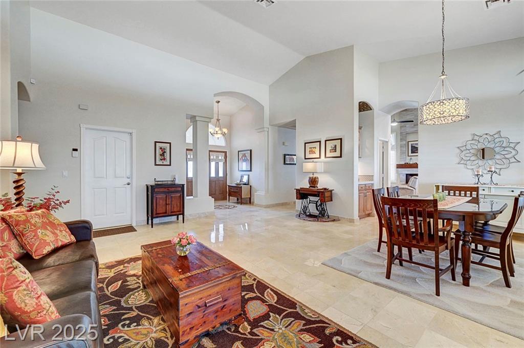 Beautifully renovated home in the heart of Peccole Ranch, where tree-lined walking paths, clubhouse, and playground create a welcoming community just minutes from Downtown Summerlin, Red Rock, and Tivoli Village. Sun-filled living spaces showcase wood flooring in bedrooms, elegant tile in living areas, and plantation shutters throughout. The gourmet kitchen is designed for both function and style, featuring Silestone counters, solid maple KraftMaid cabinets with roll-out shelves, island, walk-in pantry, and Kenmore Elite stainless appliances including double ovens and new water system. The spa-inspired primary suite offers freestanding tub, tiled shower, and spacious walk-in closet for a true retreat. Step outside to private backyard oasis with covered patio, misting system, pizza oven, fireplace, and BBQ stub—ideal for memorable gatherings. With no rear neighbors, solar screens, and heat/theft-resistant tinted windows, this move-in ready gem blends comfort, privacy, and peace of mind.
