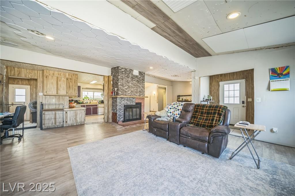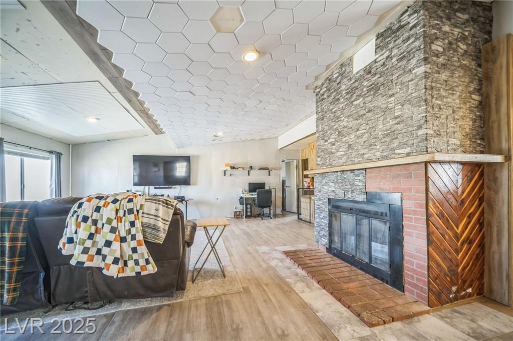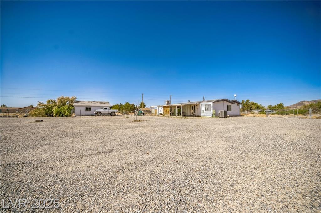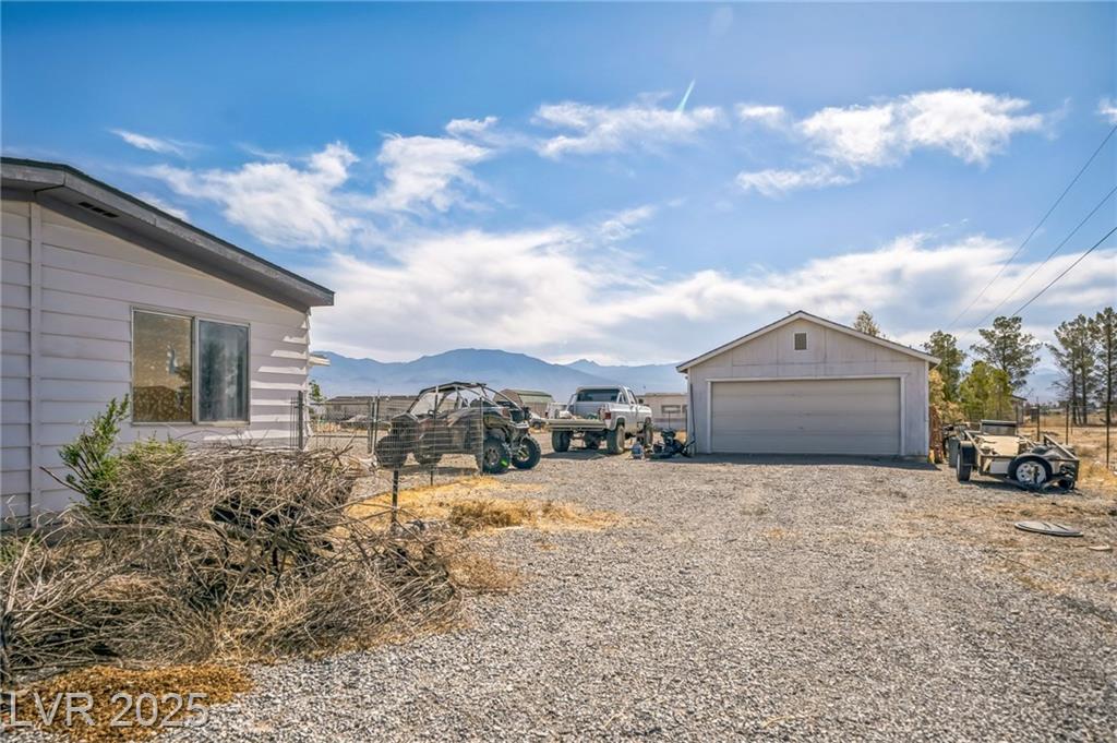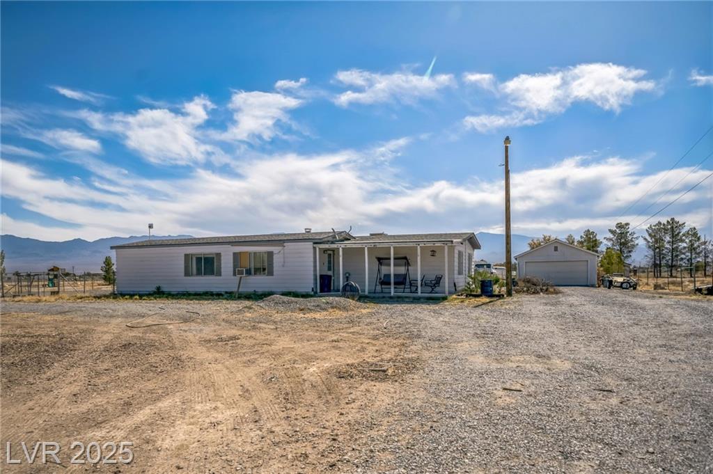 Welcome to this well-maintained 3-bedroom, 2-bathroom manufactured home offering 1,810 sq ft of comfortable living space. Situated on a generous 1.06-acre lot in northwest Pahrump. The inviting great room features a built-in fireplace and a wet bar, perfect for entertaining or relaxing evenings. The kitchen is equipped with abundant cabinetry, expansive counter space, built-in double ovens, a cooktop, dishwasher, and refrigerator—all included. A separate dining room adds to the home's functionality and charm. The primary suite boasts a large closet with mirrored doors and an en-suite bathroom featuring a garden tub and a separate walk-in shower. Additional highlights include a detached 2-car garage. The property's expansive lot offers endless possibilities for outdoor activities, gardening, or additional structures. Enjoy the tranquility of desert living with stunning mountain views, all while being conveniently located near local amenities.