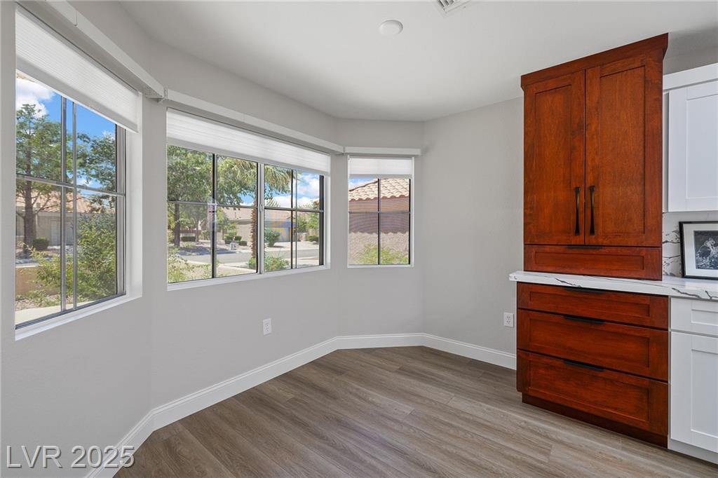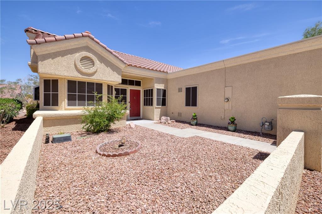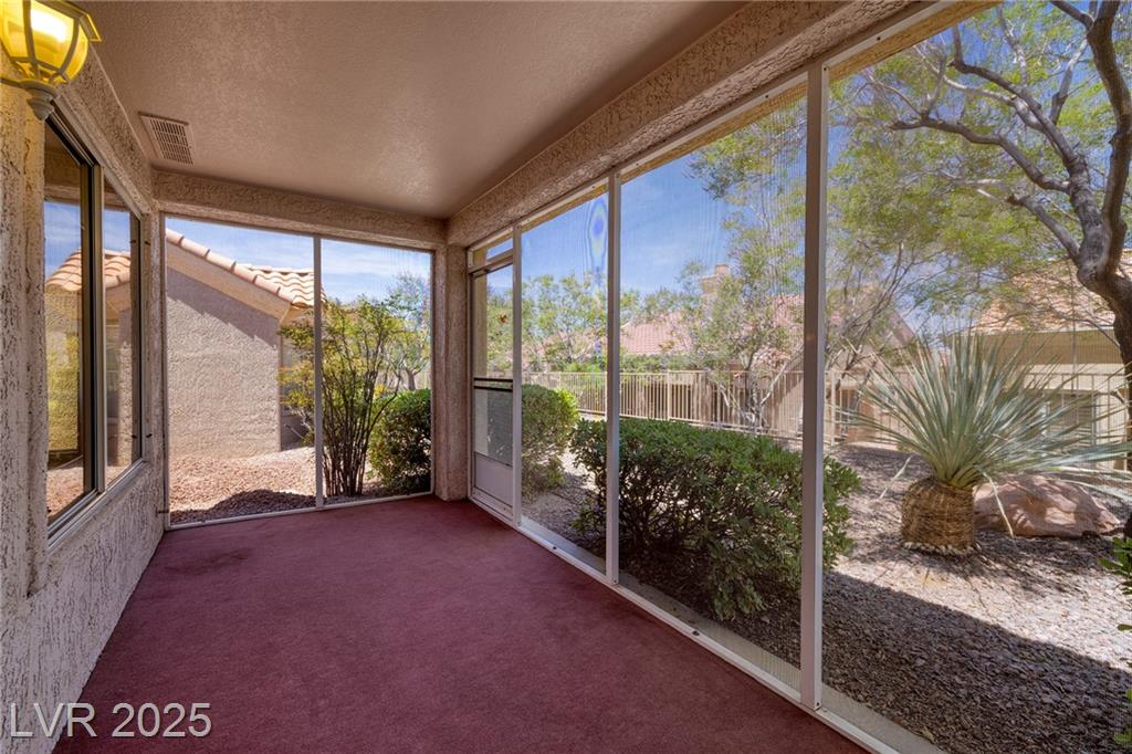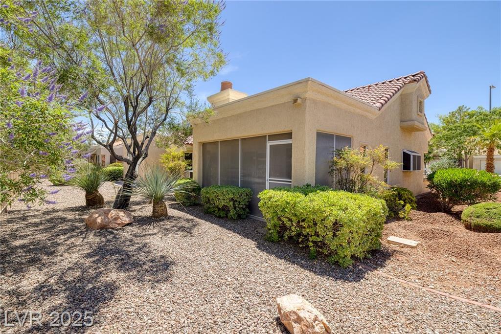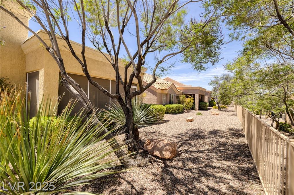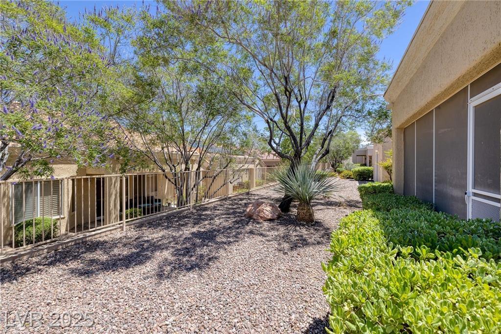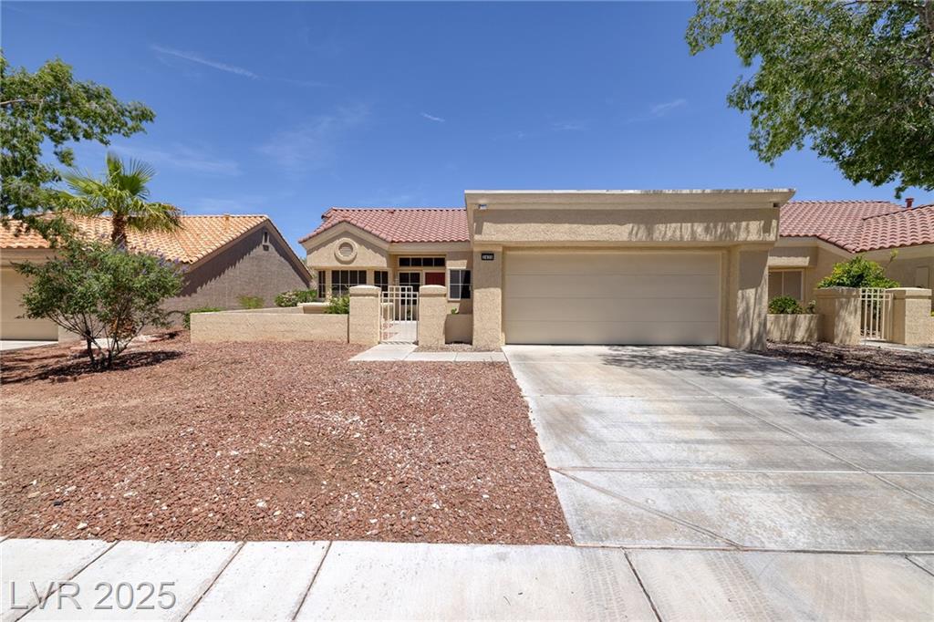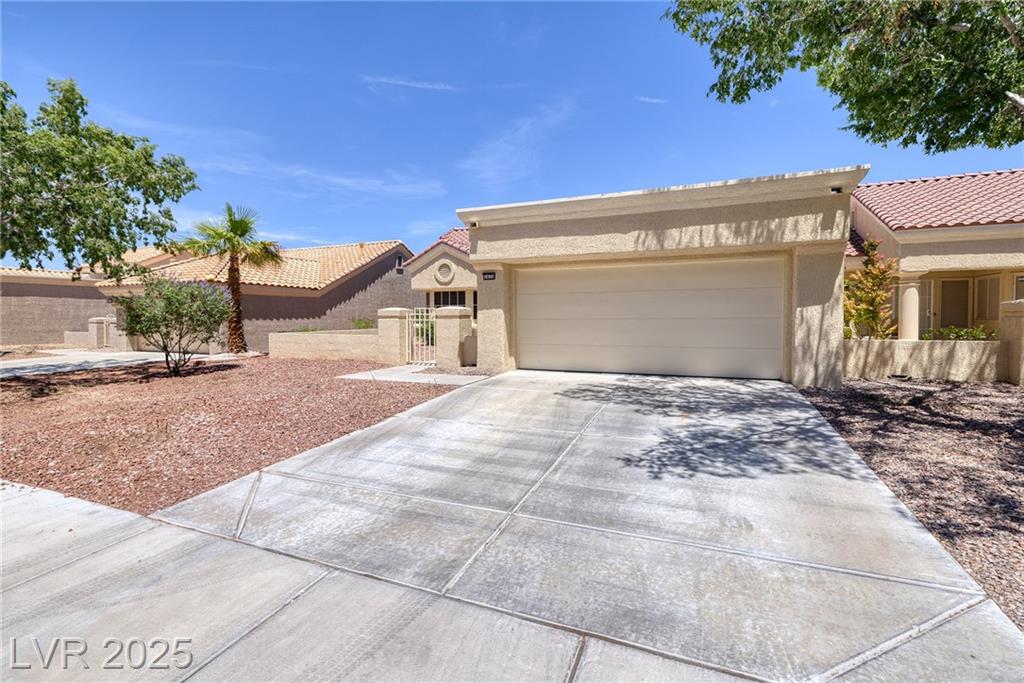 Freshly remodeled townhome in Sun City Summerlin ~ courtyard entry, 1359 SF, 2 bedrooms, 2 baths with an open main living area. Stylish neutral palate throughout ~ new paint, luxury vinyl plank flooring, baseboards and custom millwork touches truly set this home apart. Stunning kitchen with eating nook, custom two toned cabinetry, Quartz counters & SS appliances. Spacious living room features fireplace with custom surround and adjacent dining room with slider, providing views to the screened in back patio and backyard. Primary suite has vaulted ceiling, bay window, walk in closet with mirrored doors and en suite bath. Primary bath has dual sinks, updated shower with 3/4" glass front & Toto toilet. Second bedroom is currently used as an office/den & features a built in desk which can easily be converted back to a closet. AC replaced Dec 2022, remodel 2023, loads of storage in garage featuring cabinets, shelves and loft storage!