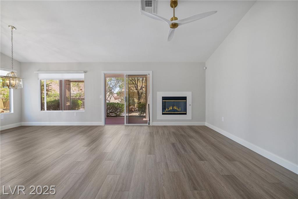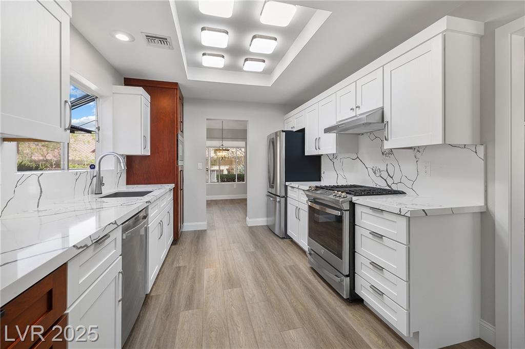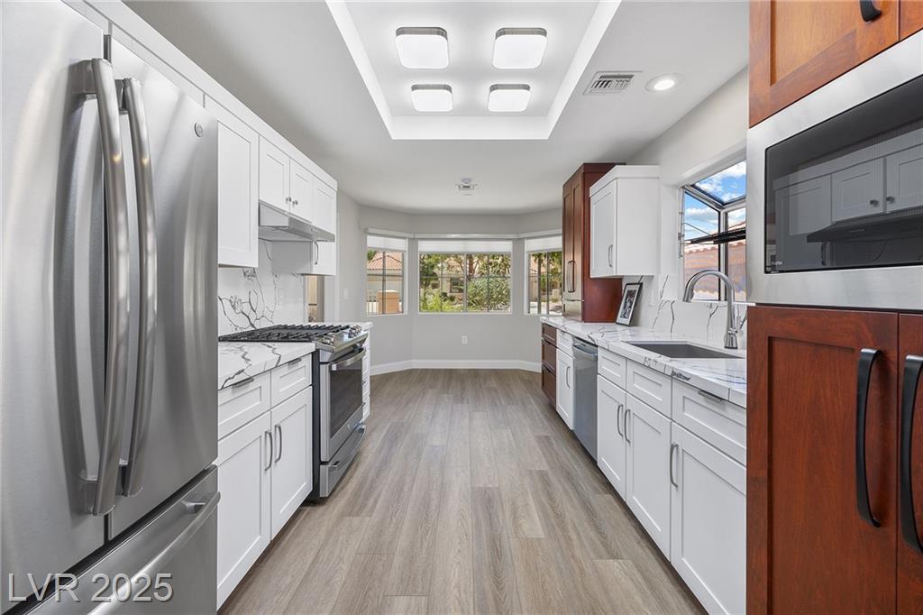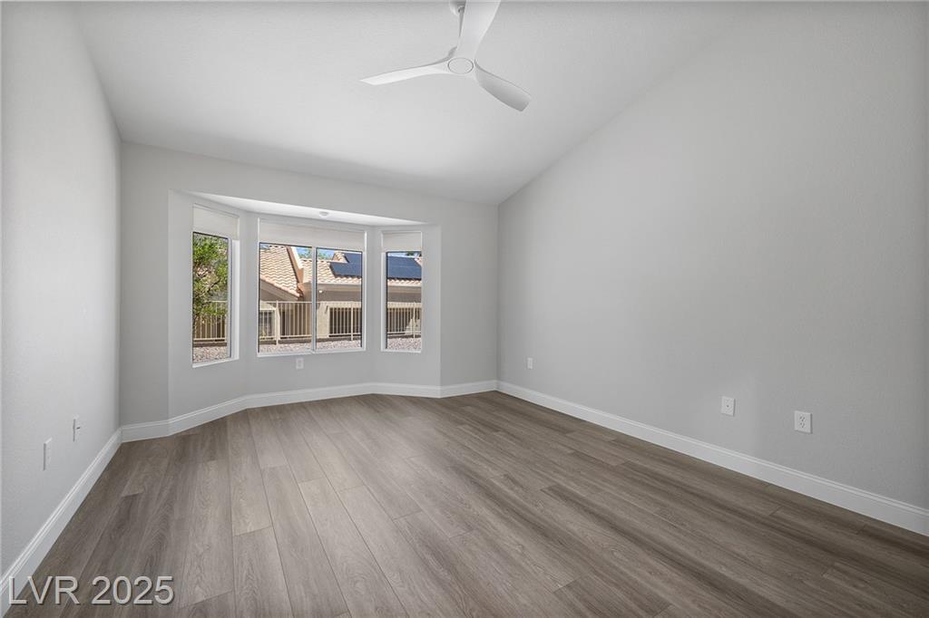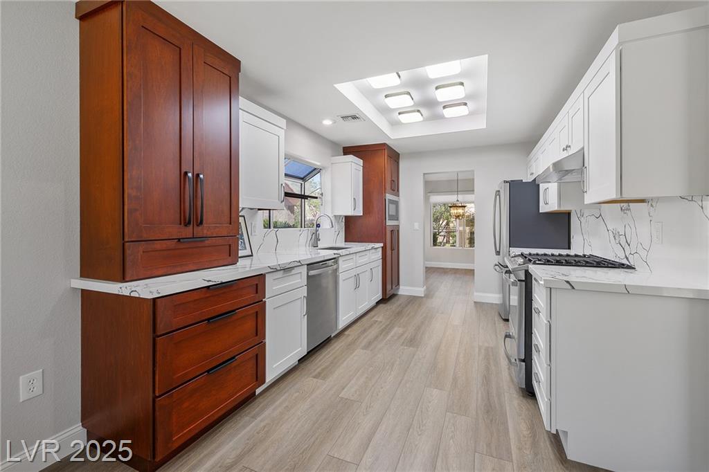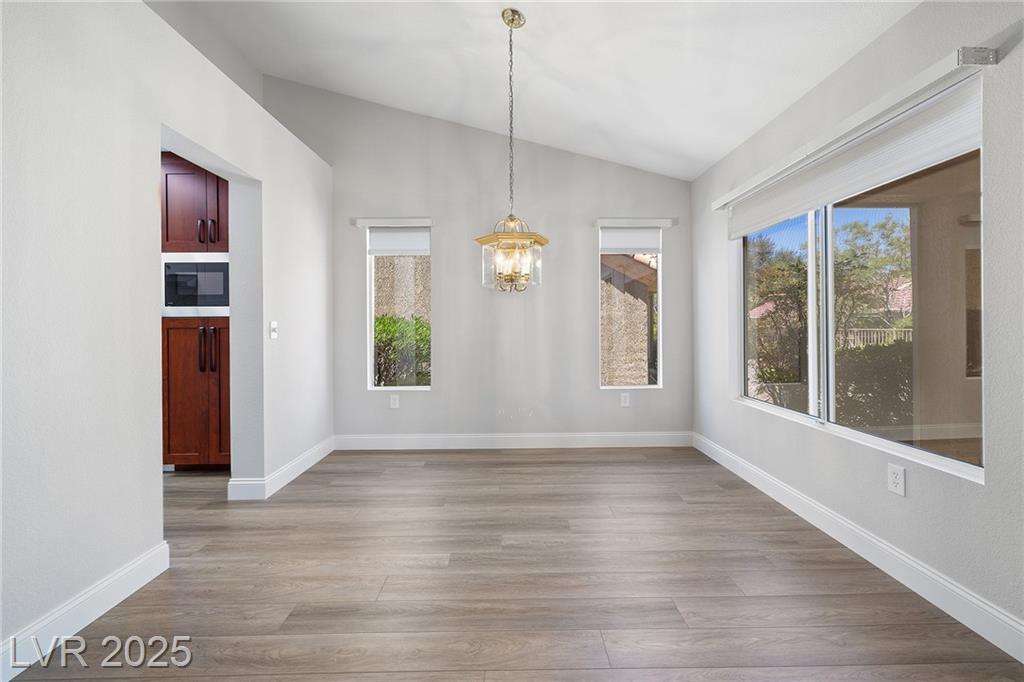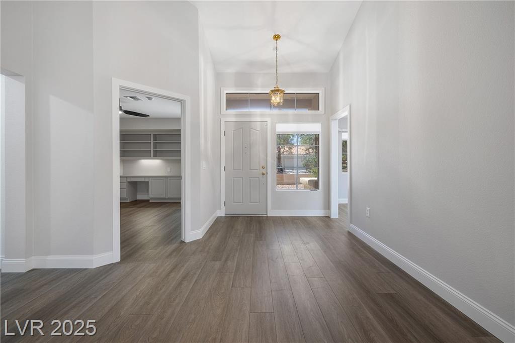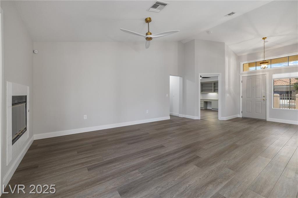 Freshly remodeled townhome in Sun City Summerlin ~ courtyard entry, 1359 SF, 2 bedrooms, 2 baths with an open main living area. Stylish neutral palate throughout ~ new paint, luxury vinyl plank flooring, baseboards and custom millwork touches truly set this home apart. Stunning kitchen with eating nook, custom two toned cabinetry, Quartz counters & SS appliances. Spacious living room features fireplace with custom surround and adjacent dining room with slider, providing views to the screened in back patio and backyard. Primary suite has vaulted ceiling, bay window, walk in closet with mirrored doors and en suite bath. Primary bath has dual sinks, updated shower with 3/4" glass front & Toto toilet. Second bedroom is currently used as an office/den & features a built in desk which can easily be converted back to a closet. AC replaced Dec 2022, remodel 2023, loads of storage in garage featuring cabinets, shelves and loft storage!