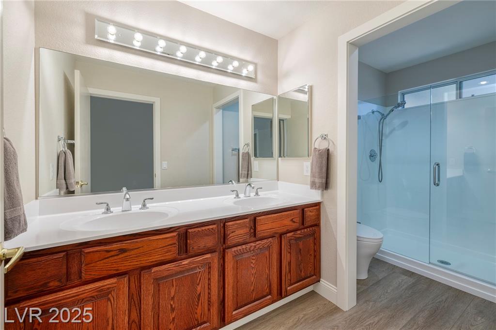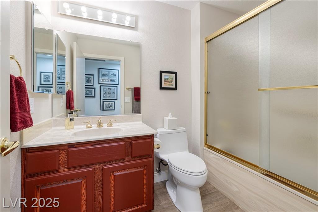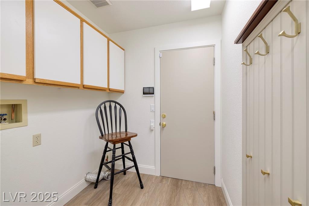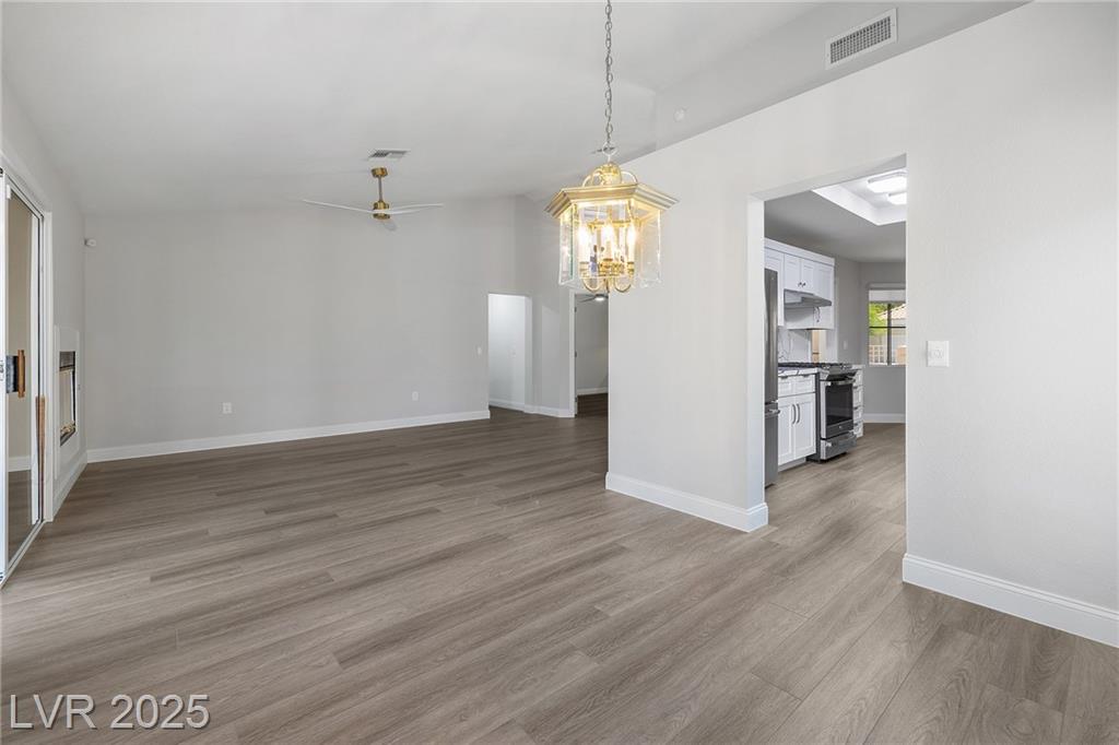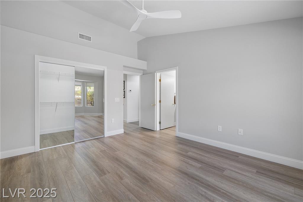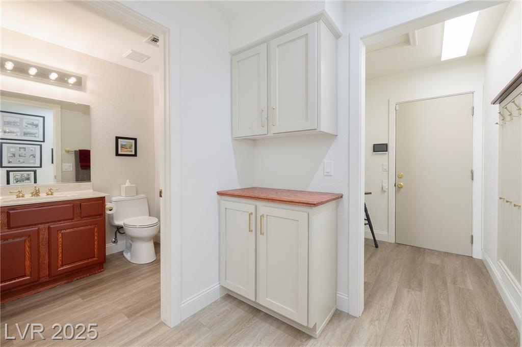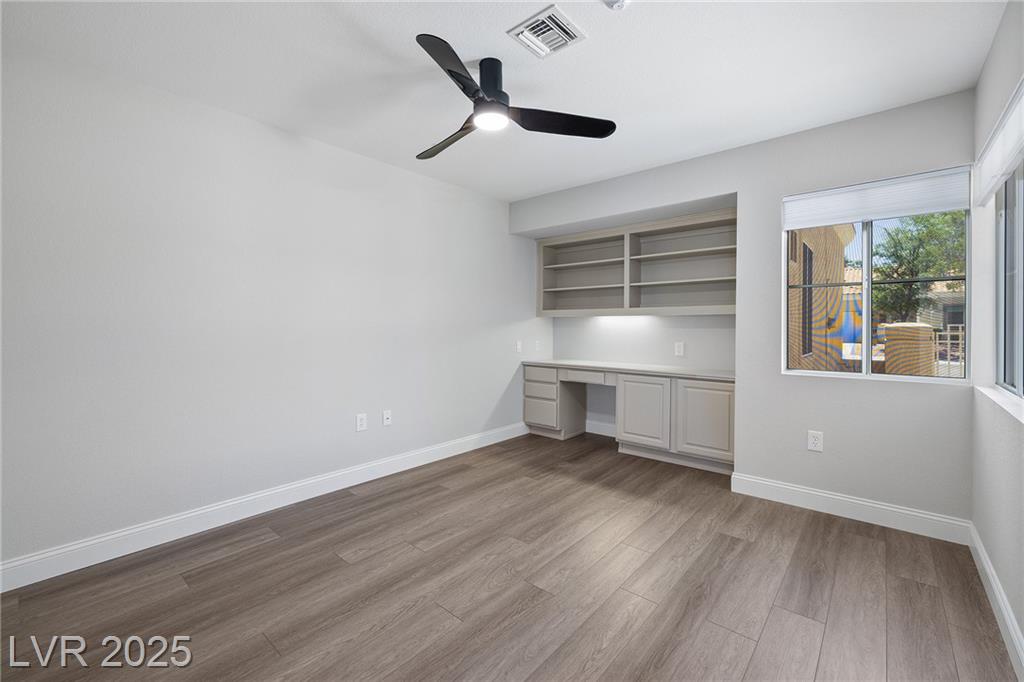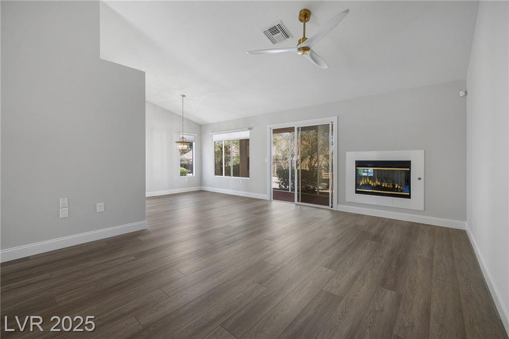 Freshly remodeled townhome in Sun City Summerlin ~ courtyard entry, 1359 SF, 2 bedrooms, 2 baths with an open main living area. Stylish neutral palate throughout ~ new paint, luxury vinyl plank flooring, baseboards and custom millwork touches truly set this home apart. Stunning kitchen with eating nook, custom two toned cabinetry, Quartz counters & SS appliances. Spacious living room features fireplace with custom surround and adjacent dining room with slider, providing views to the screened in back patio and backyard. Primary suite has vaulted ceiling, bay window, walk in closet with mirrored doors and en suite bath. Primary bath has dual sinks, updated shower with 3/4" glass front & Toto toilet. Second bedroom is currently used as an office/den & features a built in desk which can easily be converted back to a closet. AC replaced Dec 2022, remodel 2023, loads of storage in garage featuring cabinets, shelves and loft storage!
