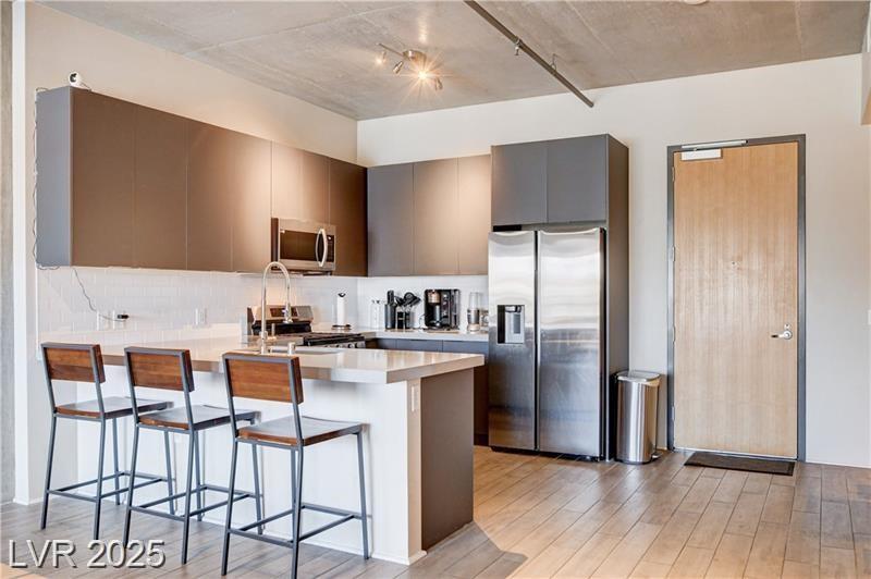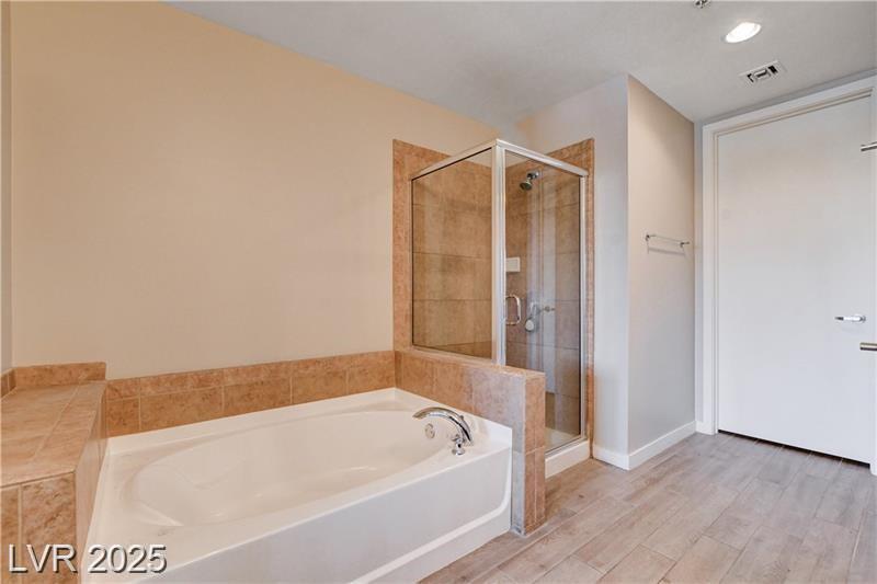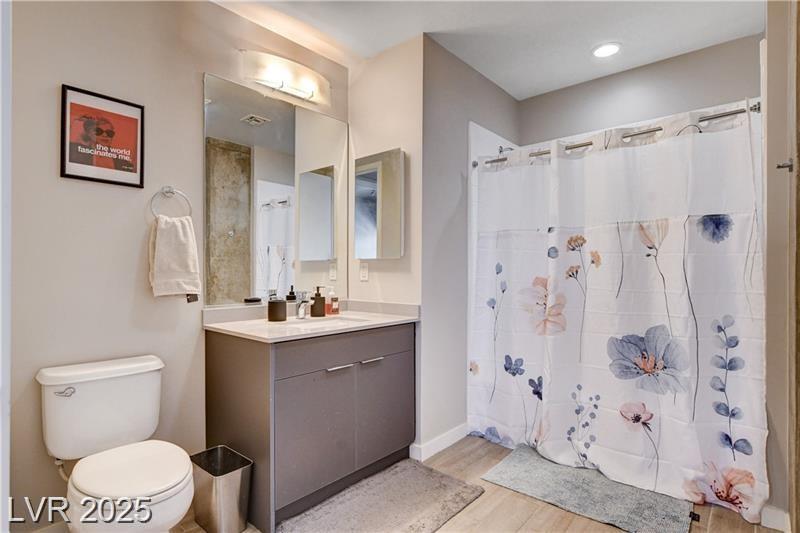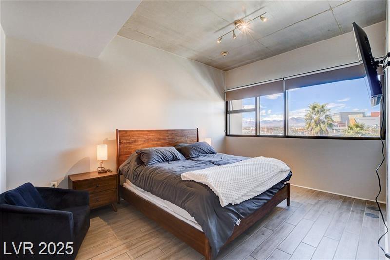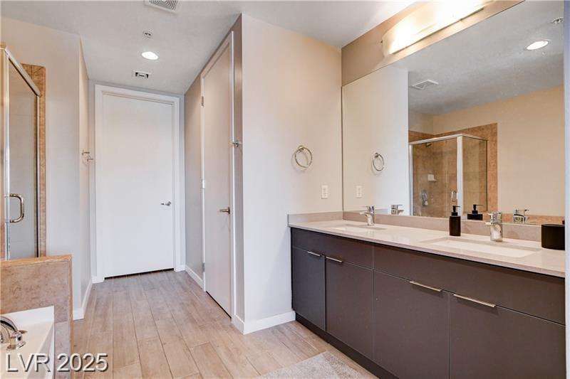 Stylish Luxury High Rise Condo centrally located in Downtown Las Vegas. This condo is located on the 5th floor and has one bedroom plus den/office area and two bathrooms. Recent upgrades include wood plank flooring throughout, quartz countertops, stainless steel appliances, fresh paint, and new furniture. The primary bedroom includes a walk-in closet and an on-suite bathroom that features an oversized tub and walk in shower. Living room is spacious with floor to ceiling windows and designed with an open concept to the kitchen. The den can be used as an office area or just additional lounging for reading and relaxing.This community features amazing amenities such as pool, spa, outdoor grilling, poolside cabanas, 2 story fitness center, and picturesque wine deck with views all across the valley. 24/7 security and front desk service, cell phone/bluetooth access to private parking garage, building, and amenities.