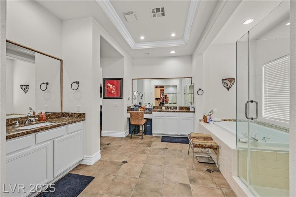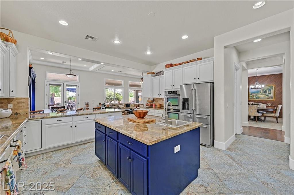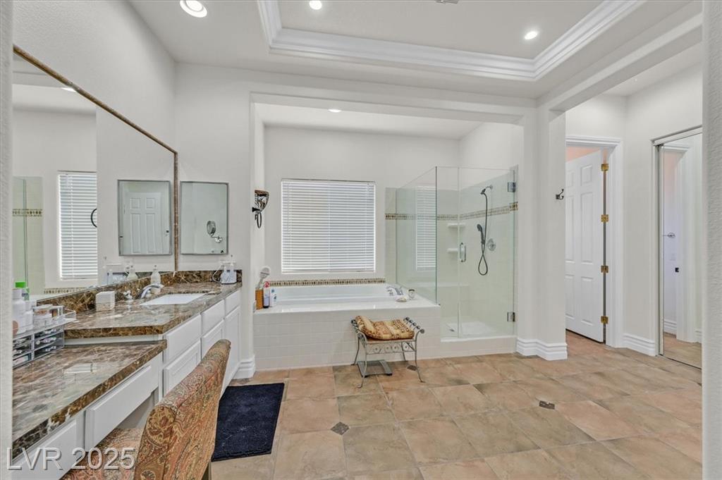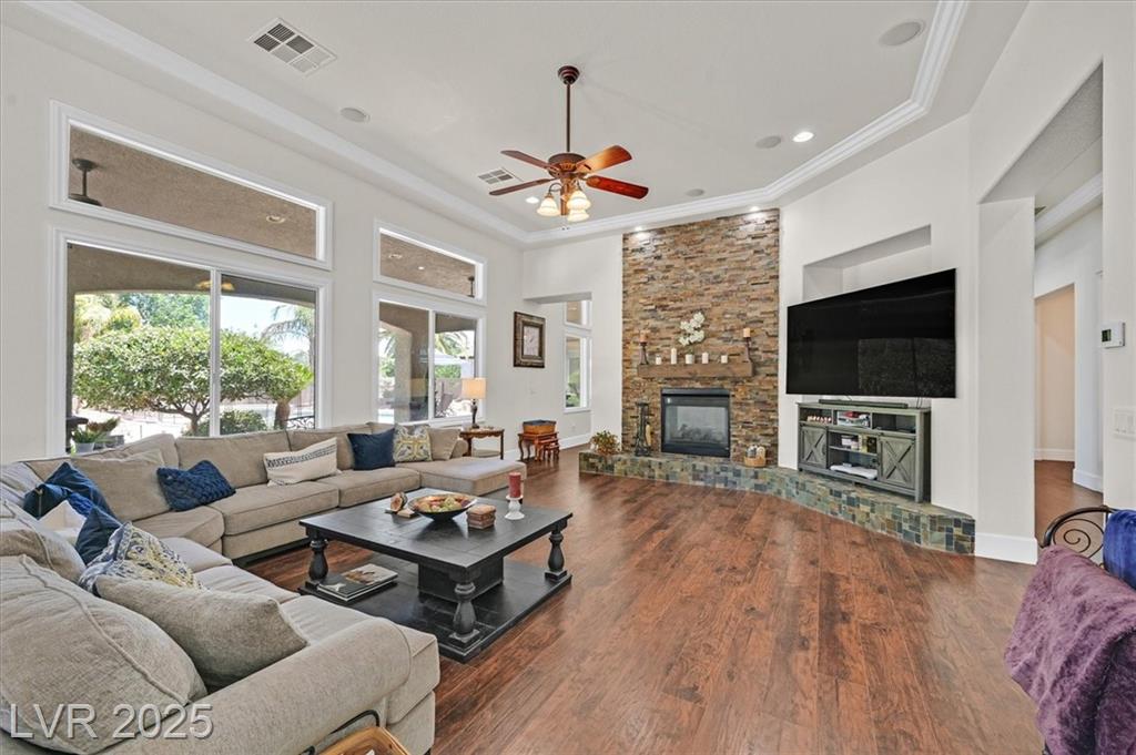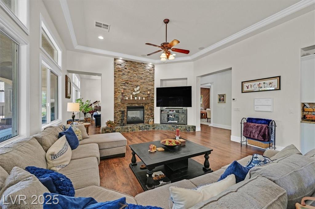 Elegant 4,036 SF Toll Brothers single-story in gated Toscana, nestled on nearly ½ acre with mountain views and no rear neighbors. Features 3 spacious bedrooms, 3.5 baths, and a den with attached bath—perfect as a 4th bedroom, office, or playroom. Bright, open floor plan with soaring ceilings, crown molding, oversized rooms, and a custom closet in the primary suite. Chef’s kitchen includes large island with vegetable sink, walk-in pantry, butler’s counter, and refreshed navy-blue cabinetry. Energy-efficient solar panels installed. Double gated spacious RV parking fits recreational toys, and/or two 45-ft RVs with electrical hookup. Oversized 3-car garage offers built-in workspace. Resort-style backyard with sparkling pool, built-in BBQ, and covered patio—ideal for entertaining or relaxing. Lush landscaping and a welcoming courtyard complete this stunning home in one of the northwest’s most desirable communities.