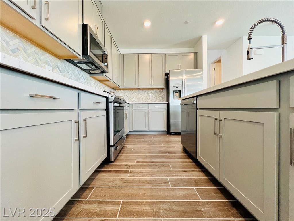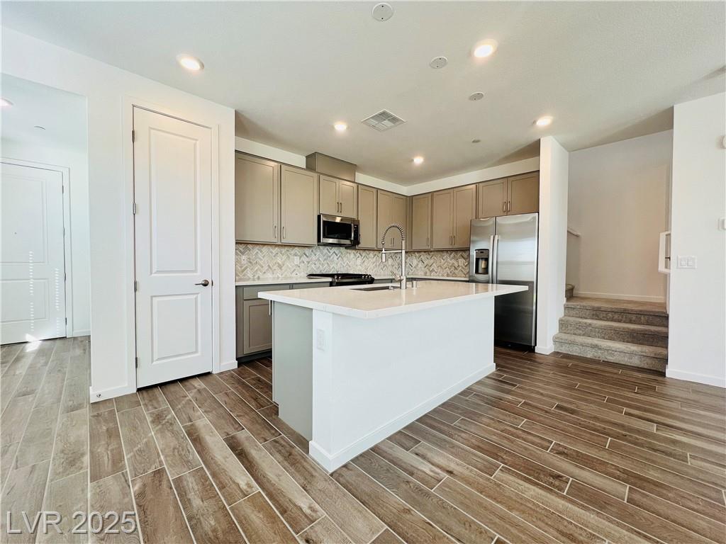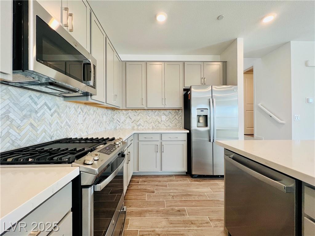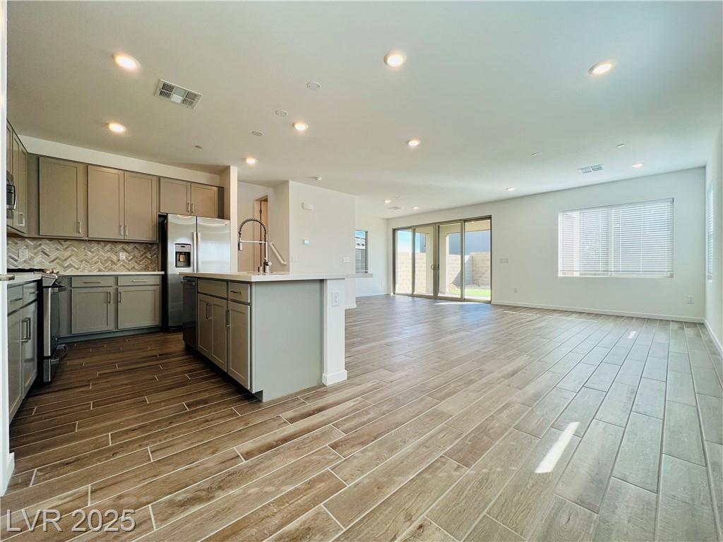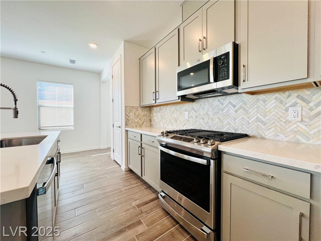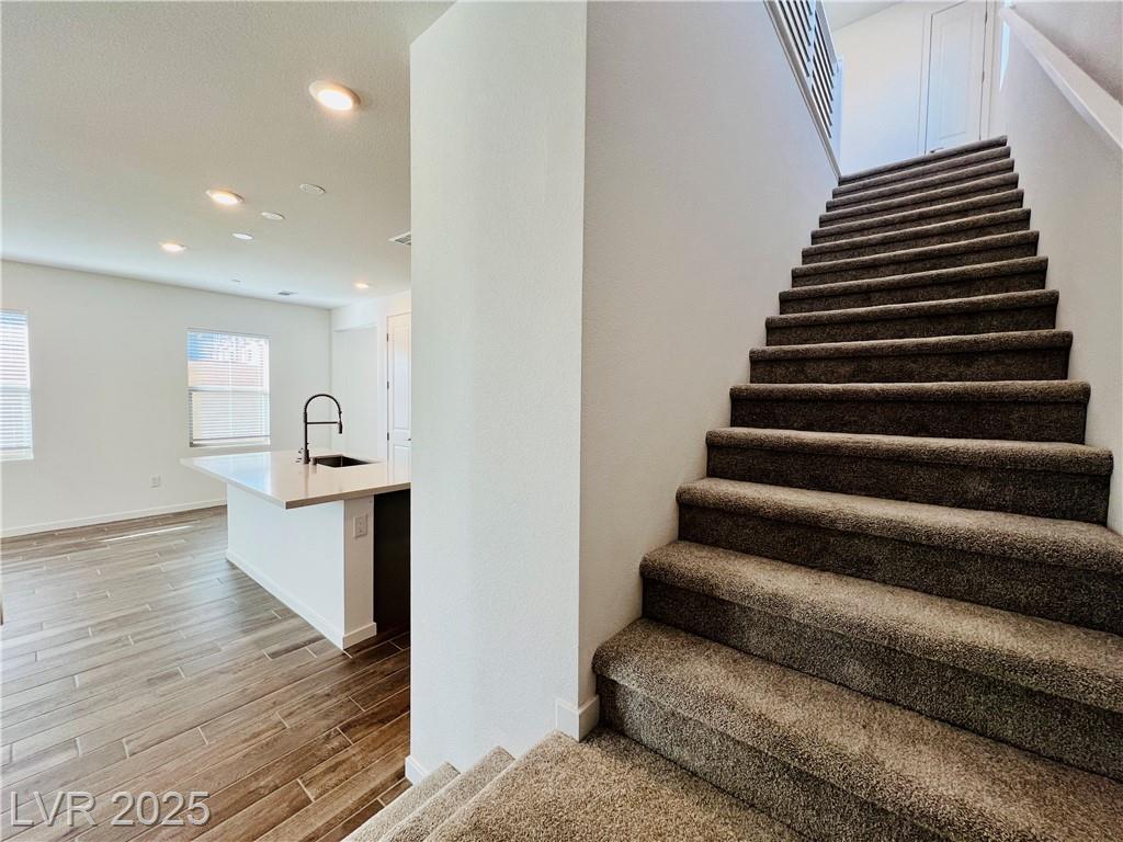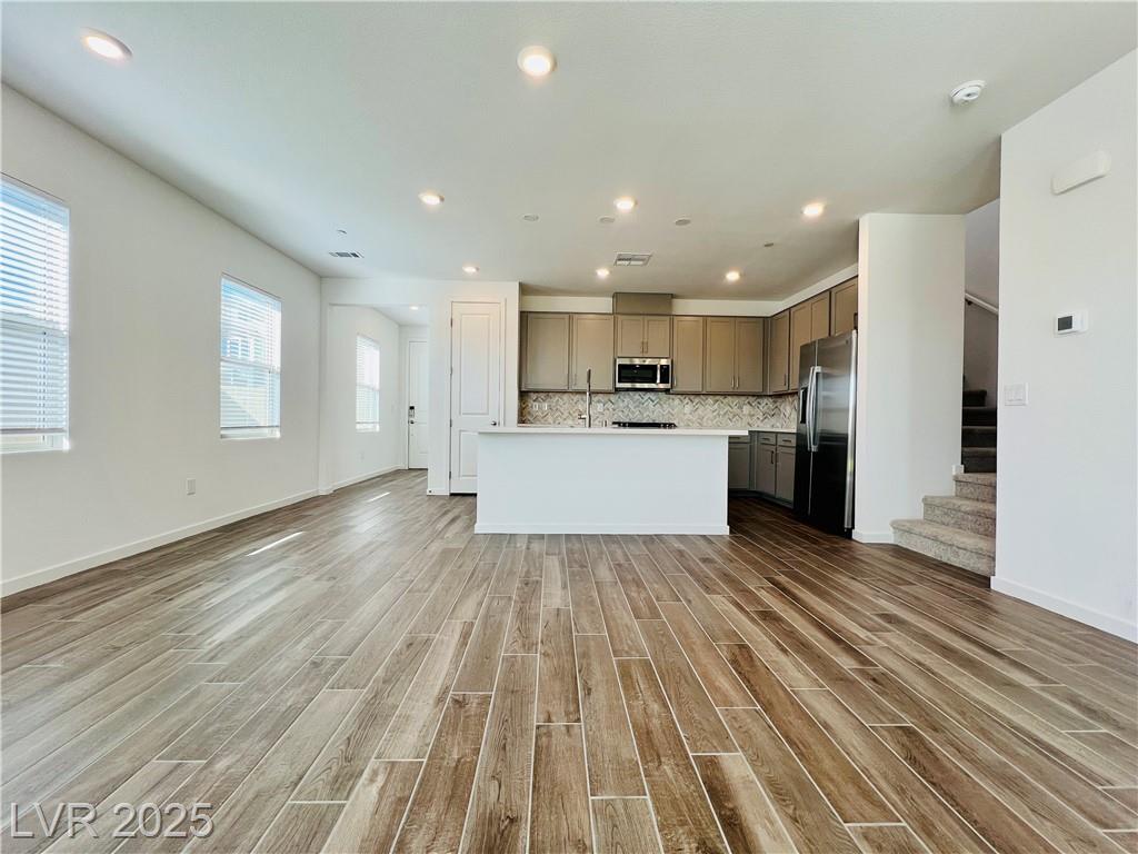 Stunning 4-bedroom, 2.5-bathroom home with a loft, located in the vibrant city of Summerlin. This brand-new build is a must-see, a desirable feature. Step inside to discover a spacious, inviting living area with recessed lights that create a warm and welcoming ambiance. The kitchen is a chef's dream, equipped with sleek stainless steel appliances that elevate your cooking experience. Enjoy the convenience of a sliding patio door that leads to a covered patio, perfect for outdoor entertaining or simply enjoying the fresh air. The back deck features beautiful pavers, adding a touch of elegance to your outdoor space. The 2.5-inch faux wood blinds provide privacy and style throughout the home. A loft upstairs offers plenty of room for a home office and play area. This home is ideally situated near shopping and dining options, ensuring you have everything you need within reach. Please NOTE-(Rent Includes: Rent $3900, Trash $24, Sewer $26, Landscape $100)