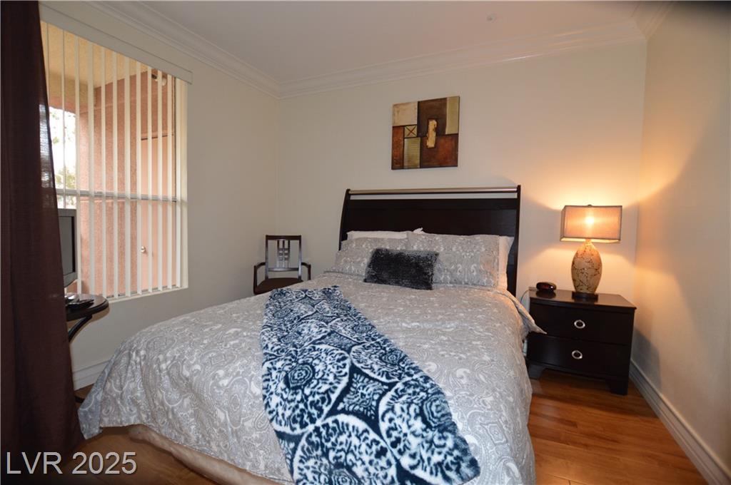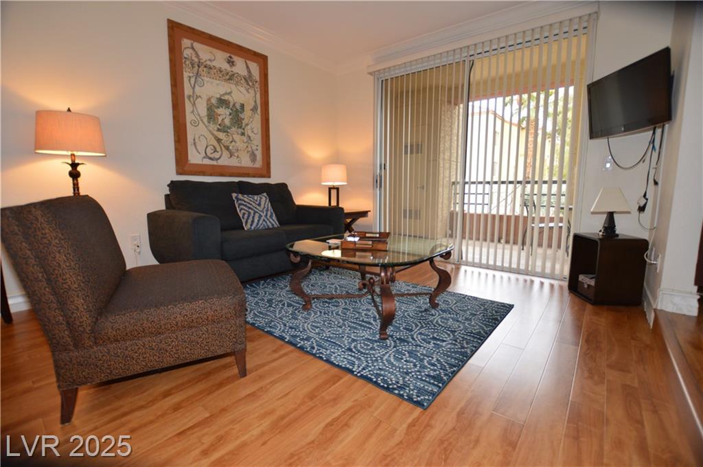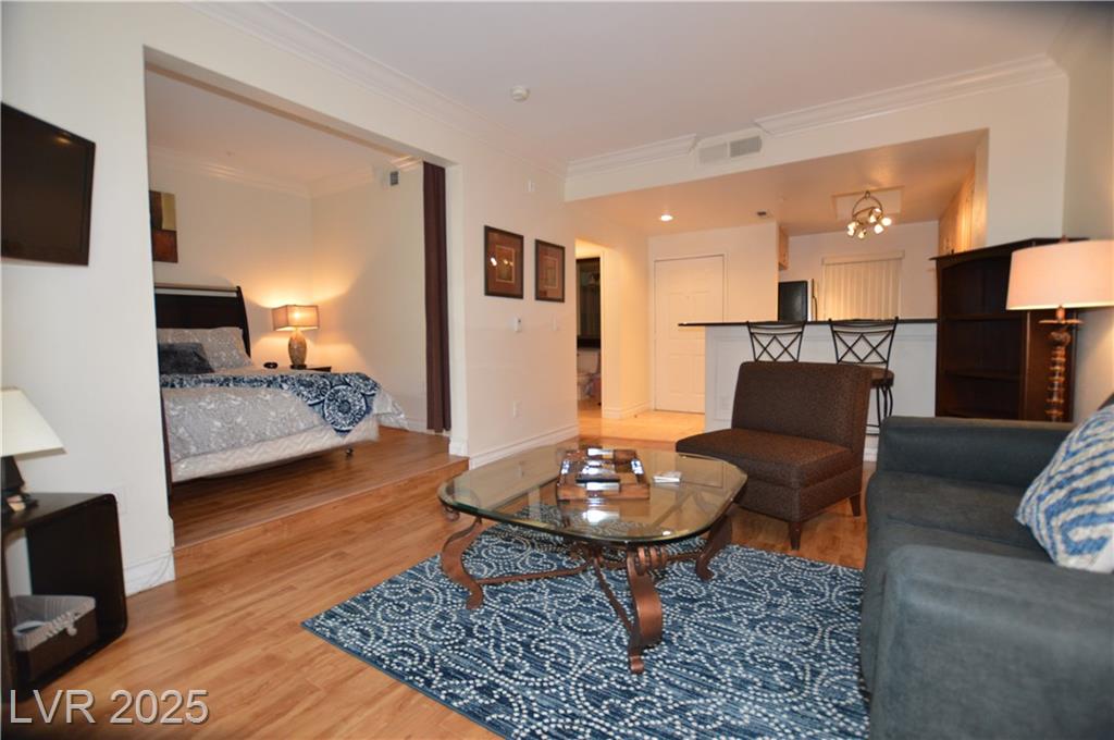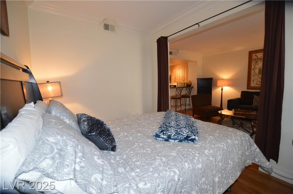 Fully Furnished Luxury L Shaped Studio Condo with Full size Queen Bed & Furnishings in separate step up sleeping alcove.Unit features laminate wood flooring throughout bedroom and closet area, and new couch in living room area. Located in 16 Acre Lushly Landscaped Property Just 1 1/2 Blocks from Main Vegas Strip, unit is equipped with granite counter tops, stainless steel Refrigerator, Range, Microwave and Dishwasher appliances.