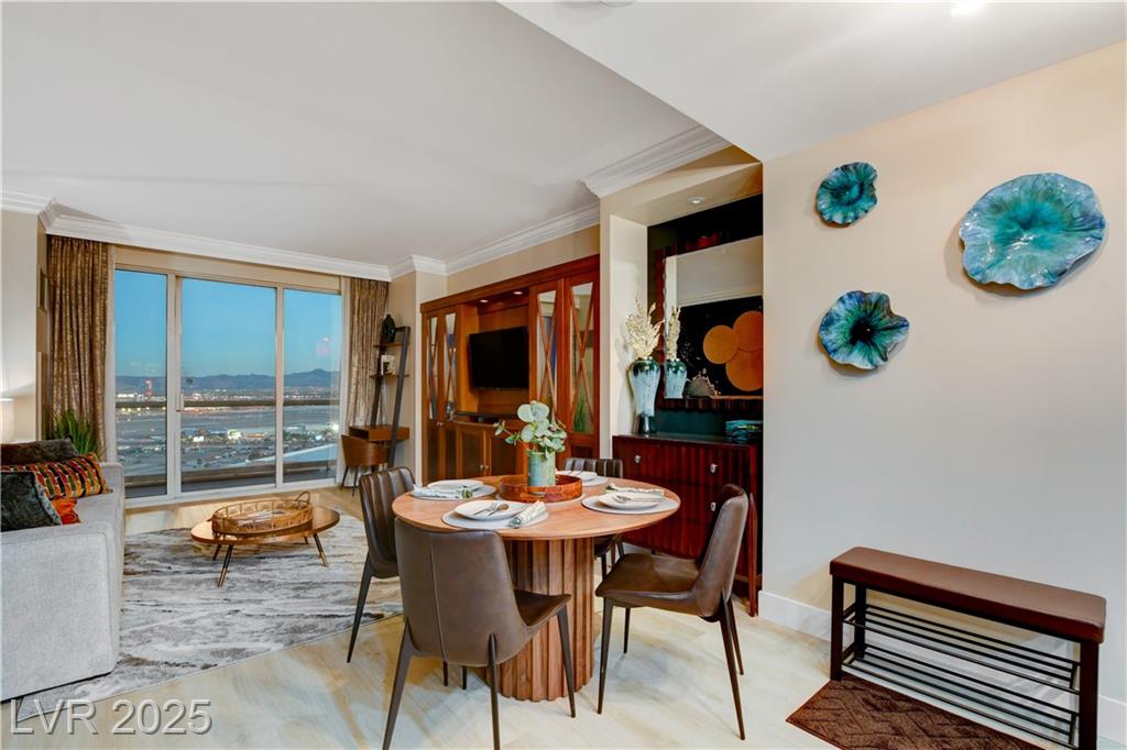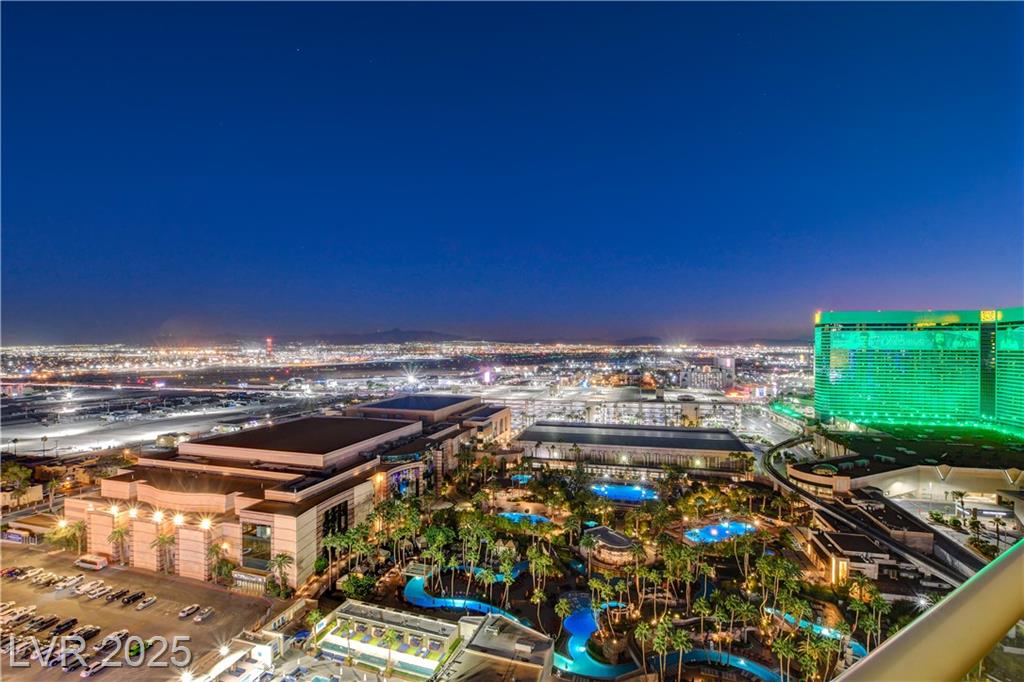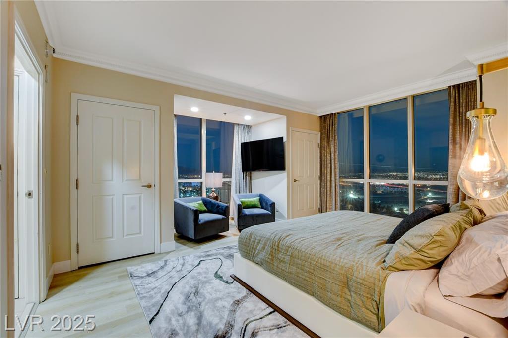 Beautifully RENOVATED 1-bedroom, 2-bathroom condo offers an unparalleled blend of luxury, comfort, and convenience in a prestigious high-rise setting. Overlooking the MGM Grand pool and partial view of MGM Grand. This unit features vinyl plank flooring, custom paint, and modern light fixtures. Offers breathtaking view of the Sphere from the secondary glass window. The ensuite bathroom boasts a luxurious spa-like experience, complete with a soaking tub, separate shower, and dual vanity sinks. INCOME PRODUCING LICENSED VACATION RENTAL. Definitely a must see!