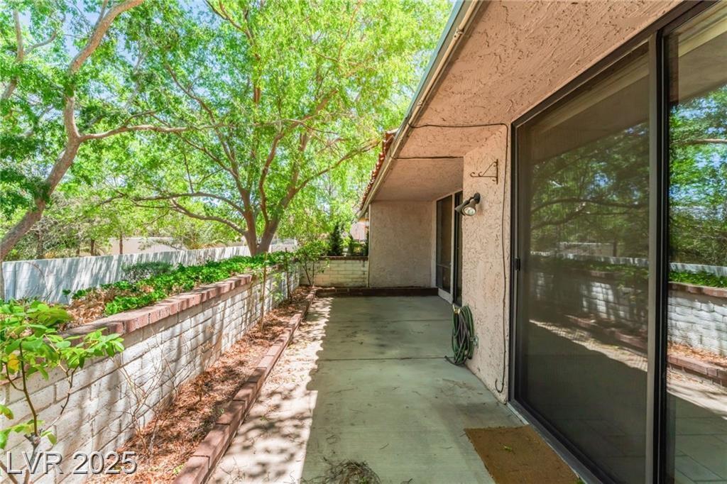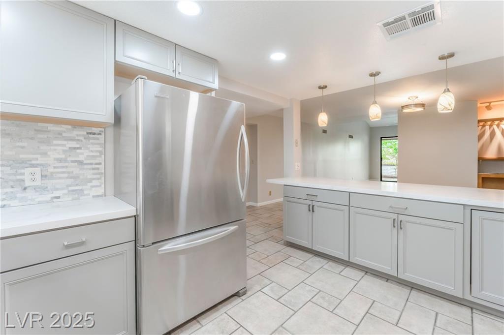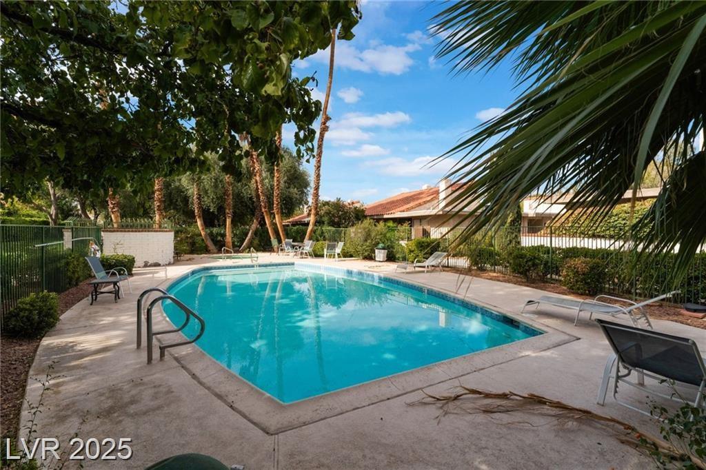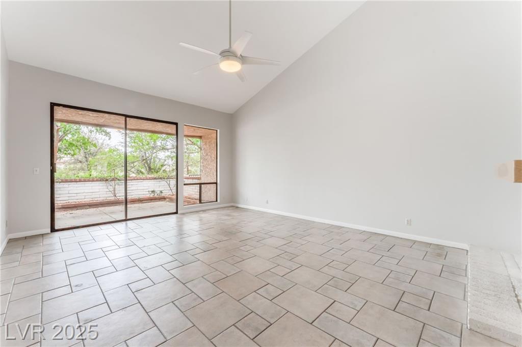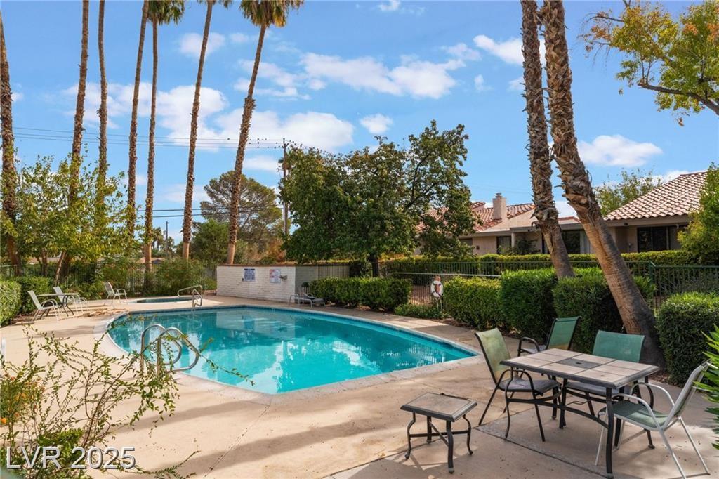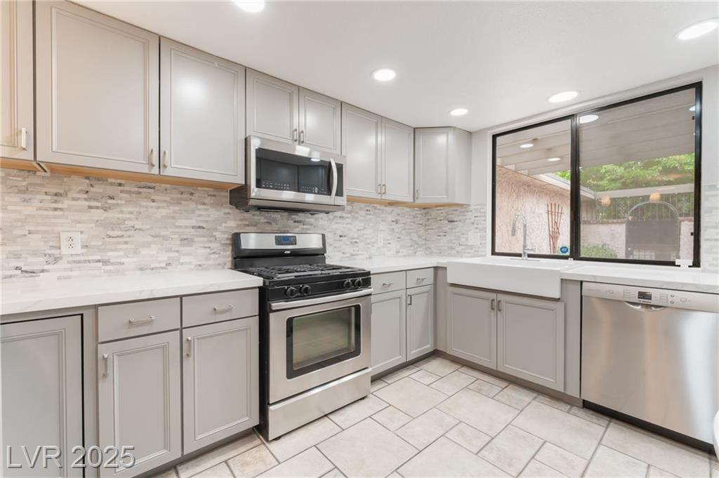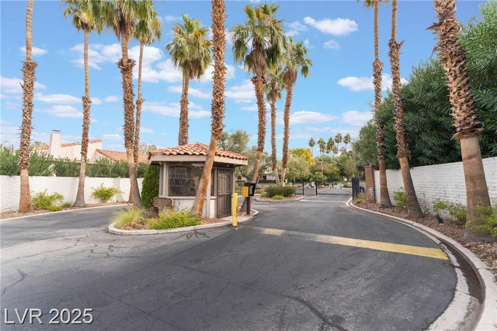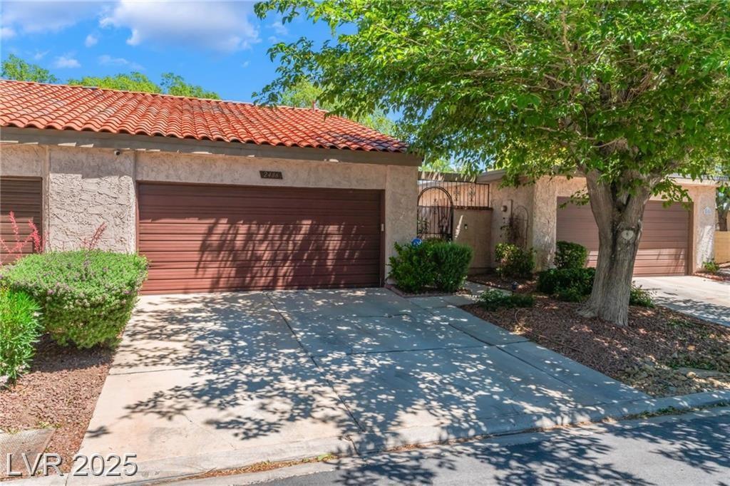 Step into this stunningly upgraded single story townhome in the desirable gated Sunrise Villas community. With vaulted ceilings and fresh interior paint, this bright and open home features sleek quartz countertops, custom cabinetry, a designer farm sink, chic pendant and recessed lighting, tile flooring, ceiling fans, and a fully remodeled custom shower. The stainless steel refrigerator, microwave, and dishwasher are included. Enjoy indoor outdoor living with a peaceful covered patio, lush greenery, a charming garden window, and a private gated courtyard. The spacious garage provides extra storage, and the location offers easy access to the Strip, parks, schools, shopping, and dining. This beautifully maintained property blends modern style, comfort, and convenience in one of the most sought after neighborhoods.