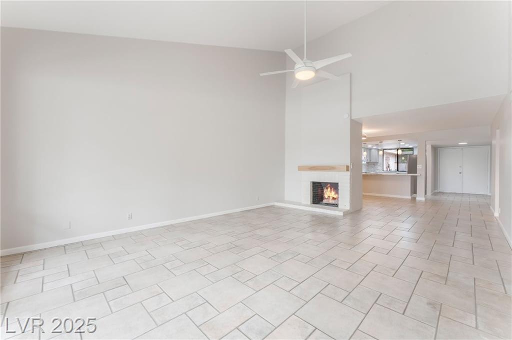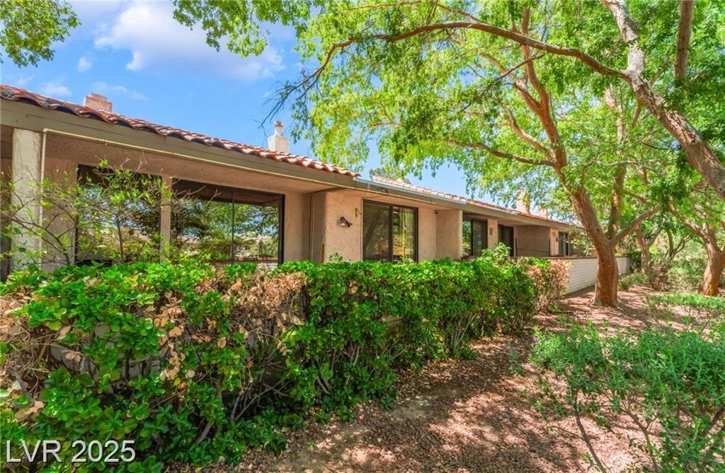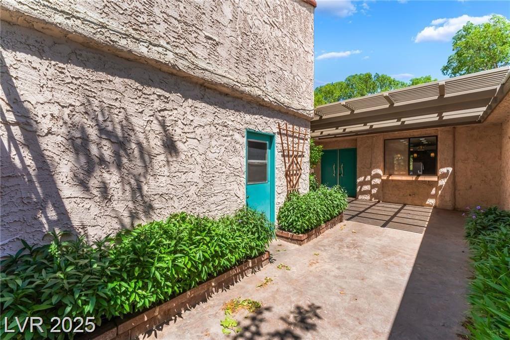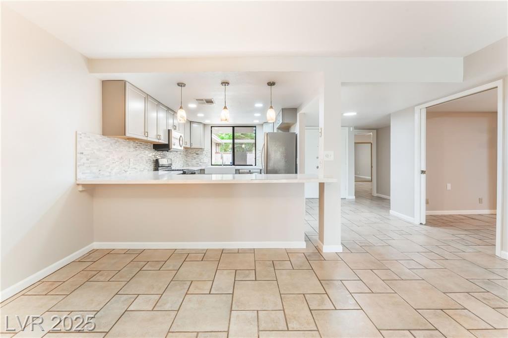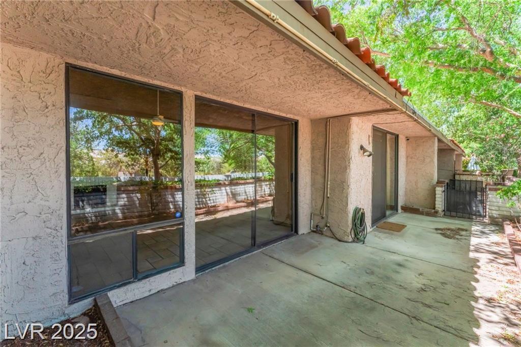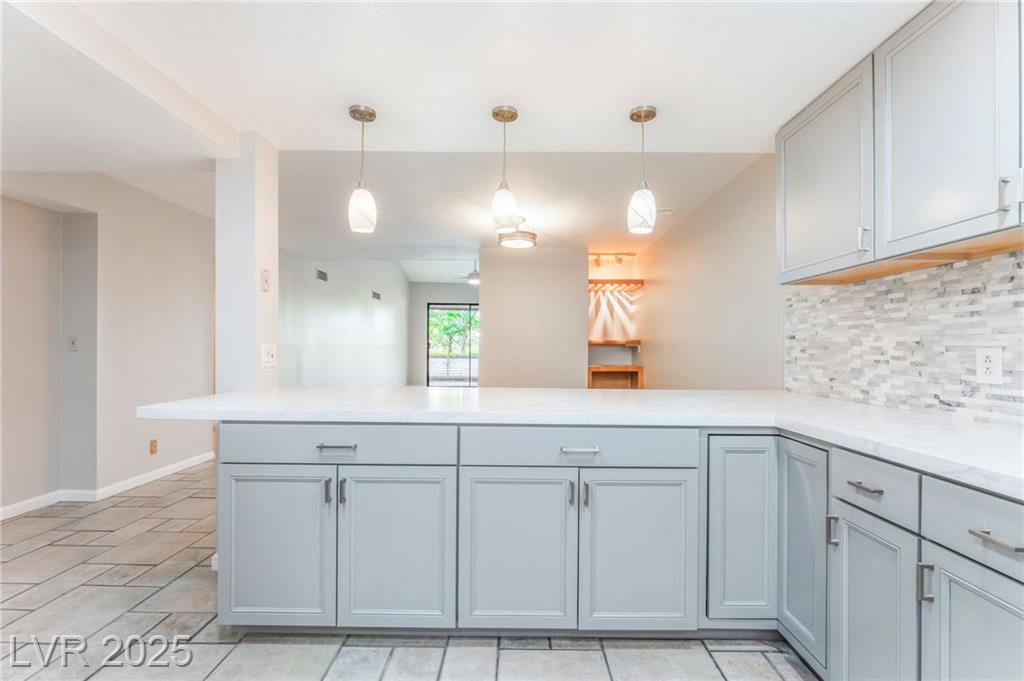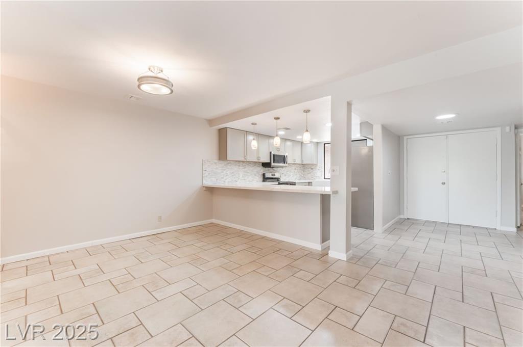 Step into this stunningly upgraded single story townhome in the desirable gated Sunrise Villas community. With vaulted ceilings and fresh interior paint, this bright and open home features sleek quartz countertops, custom cabinetry, a designer farm sink, chic pendant and recessed lighting, tile flooring, ceiling fans, and a fully remodeled custom shower. The stainless steel refrigerator, microwave, and dishwasher are included. Enjoy indoor outdoor living with a peaceful covered patio, lush greenery, a charming garden window, and a private gated courtyard. The spacious garage provides extra storage, and the location offers easy access to the Strip, parks, schools, shopping, and dining. This beautifully maintained property blends modern style, comfort, and convenience in one of the most sought after neighborhoods.