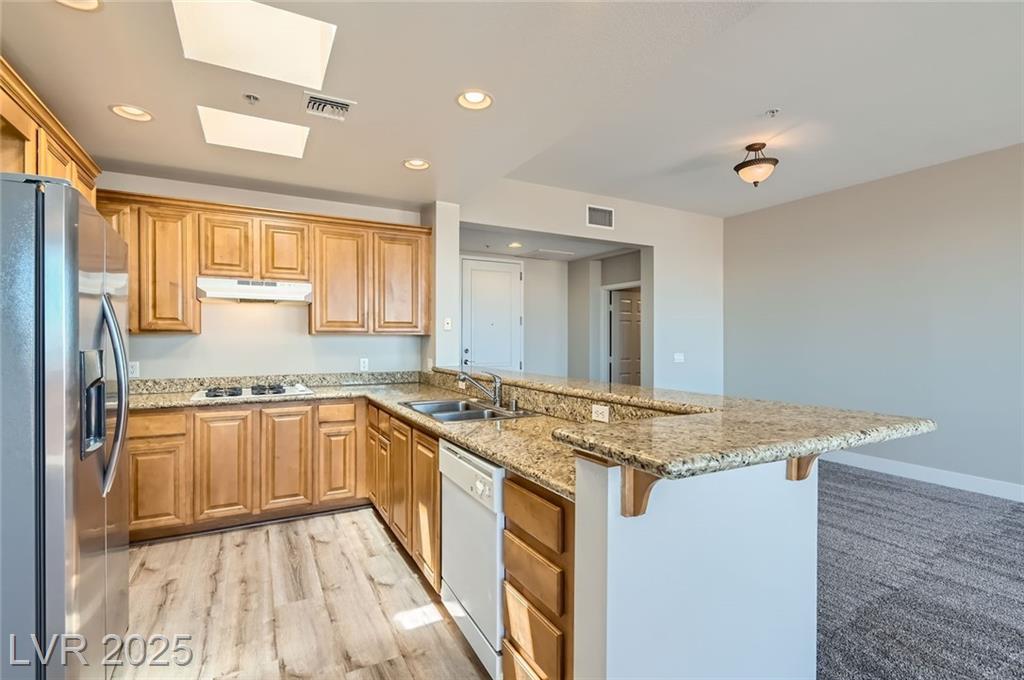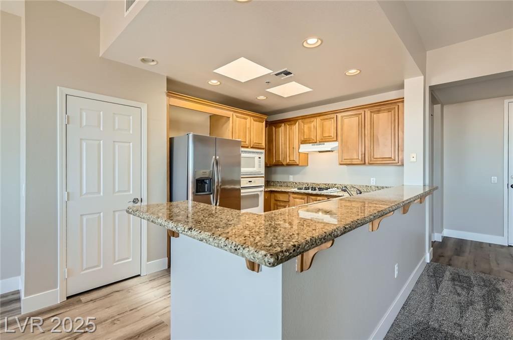 This beautiful 5th-floor condominium blends comfort, style, and stunning views. It features two spacious primary bedrooms, each with a walk-in closet and private bath, offering both luxury and convenience. There are three bathrooms in total, perfect for residents and guests. Enjoy two private balconies — one off a primary bedroom with mountain views, and the other off the family room and breakfast nook, with city views. The condo has all-new flooring, including carpet and vinyl plank, plus fresh paint throughout. Skylights and ceiling fans add to the charm. Additional features include a private 1-car garage and an assigned underground parking space, making this condo a truly exceptional home.