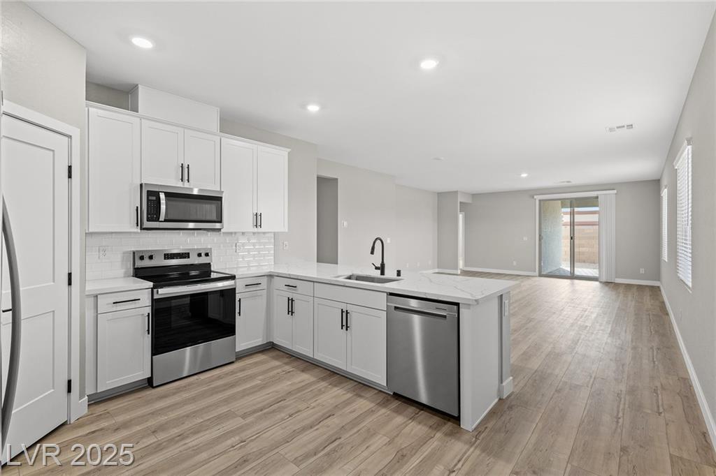 Boasting with charm, this stunning new-construction home is now available at Cheyenne Valle where homeowners can enjoy a beautiful community with charming amenities. This one-story, four-bedroom, two-bathroom home provides all the space with a desirable layout, including designer finishes all throughout. The large living area offers plenty of room for family gatherings, while the kitchen provides ample counter space and upgraded, modern appliances, making cooking and meal prep a breeze. The dining room flows directly into both the living area and kitchen, creating a natural gathering spot for meals and socializing. Through the living room, you will find yourself at a charming, covered patio, perfect for enjoying the outdoors year-round. With high-end finishes throughout the home, the Ruby floor plan is the perfect space for you.