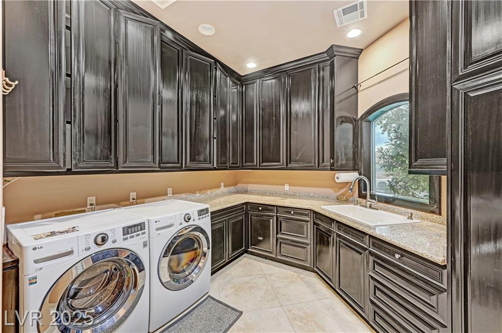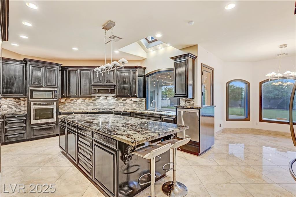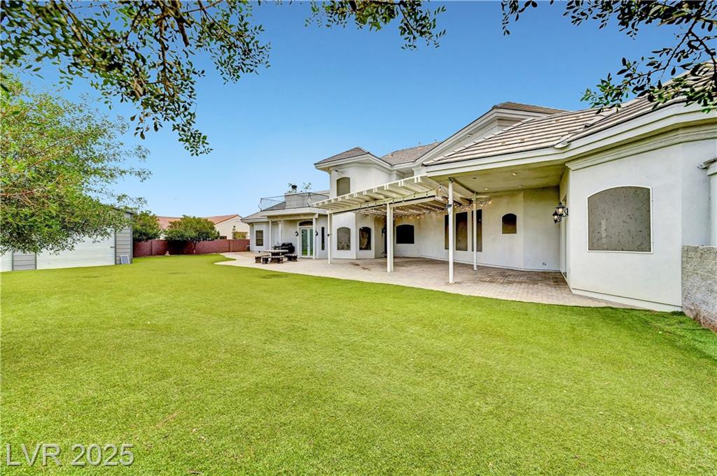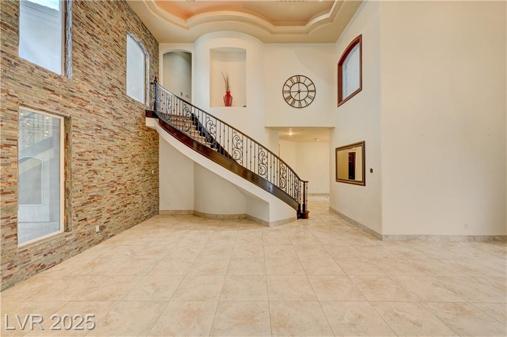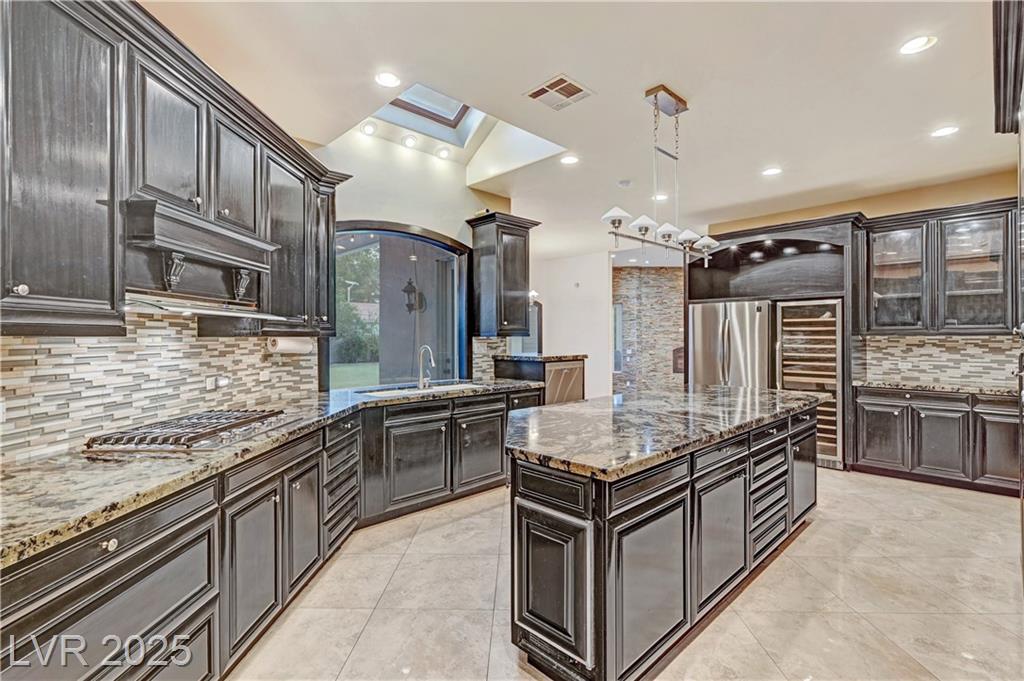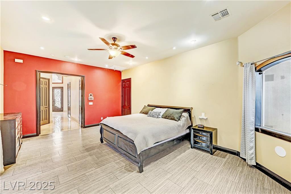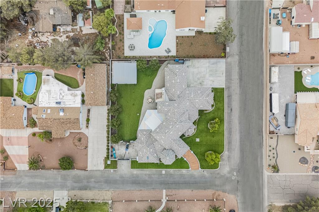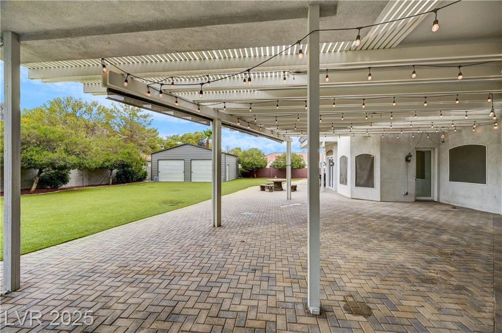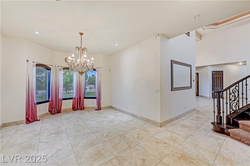 This one-of-a-kind custom Las Vegas estate offers rare privacy, space, and character on a 0.5+ acre corner lot with no HOA or SID. Boasting 4,711 sq ft, this 2-story home features a grand entry with 8-ft wrought iron doors, soaring ceilings, rich wood cabinetry, polished travertine flooring, and abundant natural light. The entertainer’s kitchen includes granite counters and custom finishes, while a loft and home theater add flexibility. The main-level primary suite offers a fireplace, spa-like bath, and backyard access. Enjoy low-maintenance outdoor living with turf landscaping, paver patios, and a pergola. Car lovers will appreciate the detached workshop with a lift, plus a 3-car garage and gated RV/utility parking. Additional features include a central vac, septic system, city water, and gas/electric service. Truly a unique opportunity just minutes from Las Vegas strip, Raiders Stadium, Knights Hockey Arena, and so much more! Schedule your private showing today!