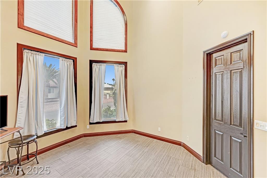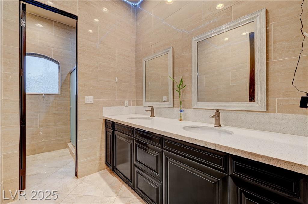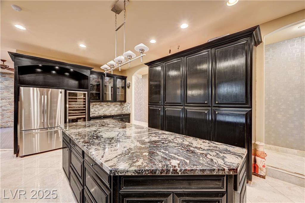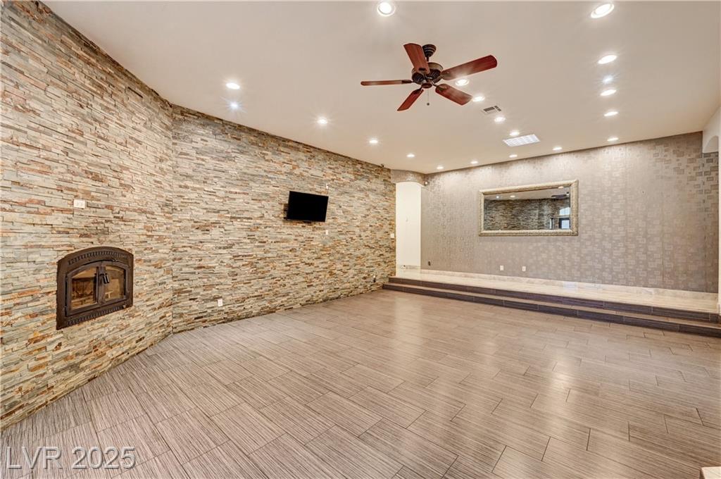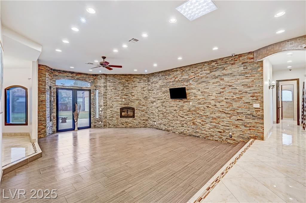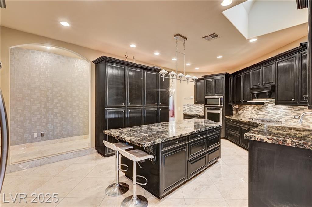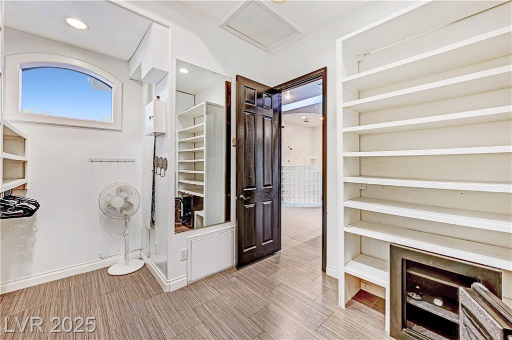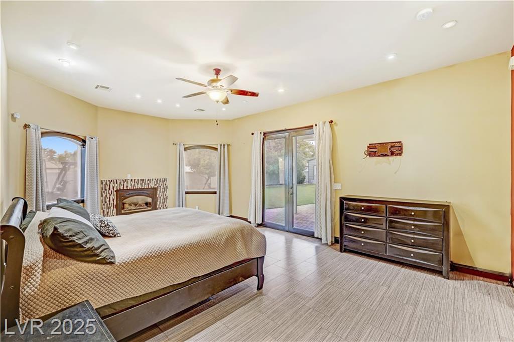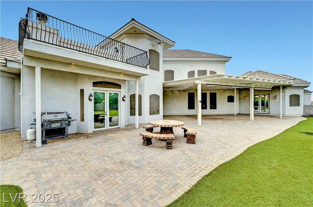 This one-of-a-kind custom Las Vegas estate offers rare privacy, space, and character on a 0.5+ acre corner lot with no HOA or SID. Boasting 4,711 sq ft, this 2-story home features a grand entry with 8-ft wrought iron doors, soaring ceilings, rich wood cabinetry, polished travertine flooring, and abundant natural light. The entertainer’s kitchen includes granite counters and custom finishes, while a loft and home theater add flexibility. The main-level primary suite offers a fireplace, spa-like bath, and backyard access. Enjoy low-maintenance outdoor living with turf landscaping, paver patios, and a pergola. Car lovers will appreciate the detached workshop with a lift, plus a 3-car garage and gated RV/utility parking. Additional features include a central vac, septic system, city water, and gas/electric service. Truly a unique opportunity just minutes from Las Vegas strip, Raiders Stadium, Knights Hockey Arena, and so much more! Schedule your private showing today!