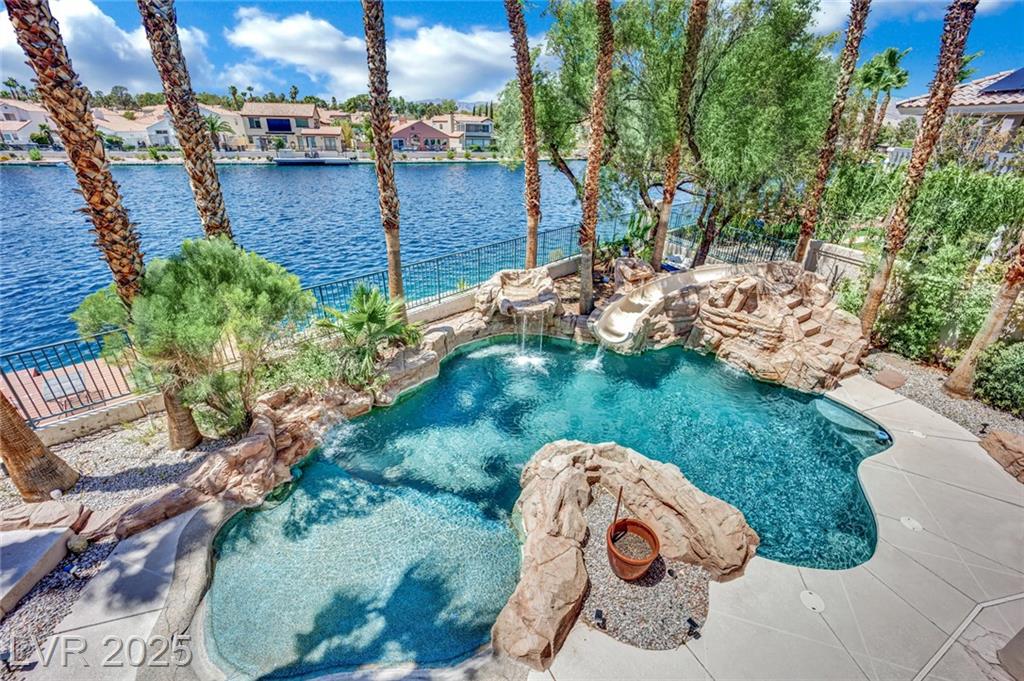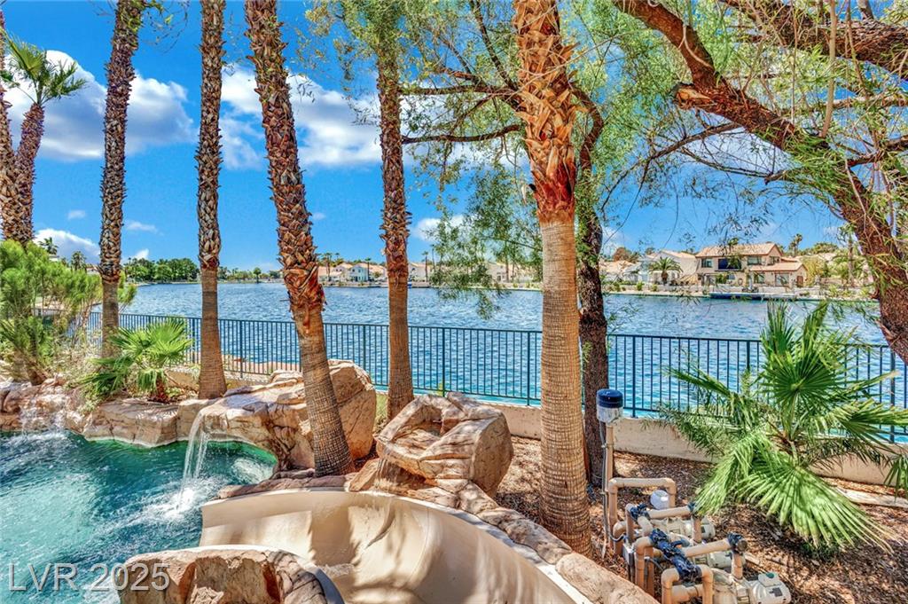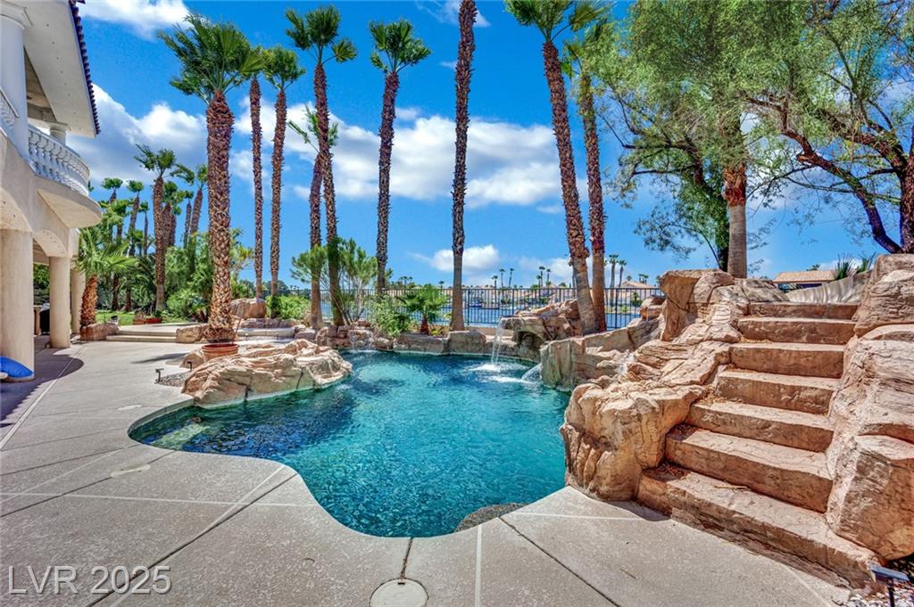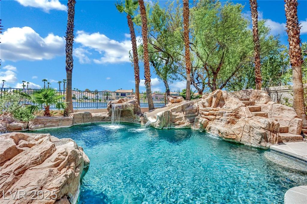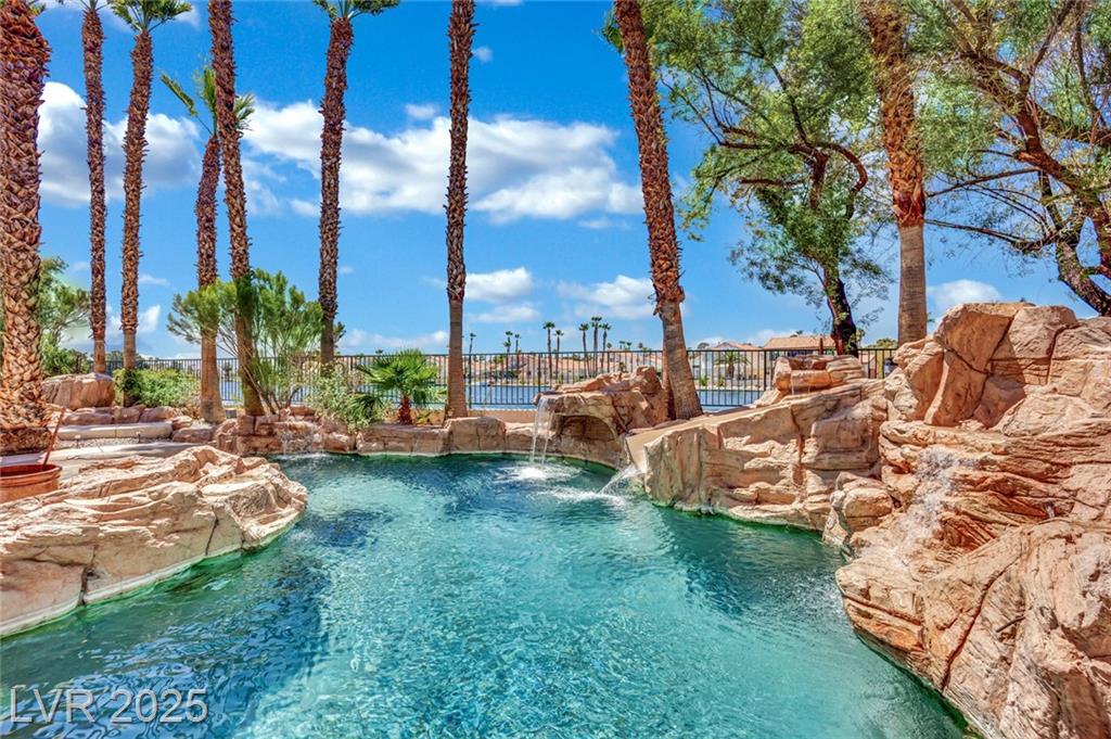 Welcome to 8137 Desert Jewel Court — a stunning lakeside retreat offering resort-style living right at home. Enjoy serene lake views from your backyard oasis, complete with a sparkling waterfall pool, surrounded by lush palm trees that provide a true tropical feel. This well-maintained residence features an open and airy floor plan, spacious living areas filled with natural light. The primary suite offers comfort and privacy, with tranquil views and an en-suite bath. Located in a peaceful neighborhood with convenient access to shopping, dining, and major roads
