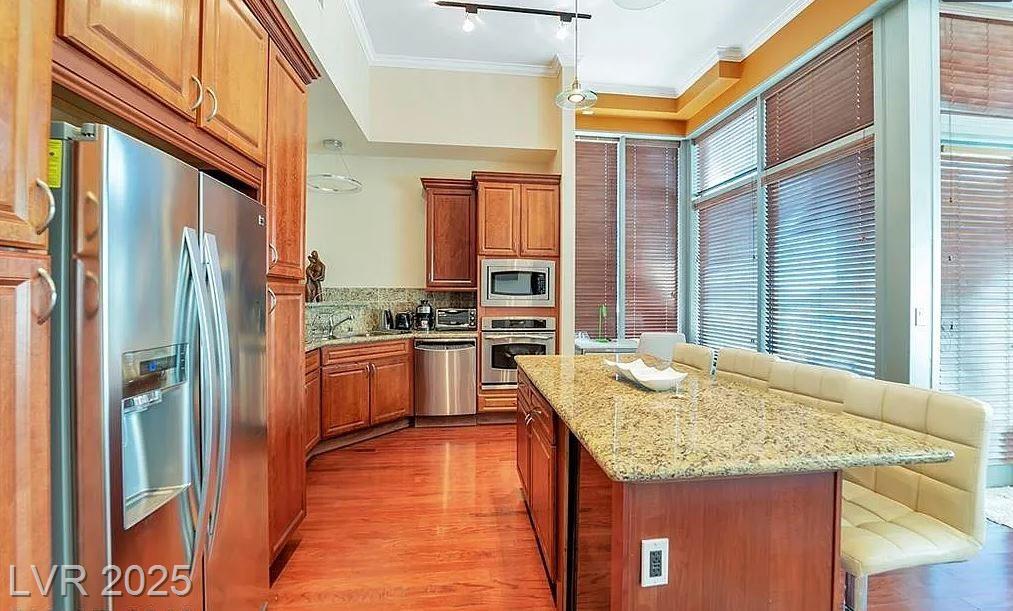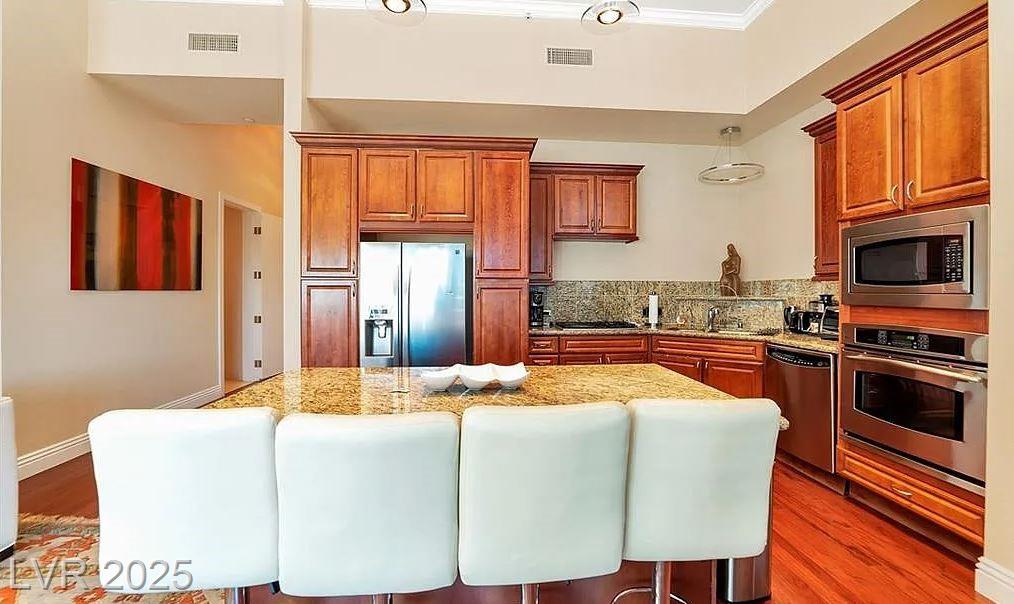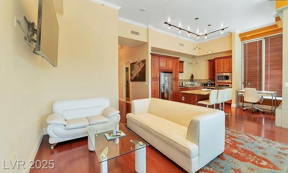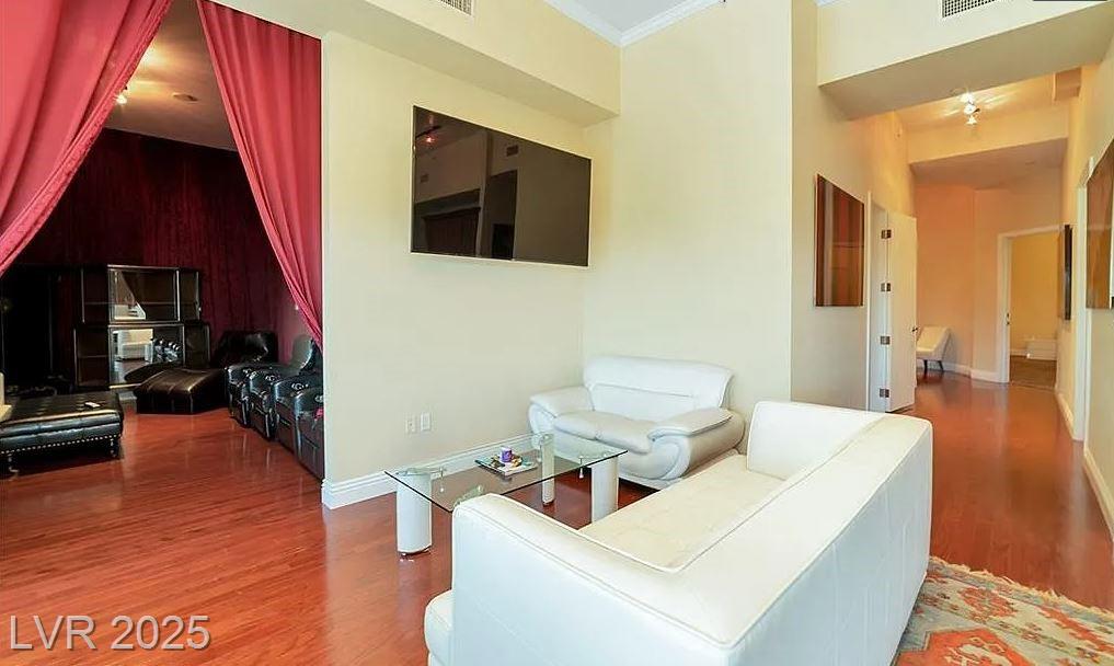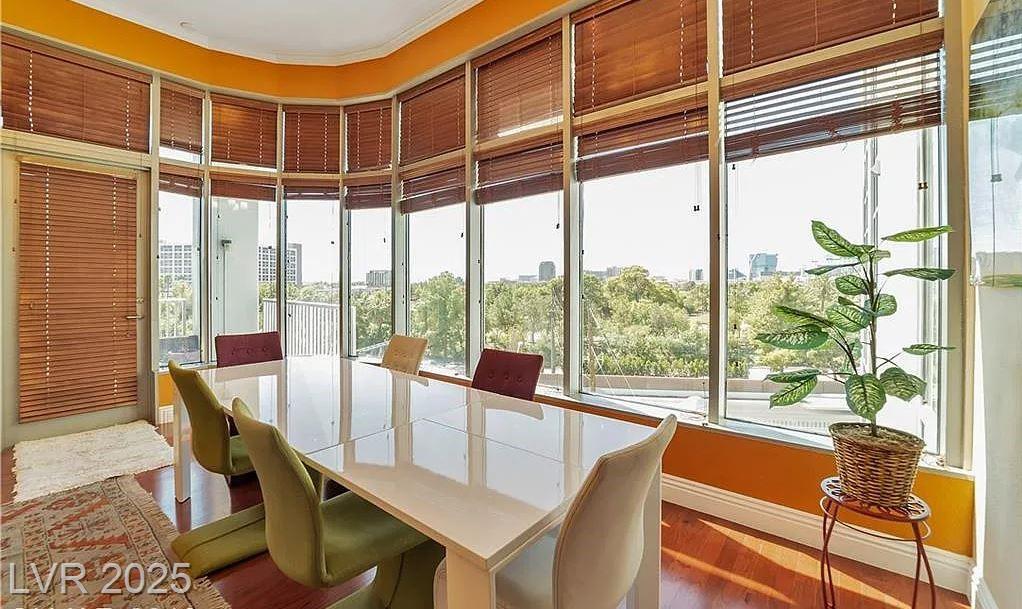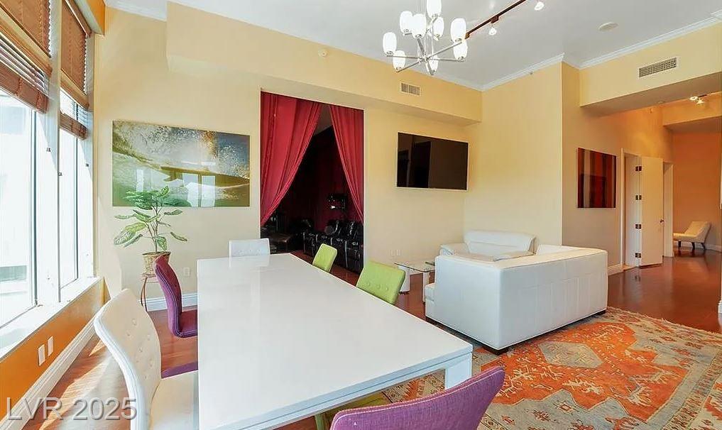 Stunning luxury corner unit in the prestigious Metropolis high-rise with unobstructed views of the MSG Sphere, Las Vegas Strip, and live F1 action from your private balcony at Paradise & Desert Inn. This spacious single-level condo on the 5th floor features an open floor plan, soaring ceilings, and extra-wide hallways. Enjoy a gourmet chef’s kitchen, oversized primary suite with luxury bath and custom walk-in closet, and a media room with closet that can function as a 3rd bedroom or den. The second bedroom overlooks the pool, and there’s a full laundry room. Offered fully furnished with modern decor, this unit is perfect for entertaining or relaxing in style. Pet-friendly with approval. Building amenities include a resort-style pool, full gym, and secure access. Just steps from the Strip, Convention Center, and monorail.