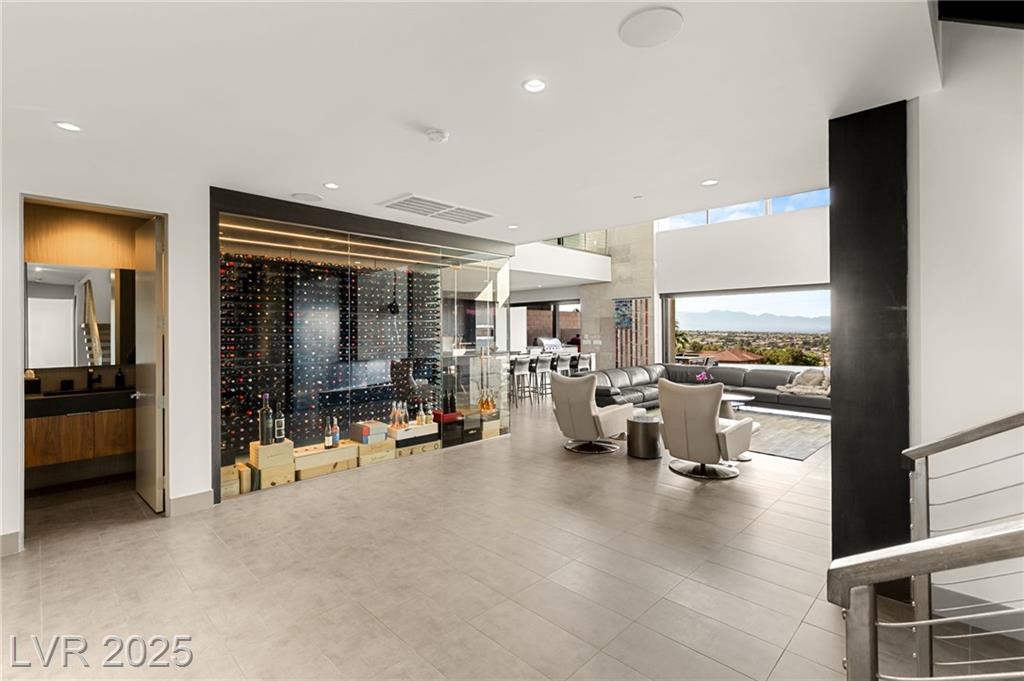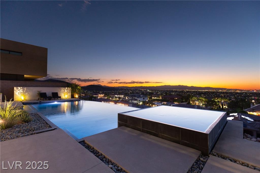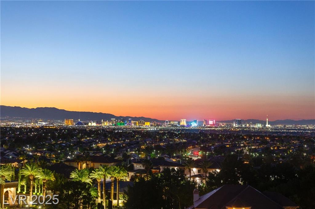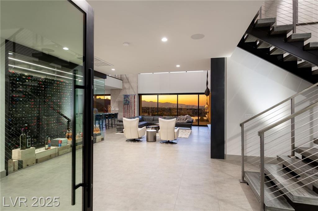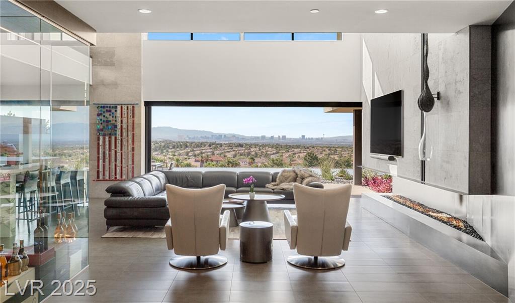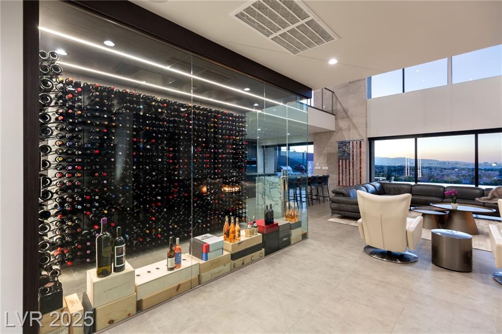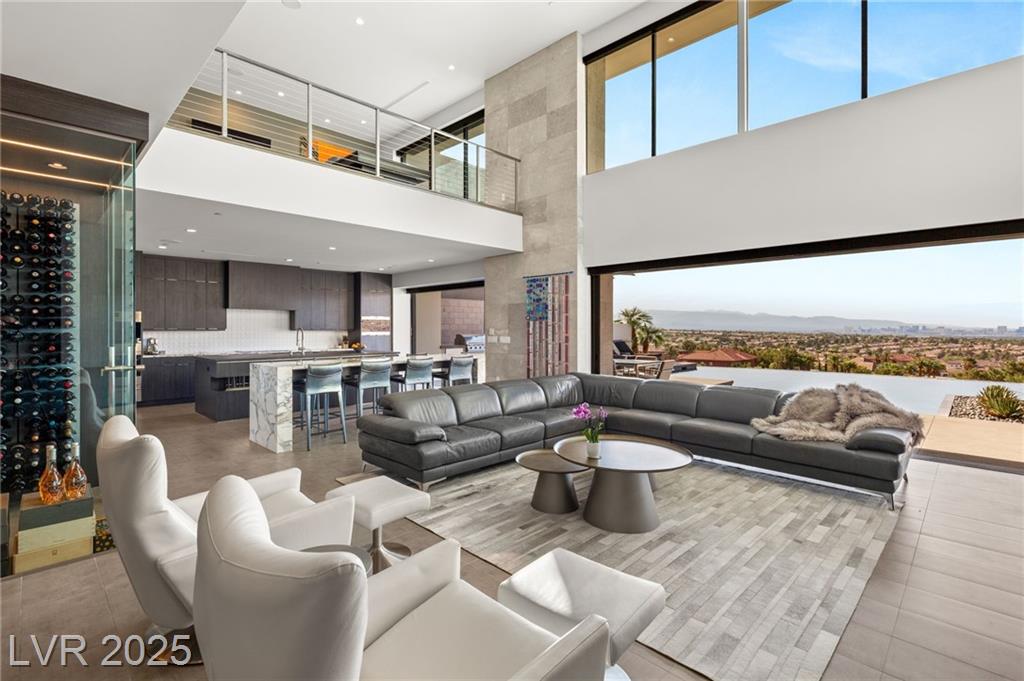 Perched on the prime corner lot of Roma Hills’ exclusive Obsidian enclave, this custom Blue Heron estate showcases forever Strip, valley, and mountain views. A private courtyard reveals a floating staircase and 1,200-bottle glass wine cellar with concrete STACT racking and dual temp systems. Disappearing pocket doors and soaring ceilings create seamless indoor-outdoor living, anchored by a sleek linear fireplace and waterfall granite island. The chef’s kitchen features custom cabinetry, a pro-style butler’s pantry, and energy-efficient windows framing breathtaking vistas. The downstairs primary retreat offers disappearing doors, dual vanities, body jets, and a private fire-lit patio. Upstairs includes a junior suite with dual balconies, loft, and wellness room/gym w/sauna. Resort-style grounds boast an infinity-edge pool, four-sided waterfall spa, and covered patios, complementing 5 bedrooms, 6 baths, and 2 powder rooms—crafted for a private lifestyle