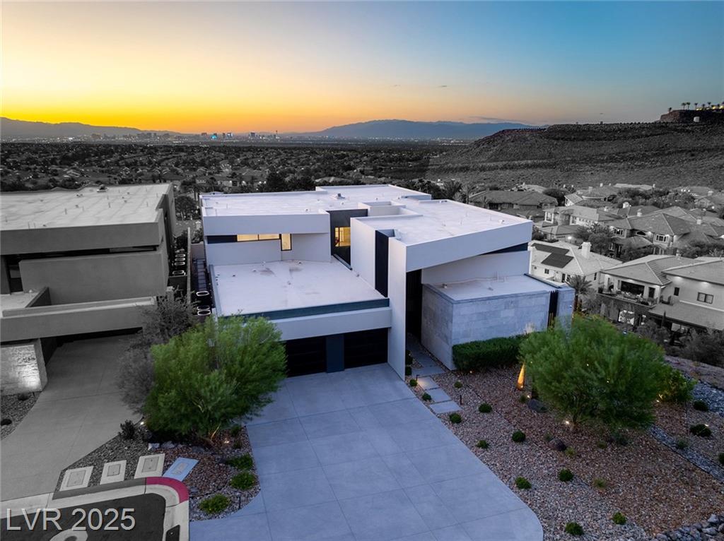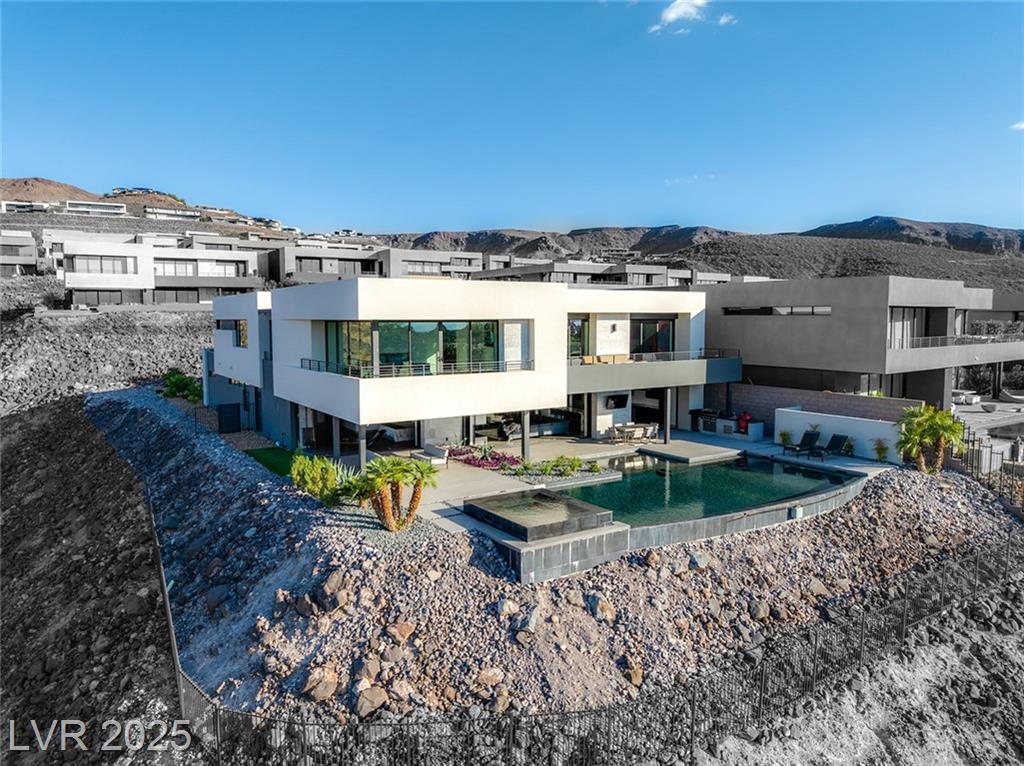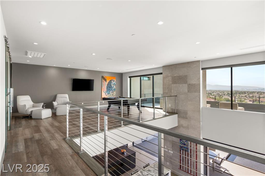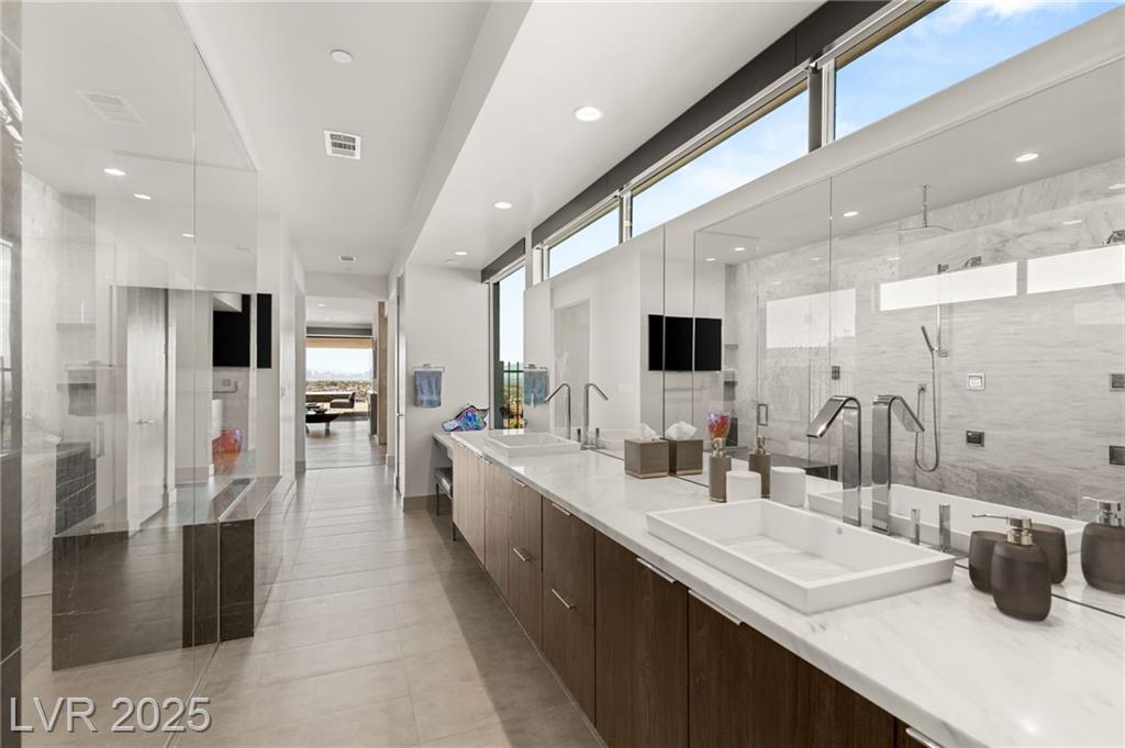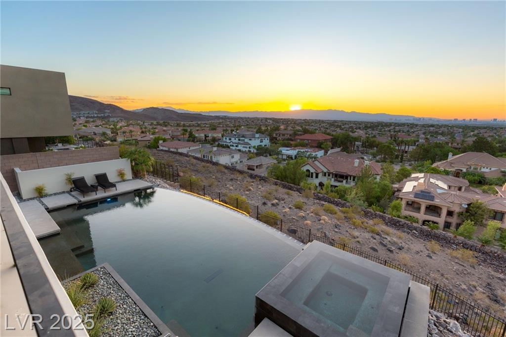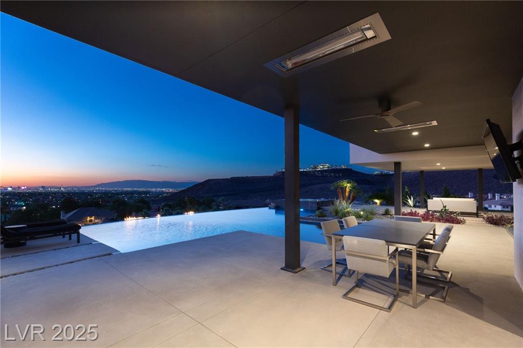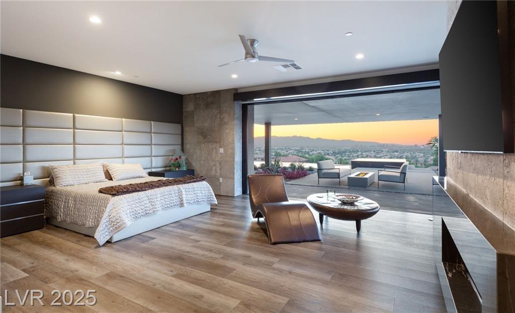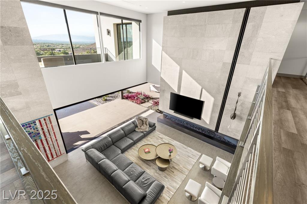Perched on the prime corner lot of Roma Hills’ exclusive Obsidian enclave, this custom Blue Heron estate showcases forever Strip, valley, and mountain views. A private courtyard reveals a floating staircase and 1,200-bottle glass wine cellar with concrete STACT racking and dual temp systems. Disappearing pocket doors and soaring ceilings create seamless indoor-outdoor living, anchored by a sleek linear fireplace and waterfall granite island. The chef’s kitchen features custom cabinetry, a pro-style butler’s pantry, and energy-efficient windows framing breathtaking vistas. The downstairs primary retreat offers disappearing doors, dual vanities, body jets, and a private fire-lit patio. Upstairs includes a junior suite with dual balconies, loft, and wellness room/gym w/sauna. Resort-style grounds boast an infinity-edge pool, four-sided waterfall spa, and covered patios, complementing 5 bedrooms, 6 baths, and 2 powder rooms—crafted for a private lifestyle