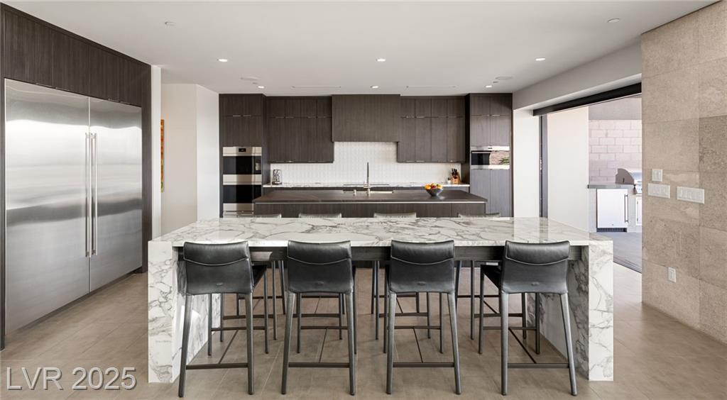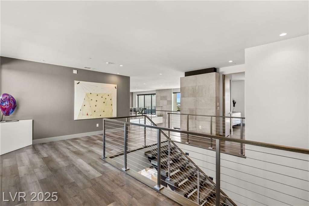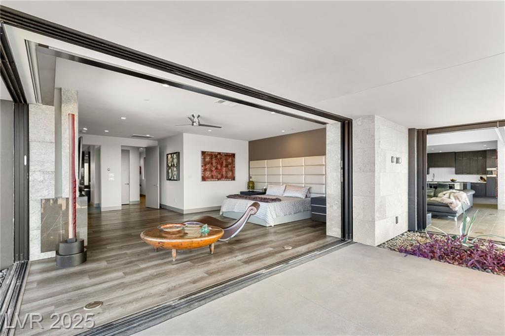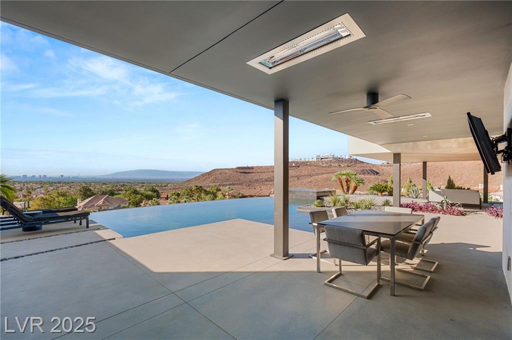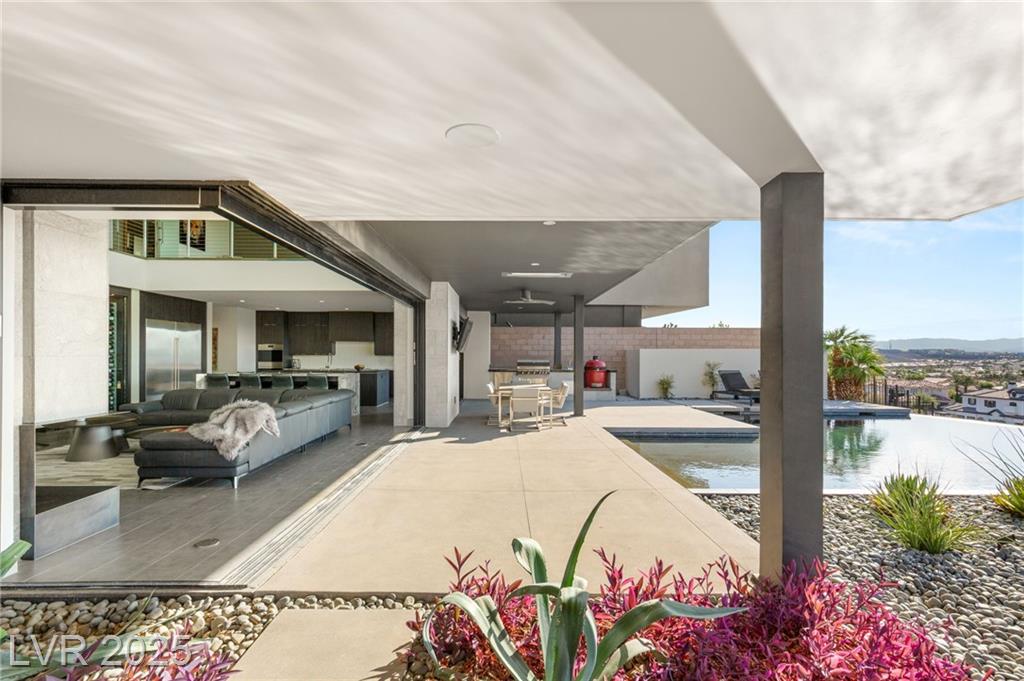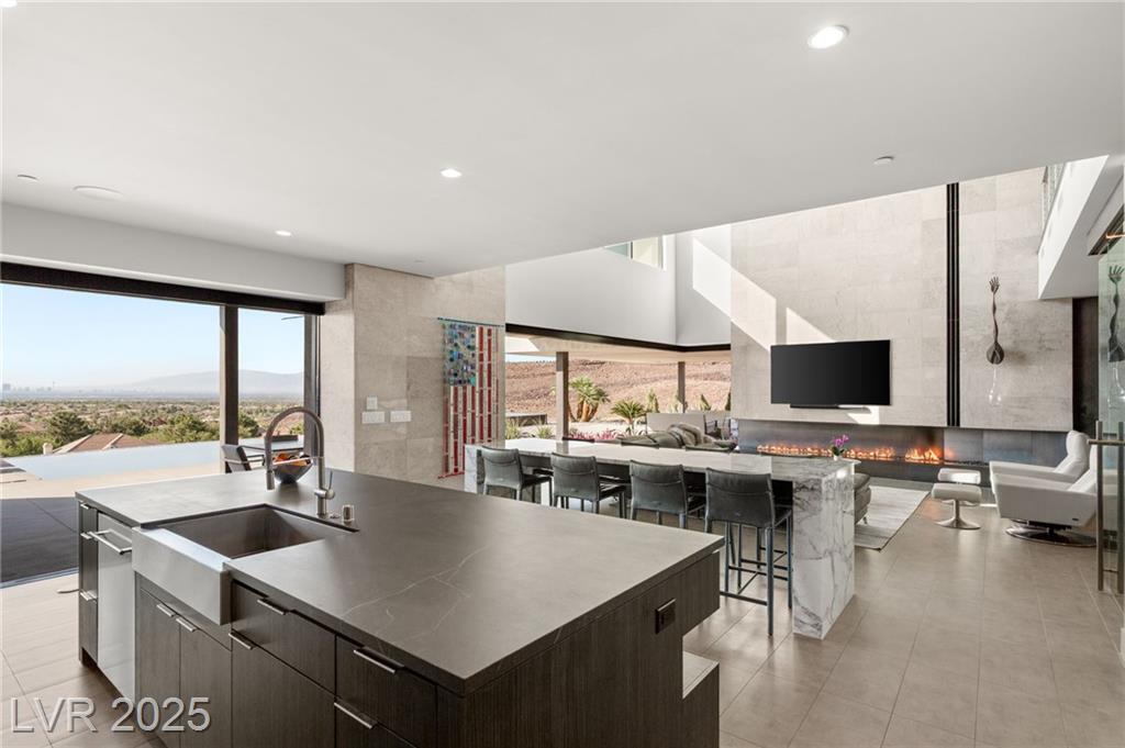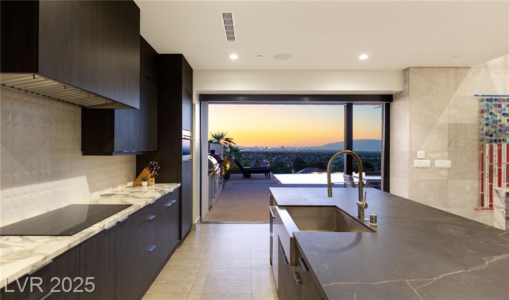 Perched on the prime corner lot of Roma Hills’ exclusive Obsidian enclave, this custom Blue Heron estate showcases forever Strip, valley, and mountain views. A private courtyard reveals a floating staircase and 1,200-bottle glass wine cellar with concrete STACT racking and dual temp systems. Disappearing pocket doors and soaring ceilings create seamless indoor-outdoor living, anchored by a sleek linear fireplace and waterfall granite island. The chef’s kitchen features custom cabinetry, a pro-style butler’s pantry, and energy-efficient windows framing breathtaking vistas. The downstairs primary retreat offers disappearing doors, dual vanities, body jets, and a private fire-lit patio. Upstairs includes a junior suite with dual balconies, loft, and wellness room/gym w/sauna. Resort-style grounds boast an infinity-edge pool, four-sided waterfall spa, and covered patios, complementing 5 bedrooms, 6 baths, and 2 powder rooms—crafted for a private lifestyle
