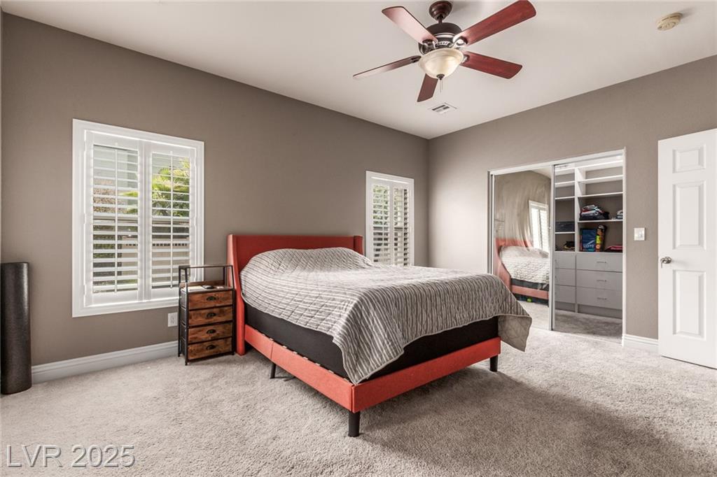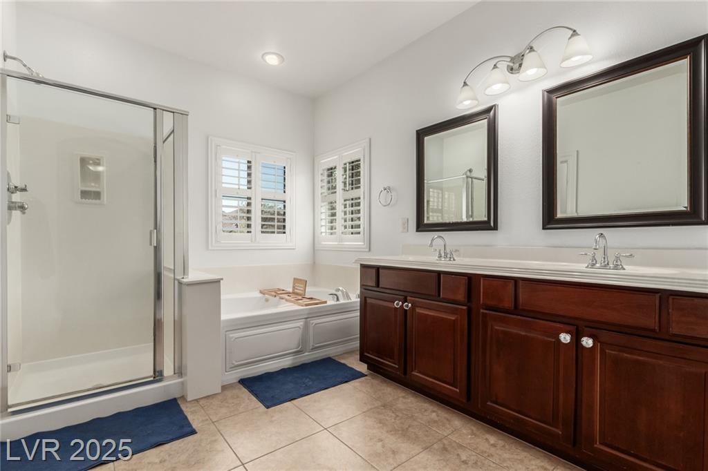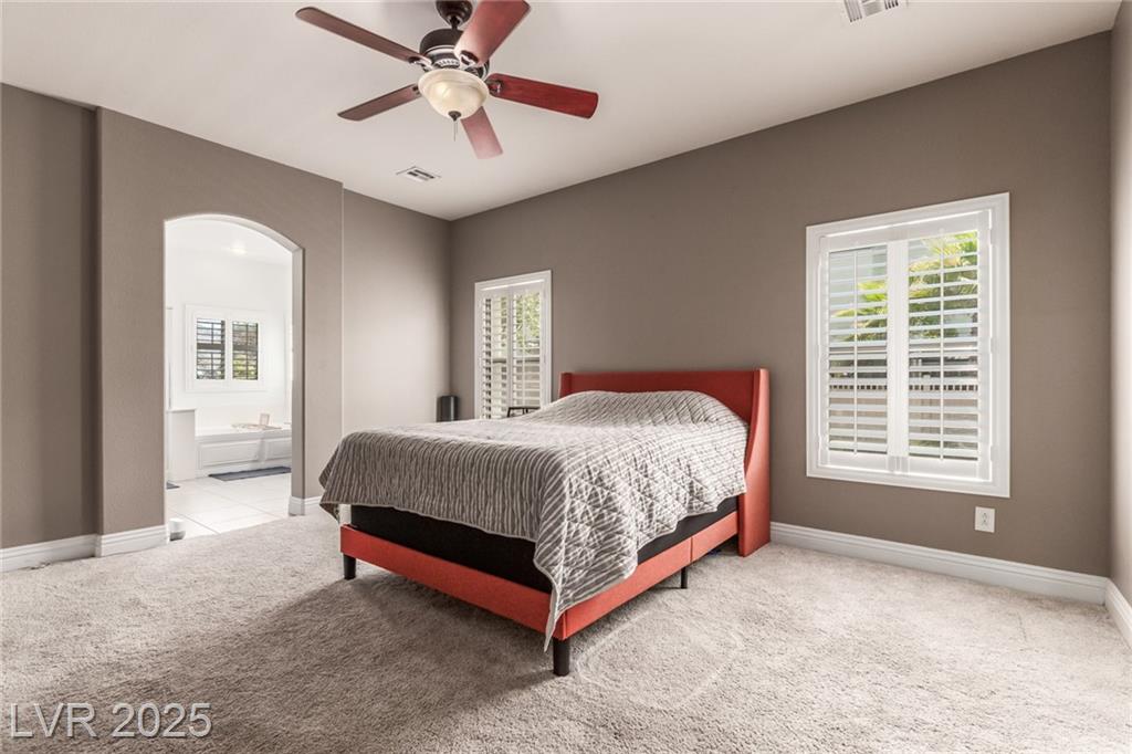 Welcome to this beautifully upgraded 2-story townhouse located in the gated community of Paradise Ranch in Henderson. The gourmet kitchen features sleek granite countertops, stainless steel appliances, and opens seamlessly to the living and dining area—perfect for entertaining. Downstairs you'll find a convenient guest bedroom with a full bath, ideal for visitors or multi-generational living. Upstairs, the oversized primary suite offers a walk-in closet and a luxurious ensuite bath complete with a jetted soaking tub and separate walk-in shower. The secondary upstairs bedroom also includes a private bath and walk-in closet, providing comfort and privacy for all. Additional features include elegant shutters throughout, ceiling fans in every room, and a prime location just steps away from the sparkling community pool. Don't miss the opportunity to own this turn-key home in a quiet and beautifully maintained neighborhood!