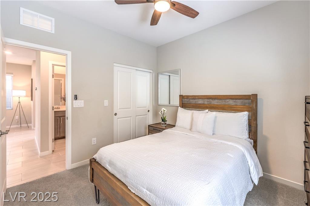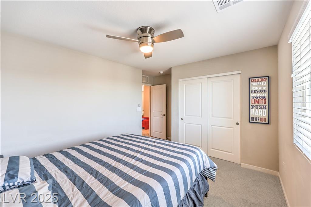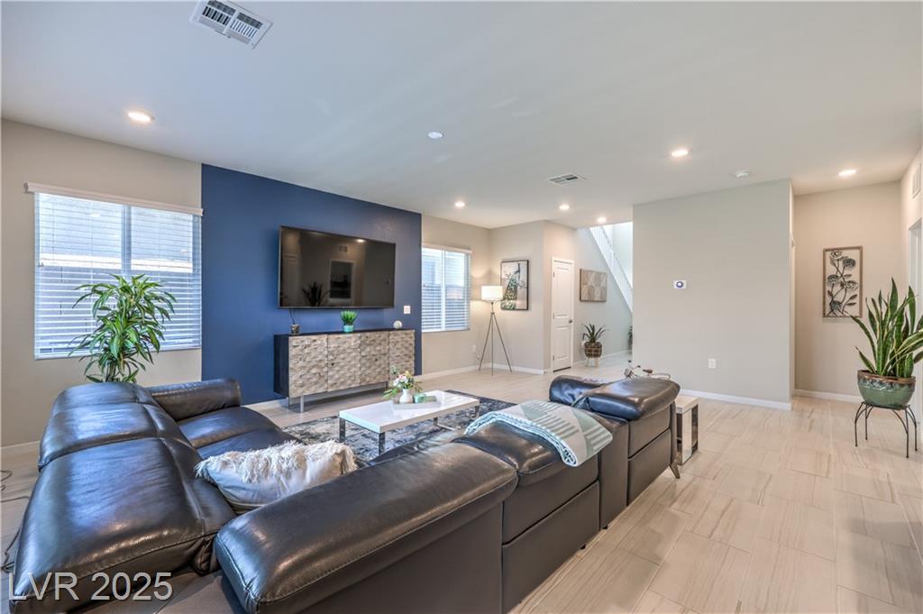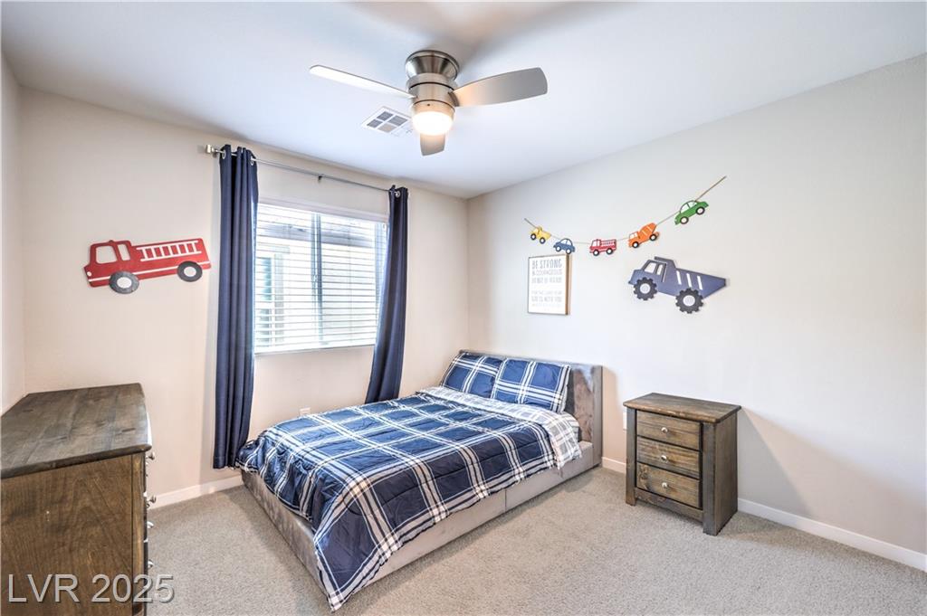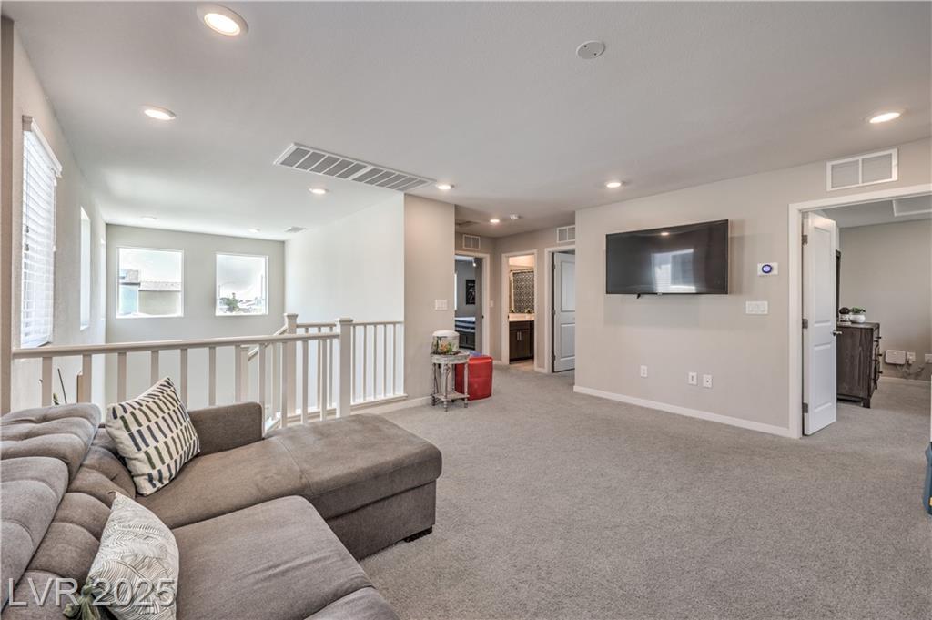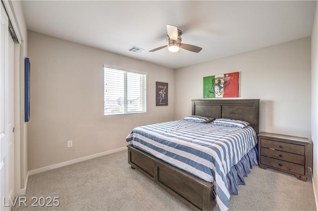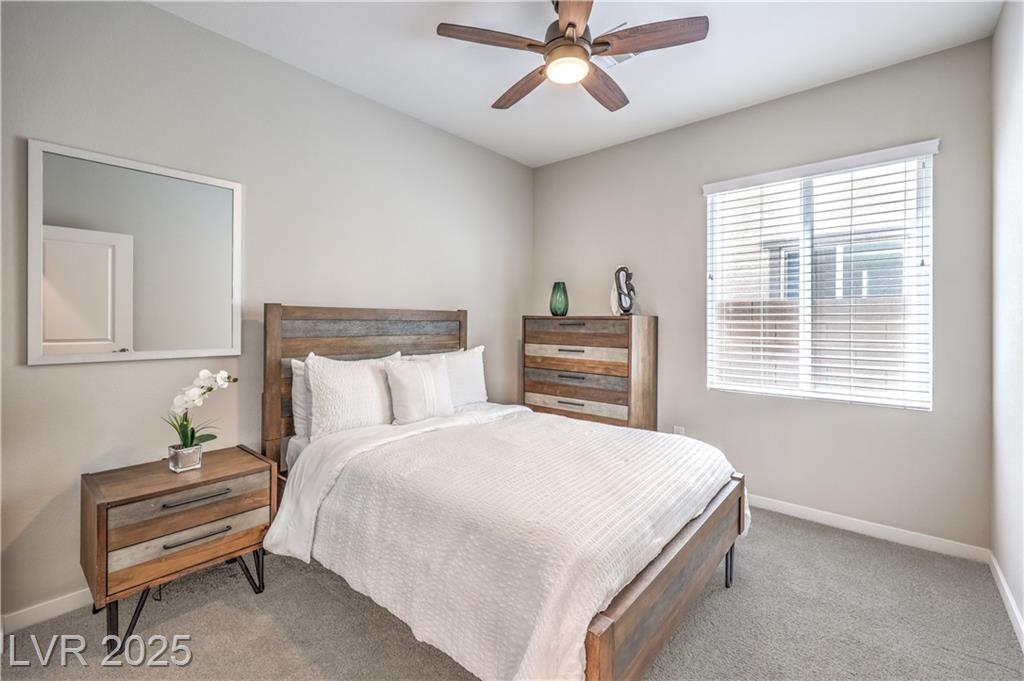 SELLERS CURRENT LOAN IS ASSUMABLE AT 3.25%. CALL AGENT WITH QUESTIONS. Gorgeous! Highly desirable turn key home! This 4 bedroom, 3 full bath, plus a spacious loft, includes a full bathroom and bedroom downstairs! Pavestone driveway and walkway, with desert landscaping. Energy efficient home with solar panels, dual pane windows, tankless water heater and alarm/camera system. Upgraded grey tile and carpet floors. Beautiful entranceway with lots of natural lighting, leading to open living space, kitchen, bedroom and full bath. Kitchen has a large island/breakfast bar, white quartz countertops, espresso cabinets, stainless steel appliances and pantry. Large laundry room upstairs. Master suite has high ceiling, walk-in-closet and dual vanity. Come outside and enjoy a beautifully done, pool size low maintenance backyard with artificial grass, pavers, plants, and covered patio. Community also has a park with playground. Minutes away from shopping, the 215, VA hospital, Nellis & Creech AFB.