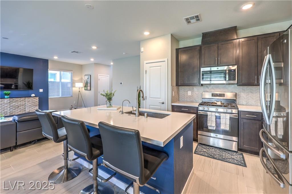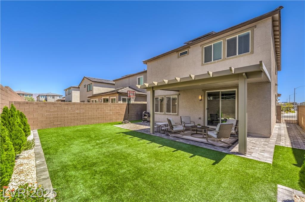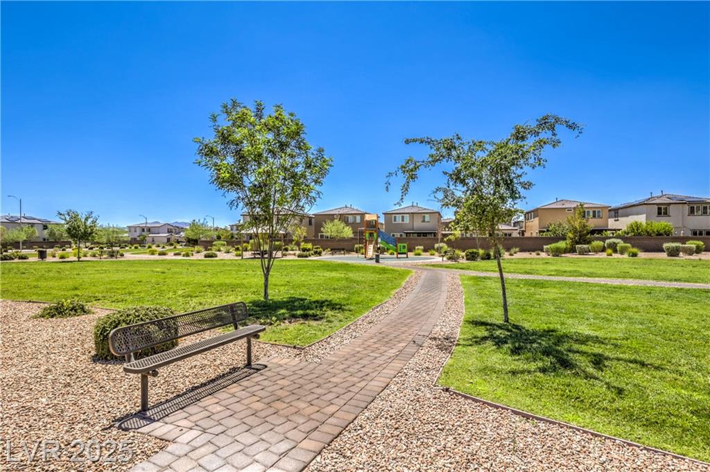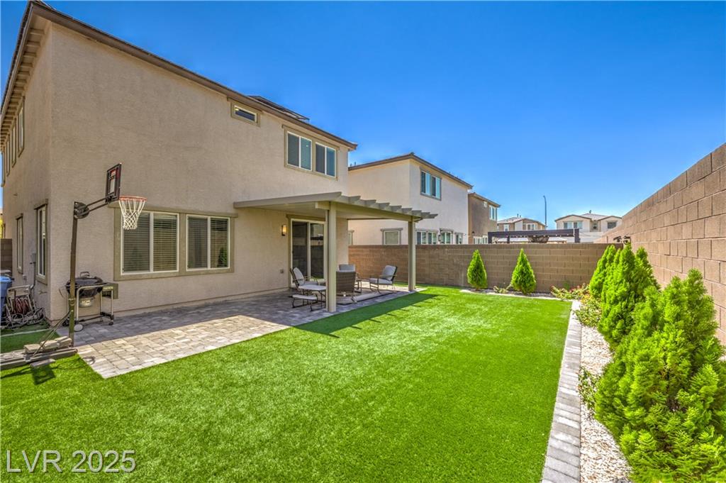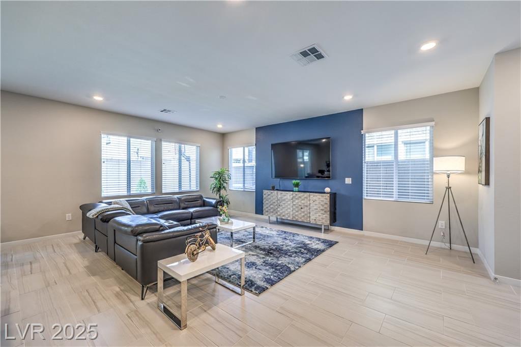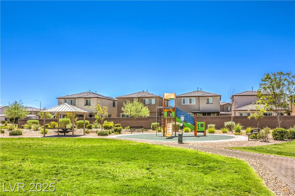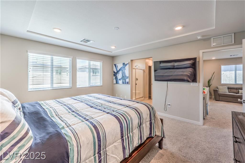 SELLERS CURRENT LOAN IS ASSUMABLE AT 3.25%. CALL AGENT WITH QUESTIONS. Gorgeous! Highly desirable turn key home! This 4 bedroom, 3 full bath, plus a spacious loft, includes a full bathroom and bedroom downstairs! Pavestone driveway and walkway, with desert landscaping. Energy efficient home with solar panels, dual pane windows, tankless water heater and alarm/camera system. Upgraded grey tile and carpet floors. Beautiful entranceway with lots of natural lighting, leading to open living space, kitchen, bedroom and full bath. Kitchen has a large island/breakfast bar, white quartz countertops, espresso cabinets, stainless steel appliances and pantry. Large laundry room upstairs. Master suite has high ceiling, walk-in-closet and dual vanity. Come outside and enjoy a beautifully done, pool size low maintenance backyard with artificial grass, pavers, plants, and covered patio. Community also has a park with playground. Minutes away from shopping, the 215, VA hospital, Nellis & Creech AFB.