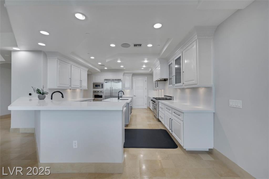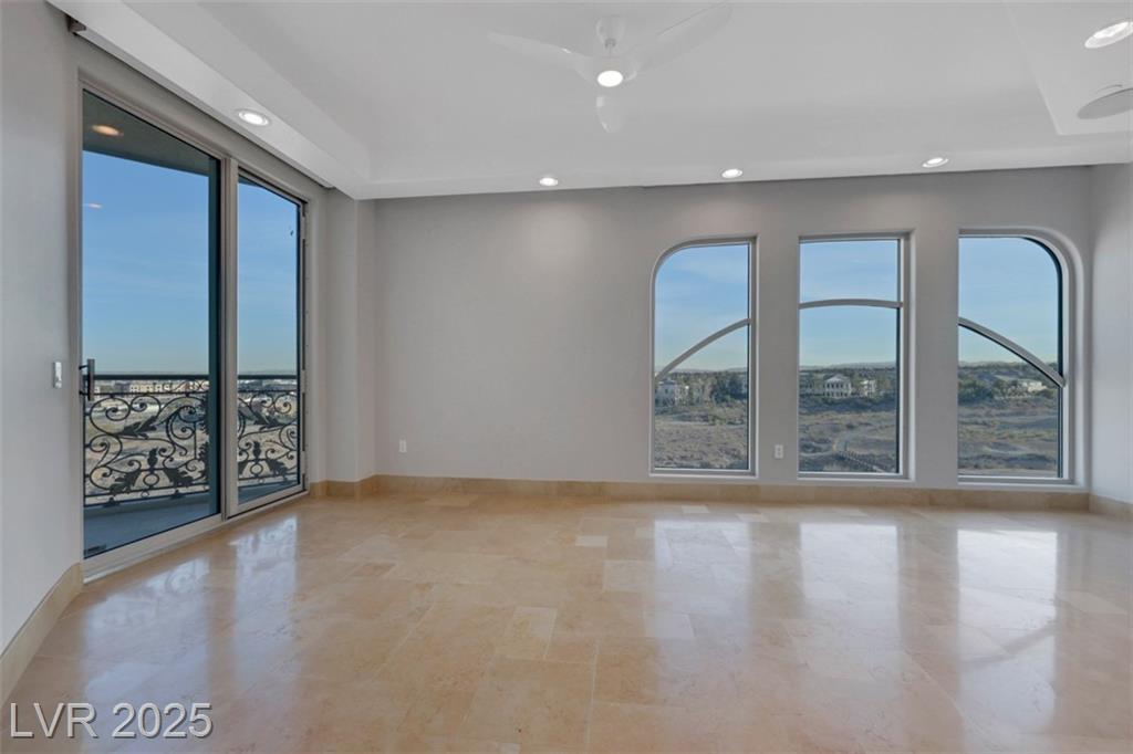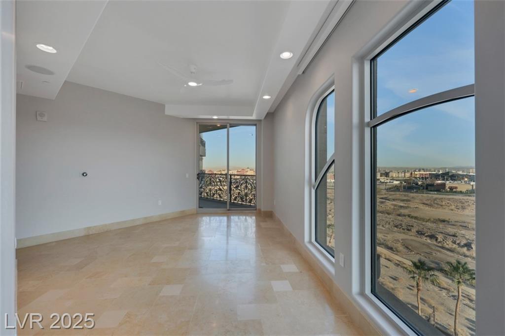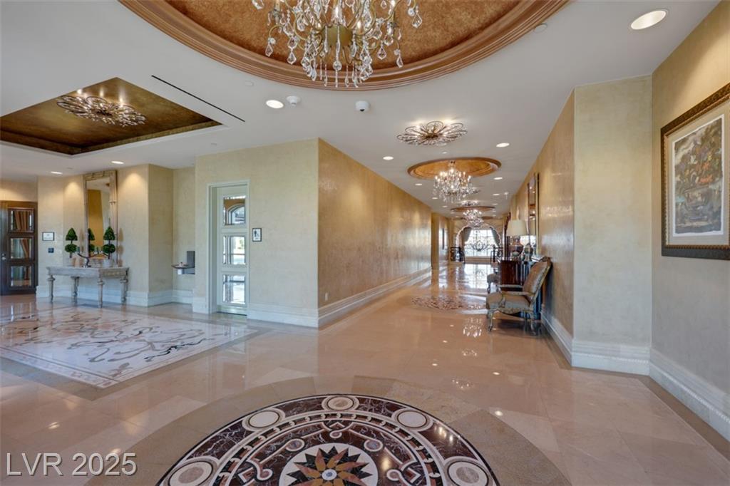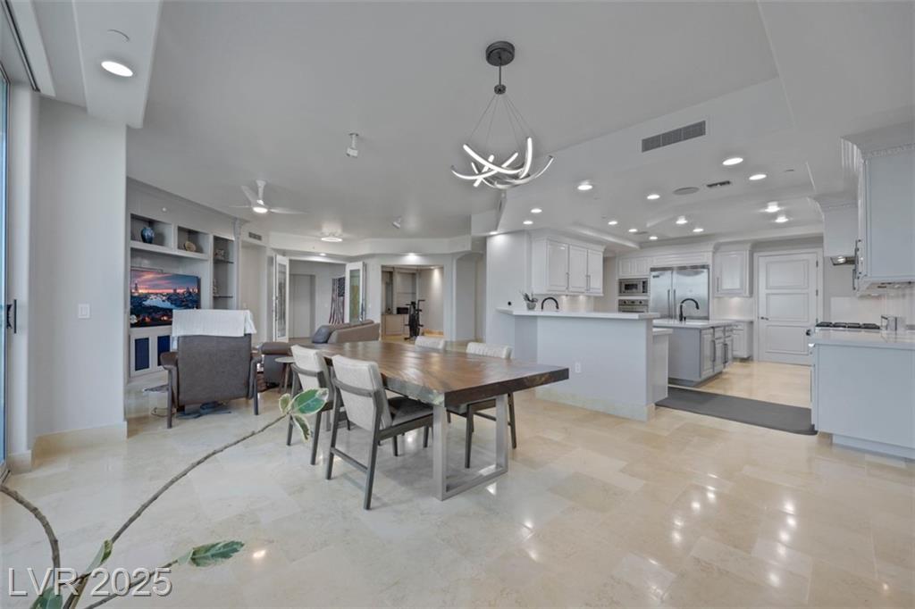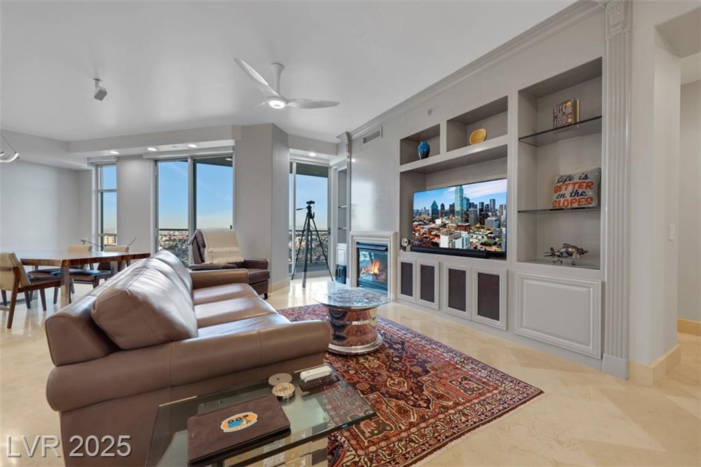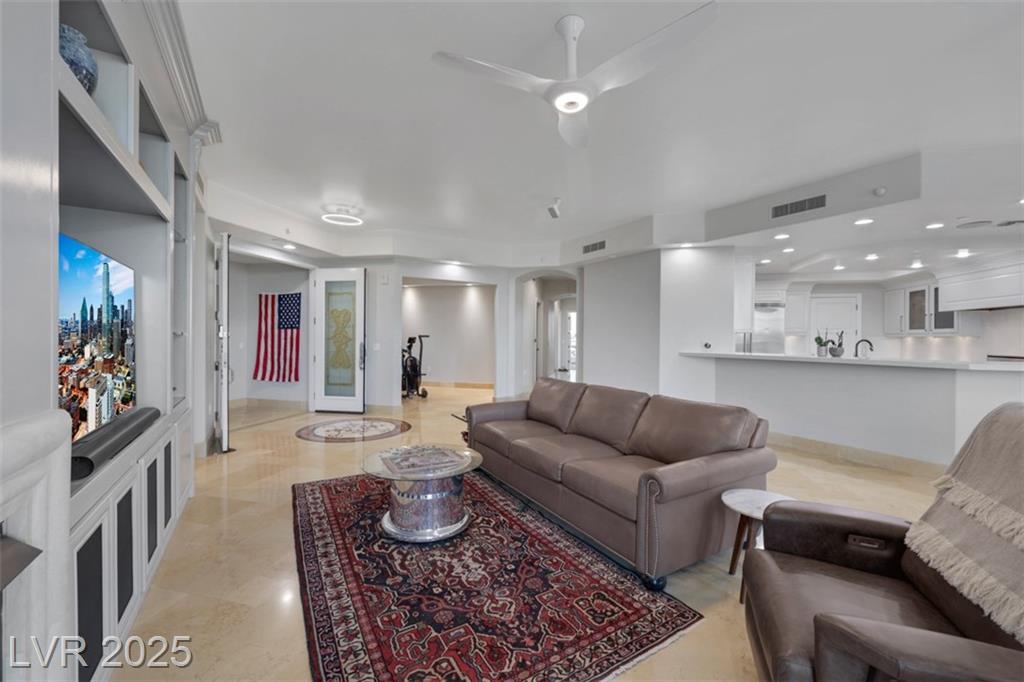 Stunning 3,100 sq ft. 3 bd, 3.5 bath residence at One Queensridge Place, one of Las Vegas' most prestigious luxury high-rises. Enjoy breathtaking panoramic views of the Las Vegas Strip, Red Rock Mountains, and the vibrant city skyline. Expansive floor-to-ceiling windows allow natural light to flood the space and provide unmatched views from every room. The gourmet upgraded kitchen features a spacious island, suite of premium Viking appliances including three ovens and six burners plus griddle, and a reverse osmosis water system. The open great room and dining area flow seamlessly onto dual terraces providing exceptional outdoor spaces for dining and relaxing in the panoramic vistas. The master suite has its own terrace, a massive walk-in closet and a luxurious spa-inspired bathroom with jetted tub, steam shower, bidet and dual vanities. Two large guest suites boast their own full bathroom and terrace access. Programmable electric blackout shades ensure ultimate comfort and privacy.