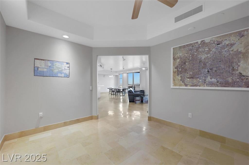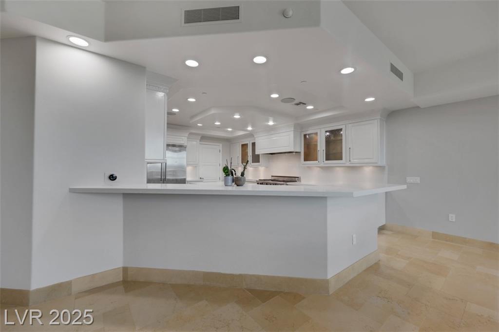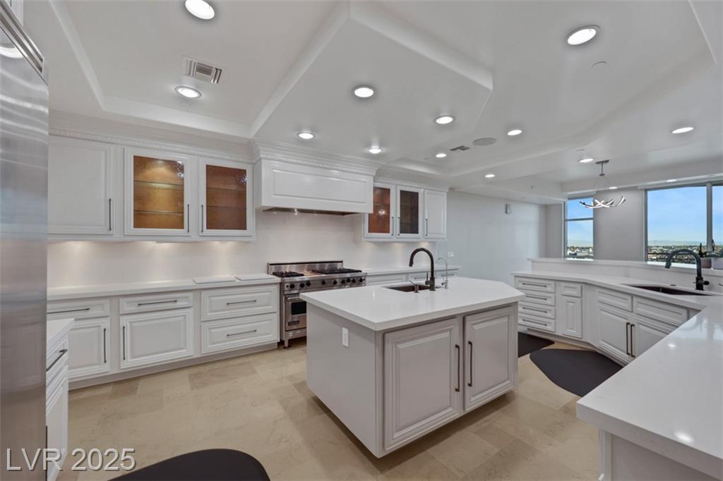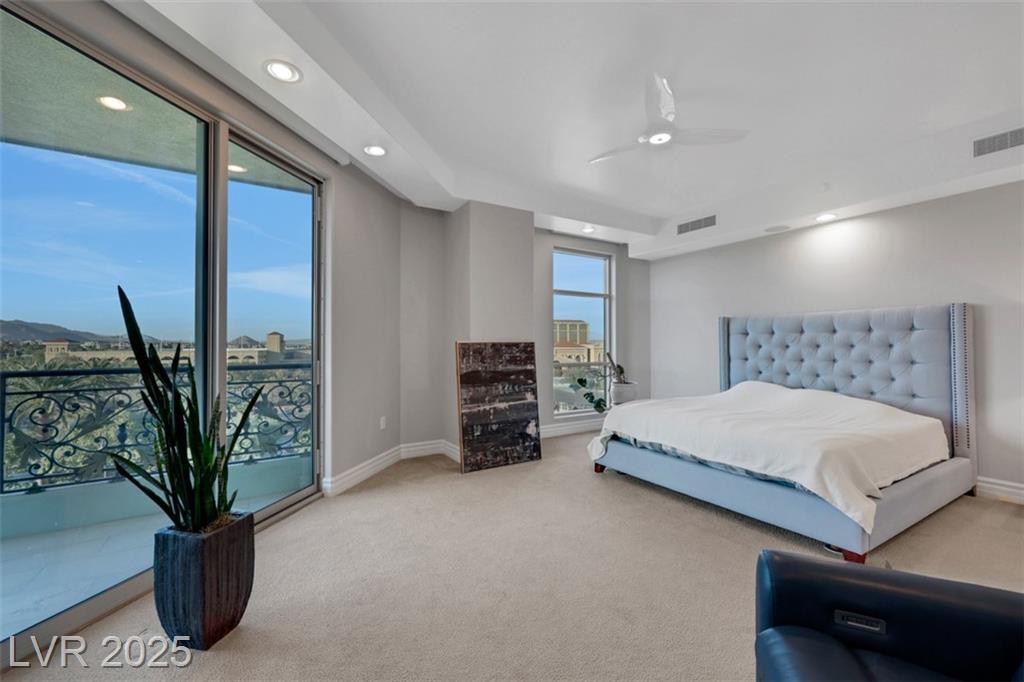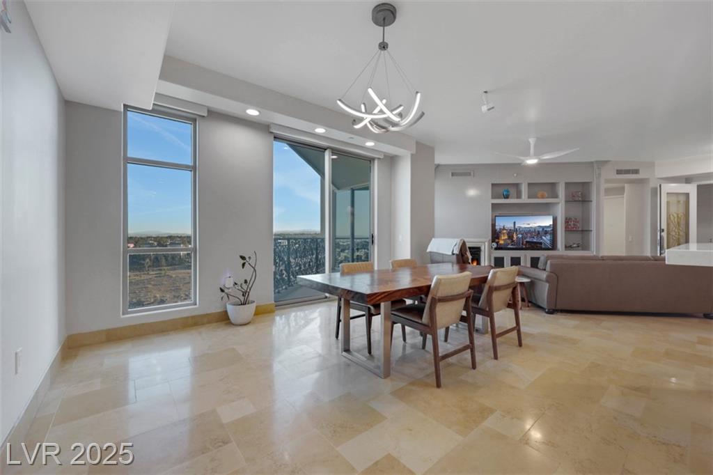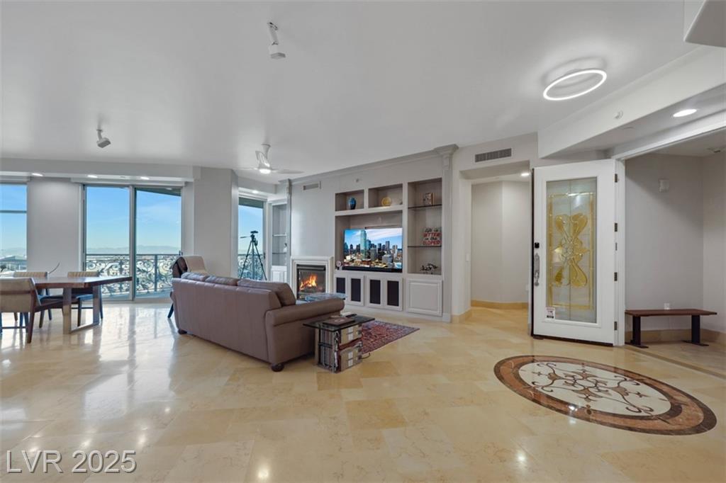 Stunning 3,100 sq ft. 3 bd, 3.5 bath residence at One Queensridge Place, one of Las Vegas' most prestigious luxury high-rises. Enjoy breathtaking panoramic views of the Las Vegas Strip, Red Rock Mountains, and the vibrant city skyline. Expansive floor-to-ceiling windows allow natural light to flood the space and provide unmatched views from every room. The gourmet upgraded kitchen features a spacious island, suite of premium Viking appliances including three ovens and six burners plus griddle, and a reverse osmosis water system. The open great room and dining area flow seamlessly onto dual terraces providing exceptional outdoor spaces for dining and relaxing in the panoramic vistas. The master suite has its own terrace, a massive walk-in closet and a luxurious spa-inspired bathroom with jetted tub, steam shower, bidet and dual vanities. Two large guest suites boast their own full bathroom and terrace access. Programmable electric blackout shades ensure ultimate comfort and privacy.