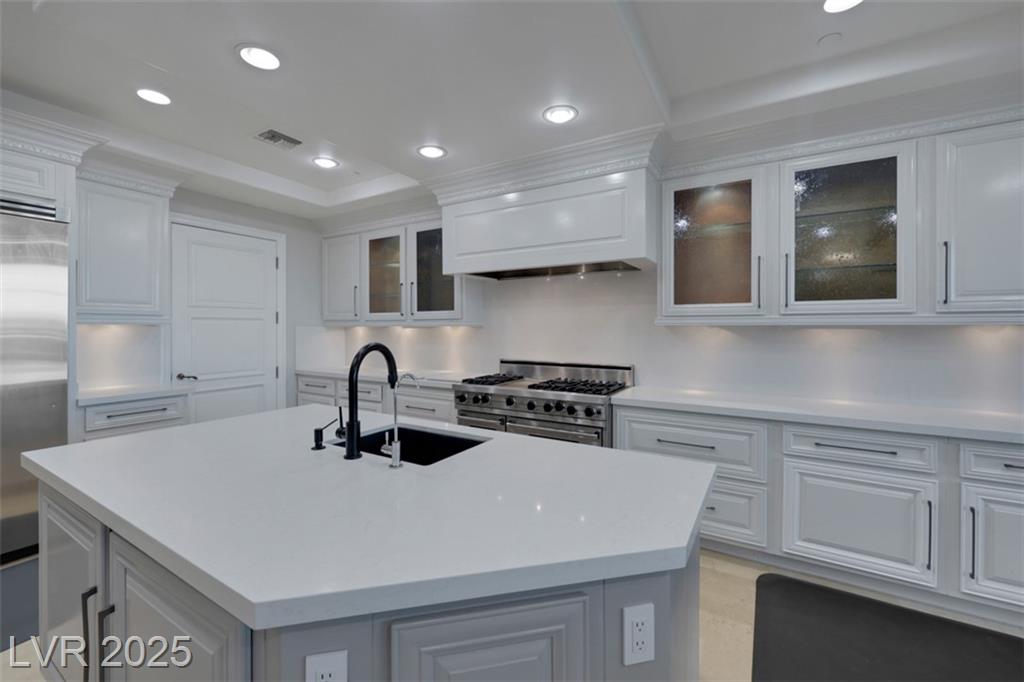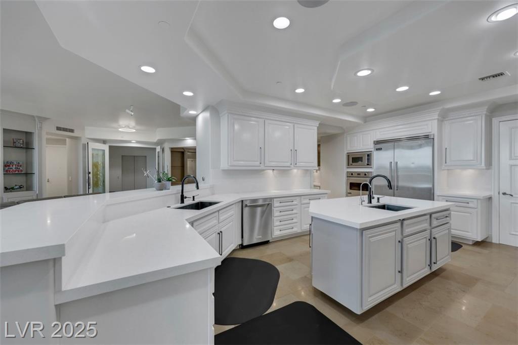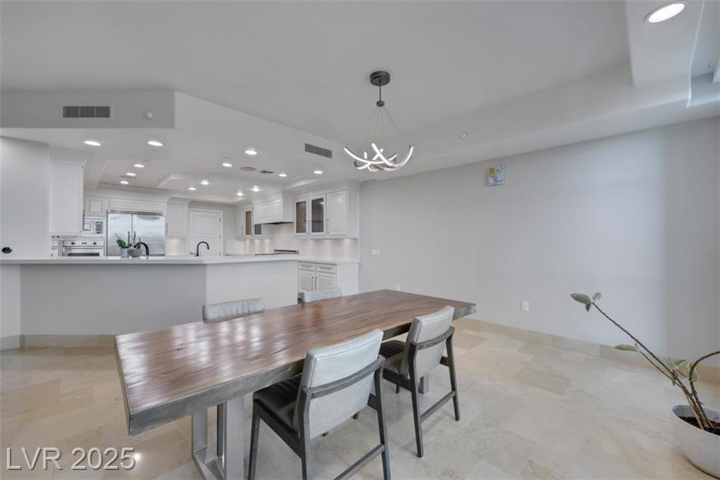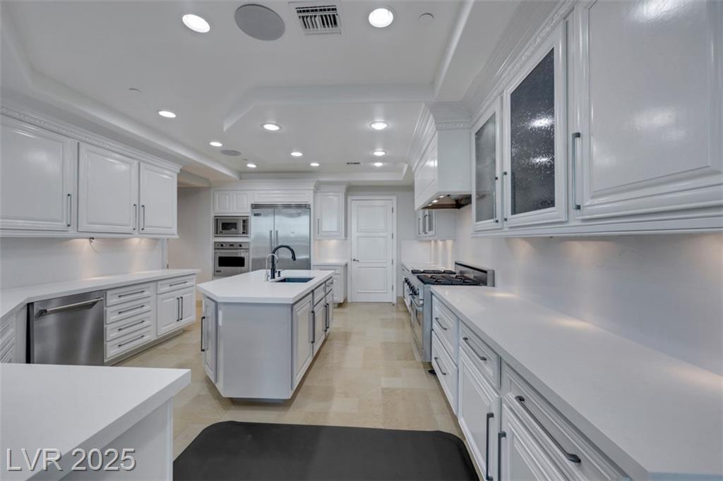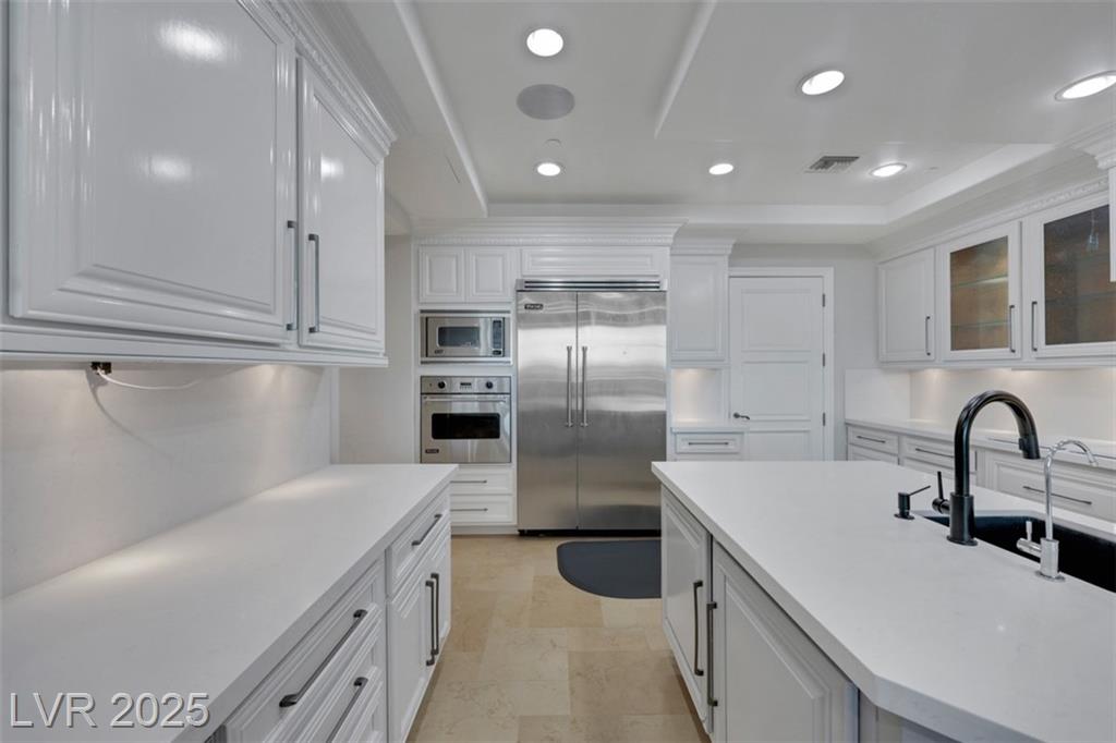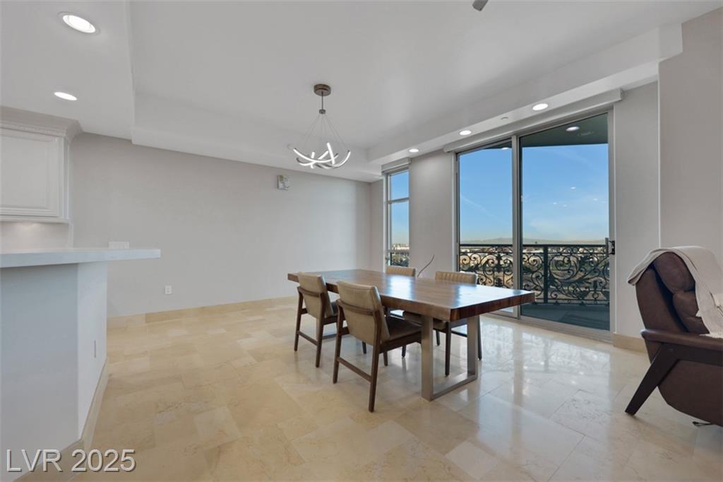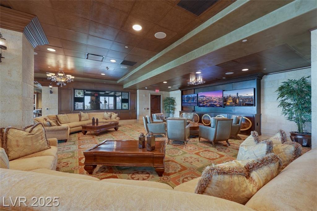 Stunning 3,100 sq ft. 3 bd, 3.5 bath residence at One Queensridge Place, one of Las Vegas' most prestigious luxury high-rises. Enjoy breathtaking panoramic views of the Las Vegas Strip, Red Rock Mountains, and the vibrant city skyline. Expansive floor-to-ceiling windows allow natural light to flood the space and provide unmatched views from every room. The gourmet upgraded kitchen features a spacious island, suite of premium Viking appliances including three ovens and six burners plus griddle, and a reverse osmosis water system. The open great room and dining area flow seamlessly onto dual terraces providing exceptional outdoor spaces for dining and relaxing in the panoramic vistas. The master suite has its own terrace, a massive walk-in closet and a luxurious spa-inspired bathroom with jetted tub, steam shower, bidet and dual vanities. Two large guest suites boast their own full bathroom and terrace access. Programmable electric blackout shades ensure ultimate comfort and privacy.