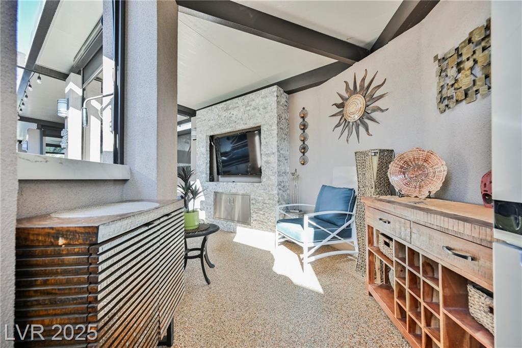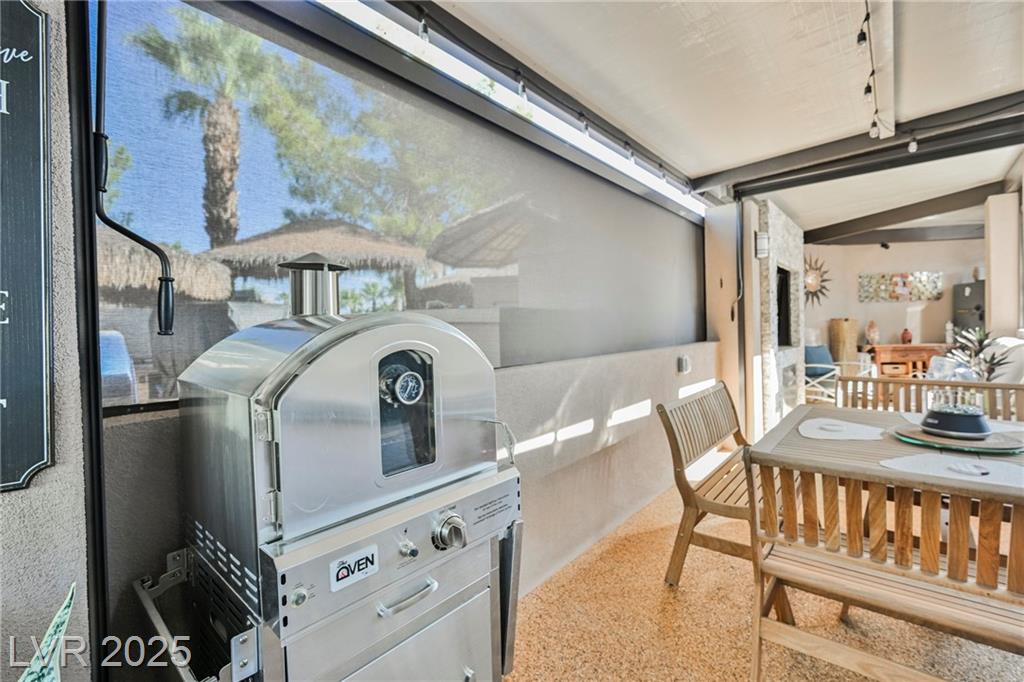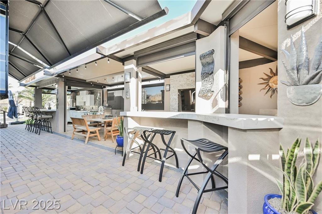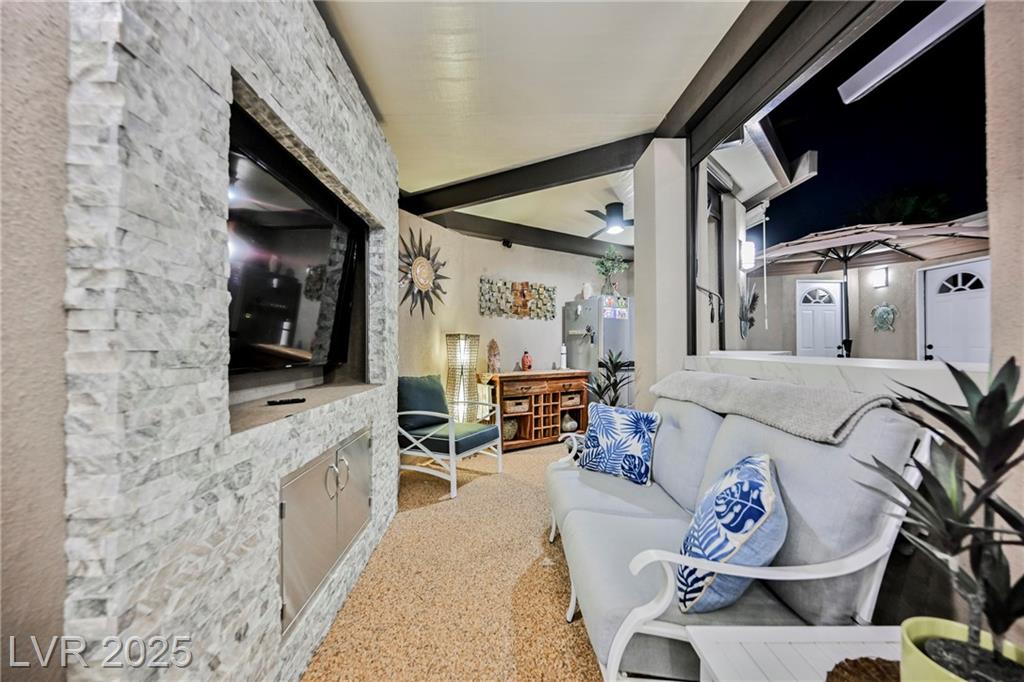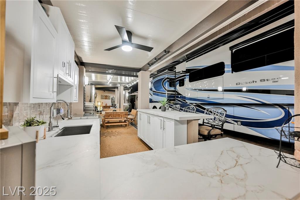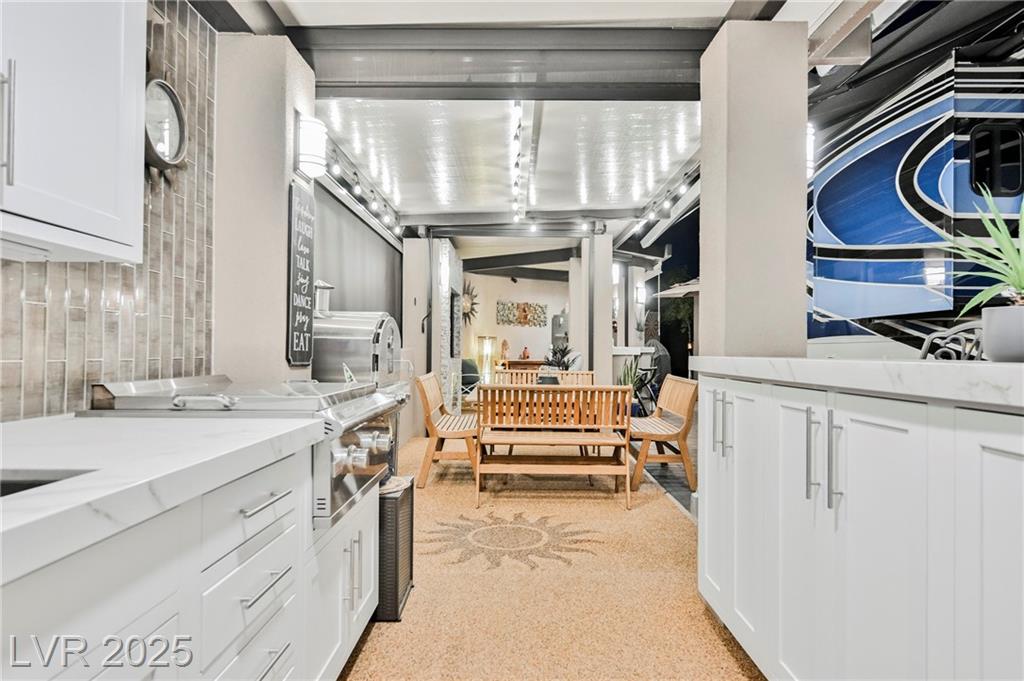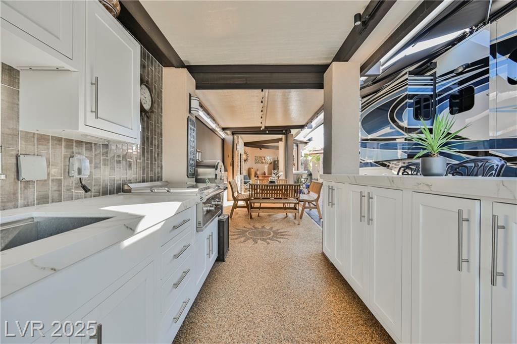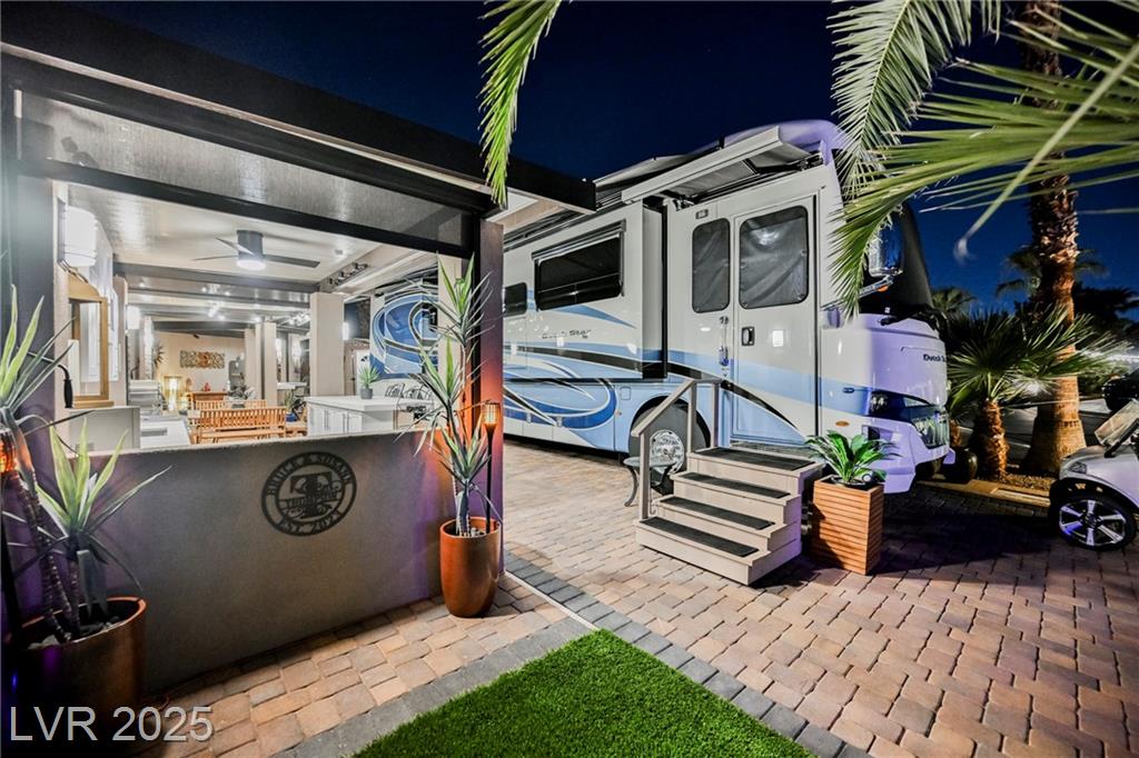Located in the 24 hour Guard Gated Las Vegas Motorcoach Resort, a Class A only facility. This private & highly sought after north facing lot boasts a Custom modern 2022 build out with a complete hard covered kitchen, living room and dining area! Also a separate building which houses a private bathroom & large storage area with full size washer and dryer. The kitchen consists of Challenger custom white cabinetry, Dekton countertops, Blaze 30"griddle and standalone Pizza/bakery oven. Living room with enclosed TV, 2nd bar also with Dekton counter and a full size refrigerator. Includes solar shades, fans, pebble stone floors in living areas and pavers on the RV Pad. LVMR Amenities include 5 pools, 6 spas, 4 laundry facilities, showers, Fitness Center and Clubhouse with owners lounge, bar ballroom, card room, theater, room pickleball, courts, putting green and much, much more!! Minutes from the famous Las Vegas strip! And conveniently located near shopping & restaurants. A MUST SEE!