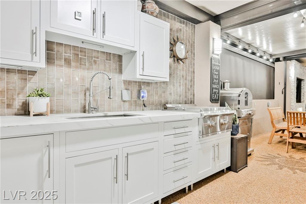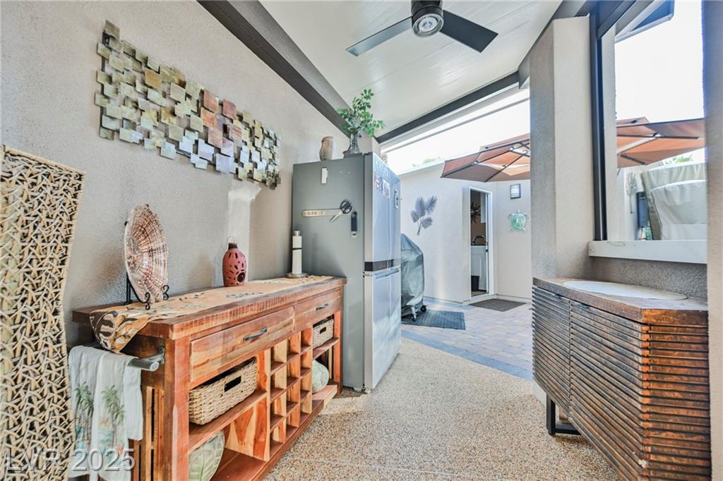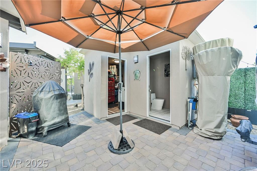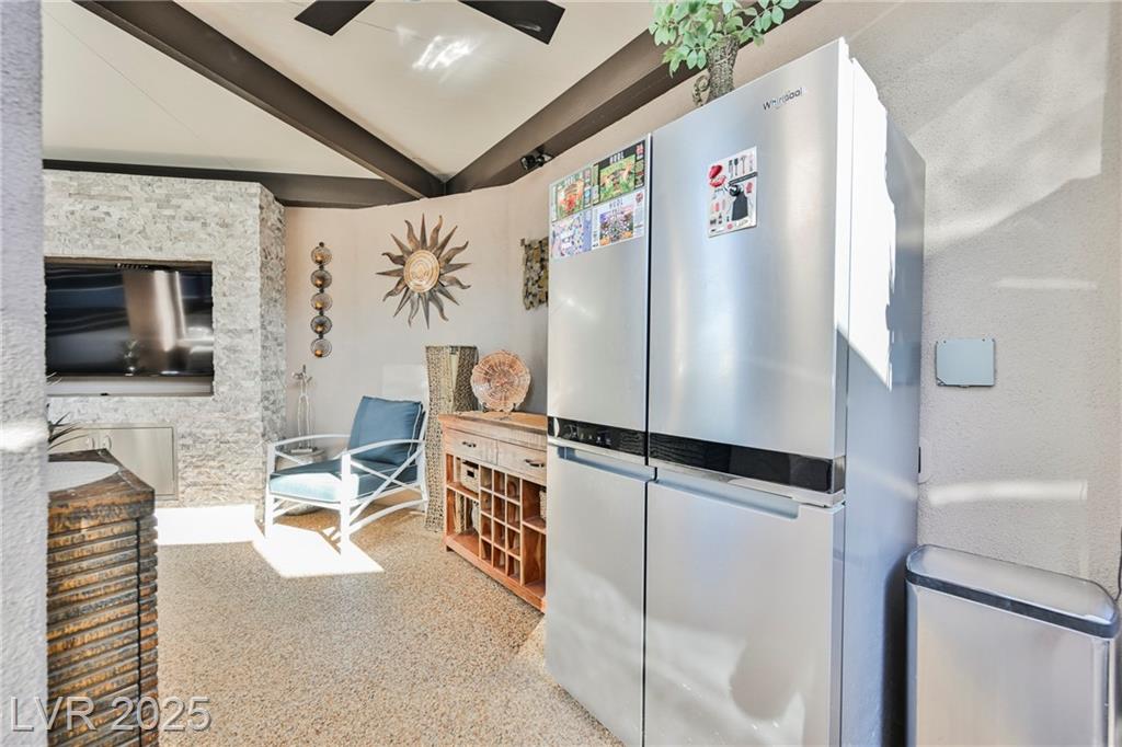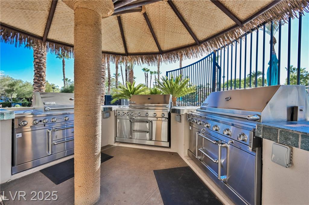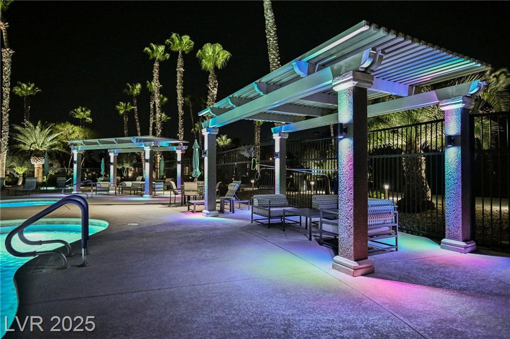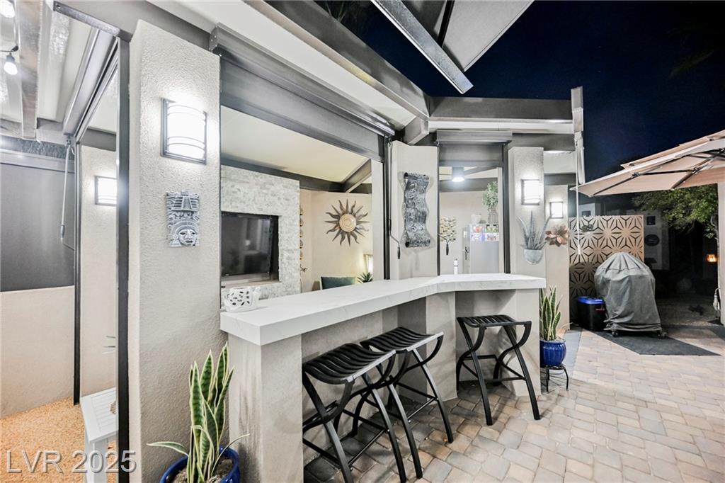 Located in the 24 hour Guard Gated Las Vegas Motorcoach Resort, a Class A only facility. This private & highly sought after north facing lot boasts a Custom modern 2022 build out with a complete hard covered kitchen, living room and dining area! Also a separate building which houses a private bathroom & large storage area with full size washer and dryer. The kitchen consists of Challenger custom white cabinetry, Dekton countertops, Blaze 30"griddle and standalone Pizza/bakery oven. Living room with enclosed TV, 2nd bar also with Dekton counter and a full size refrigerator. Includes solar shades, fans, pebble stone floors in living areas and pavers on the RV Pad. LVMR Amenities include 5 pools, 6 spas, 4 laundry facilities, showers, Fitness Center and Clubhouse with owners lounge, bar ballroom, card room, theater, room pickleball, courts, putting green and much, much more!! Minutes from the famous Las Vegas strip! And conveniently located near shopping & restaurants. A MUST SEE!