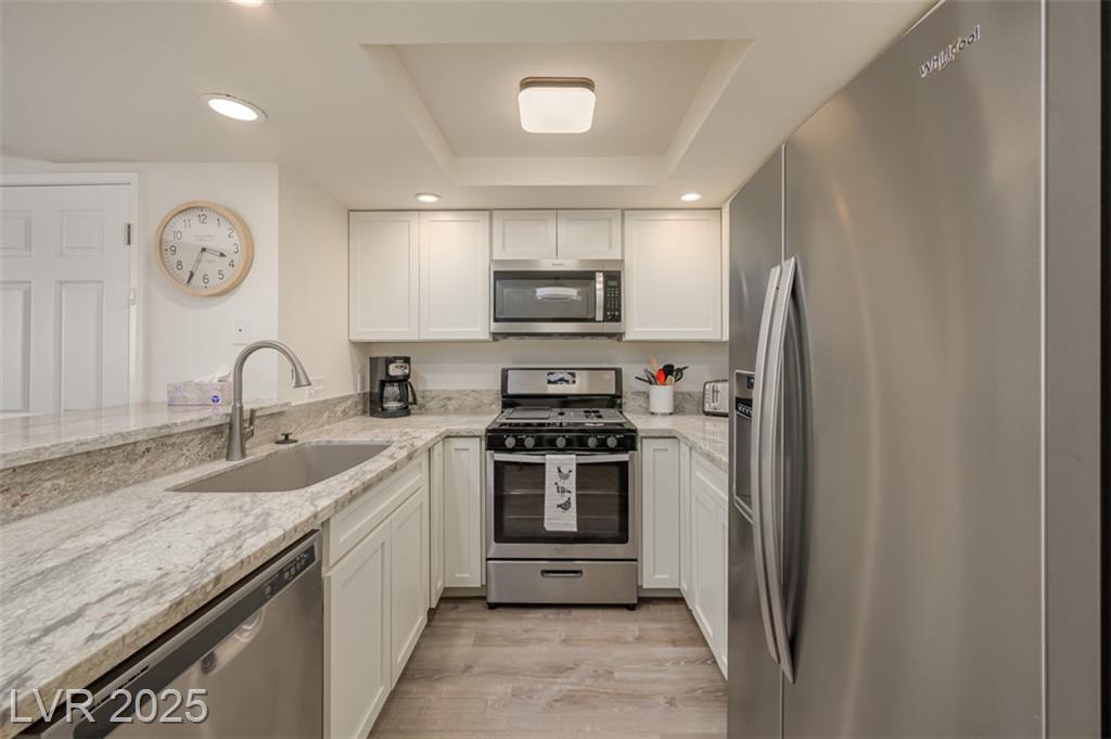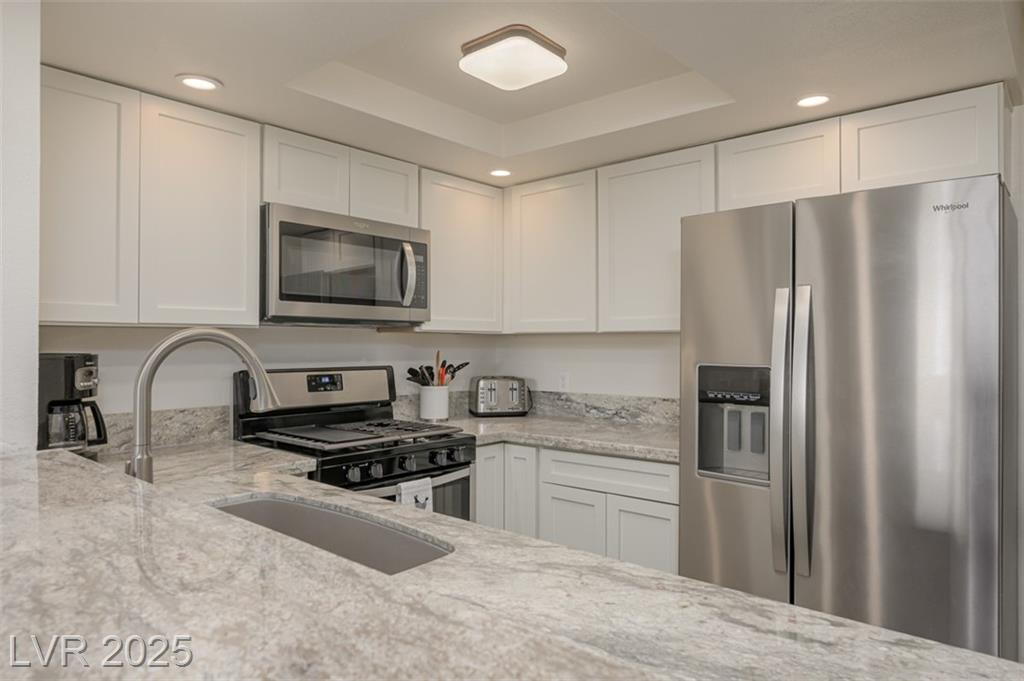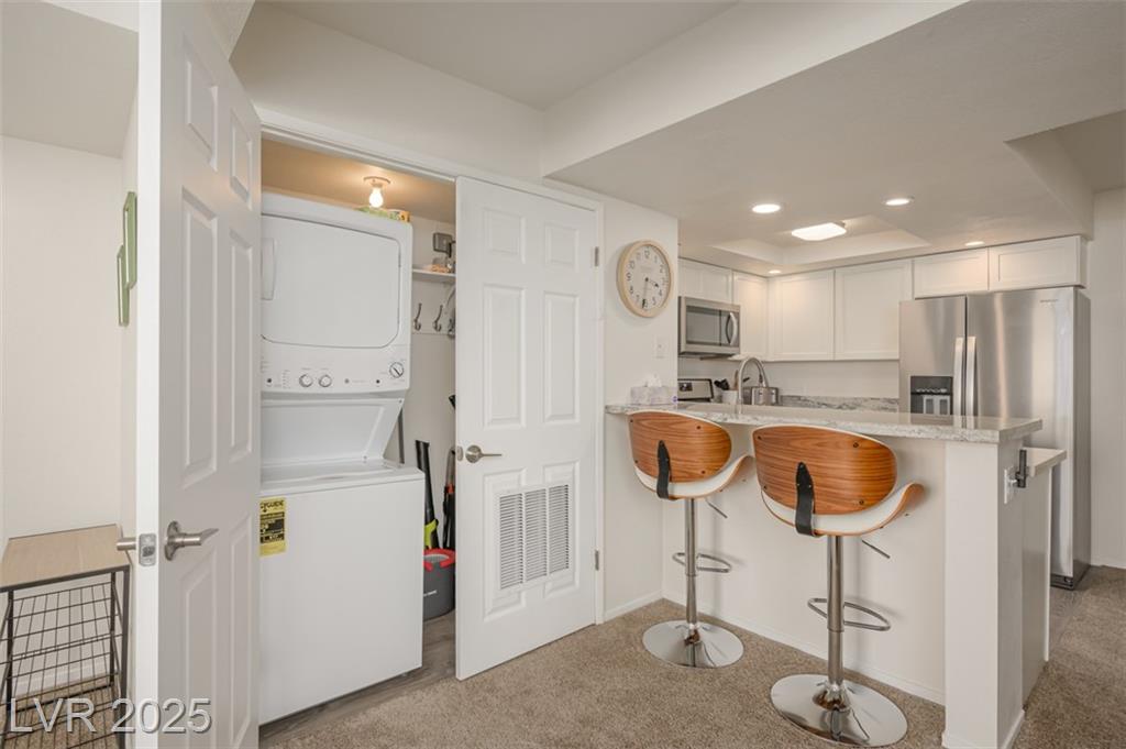 Searching for an ideal home in Nevada? This beautifully updated and completely furnished 2 bedroom, 1 bath first-floor condo at Laughlin Bay Village is a must-see! Pack your essentials and step into your new home. Exquisite finishes throughout, including a newly remodeled kitchen with recessed lighting, stainless steel appliances, soft-close cabinets, lazy Susans, Blanco sink, and elegant countertops with breakfast bar. Indulge in a spa-like bathroom with new tub/shower, vanity, heated LED mirror, and soothing ambient lighting. Enjoy a California King bed in one room and a queen bed in the other. Enjoy the convenient new in-unit washer/dryer and detached garage with new opener. Four pools, relaxing spas, spacious BBQ areas, and RV/boat parking, make living here effortless. The HOA covers water, sewer, and trash. Just minutes from Laughlin’s casinos, shopping, and dining, with the stunning Colorado River nearby! Don’t miss this opportunity to live the lifestyle you’ve always wanted!