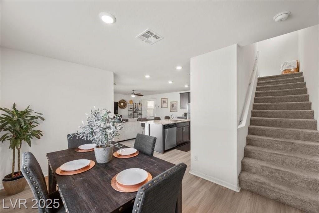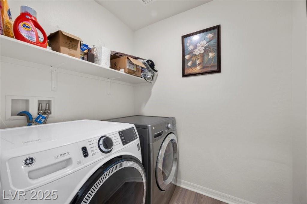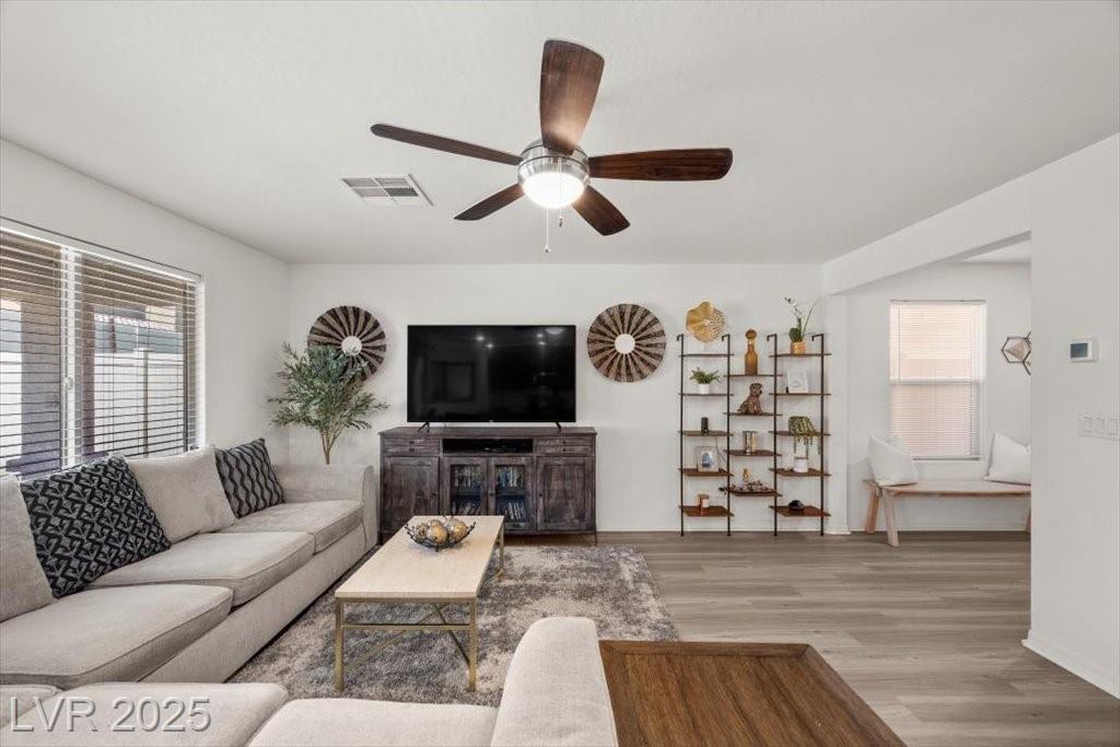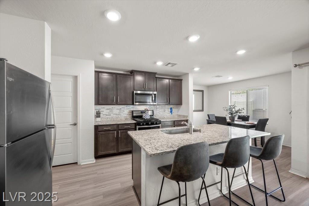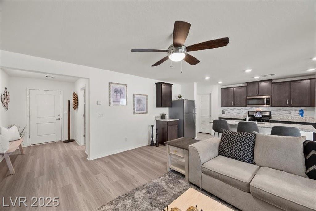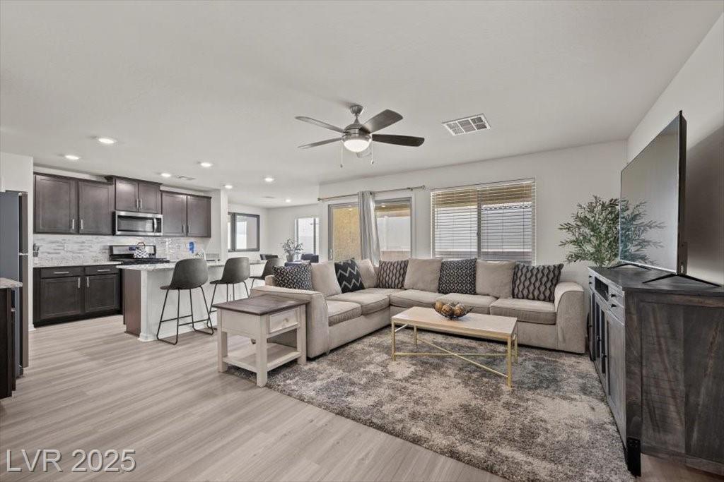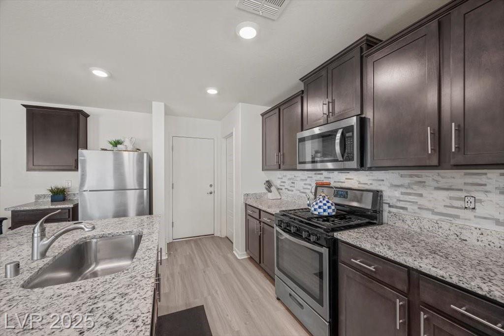 Envision yourself in this stunning, nearly-new North Las Vegas cul-de-sac beauty, where modern vibes meet cozy comfort. Walk into a wide-open living space with sleek LVP floors, fresh paint, and crisp new window coverings. The kitchen’s a total showstopper—think granite countertops, tall 42" cabinets, a fresh backsplash, and a large island that seats four, complete with a convenient, single basin sink and upgraded faucet. Upstairs, you’ve got roomy secondary bedrooms and a primary closet so huge it’ll blow your mind. The backyard? Low-maintenance perfection with a covered patio, artificial turf, and modern pavers—great for relaxing or entertaining. The garage has fresh epoxy flooring. This place is move-in ready, packed with upgrades, and sitting pretty in a lively neighborhood close to restaurants and grocery. Plus, this seller is willing to help out with your closing costs! Come check it out and fall in love!
