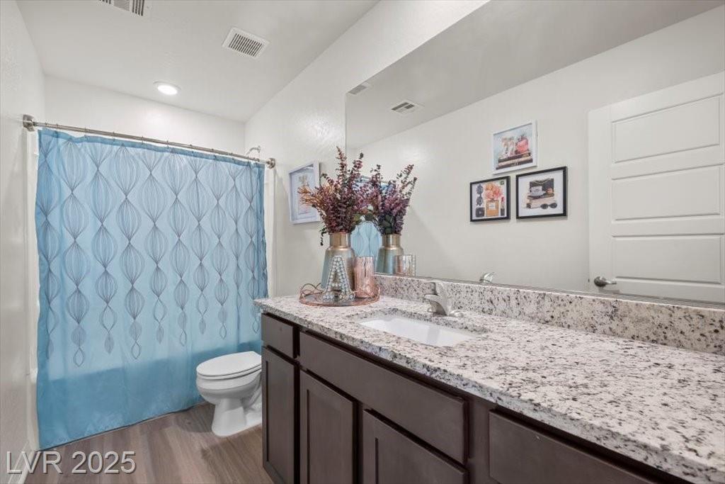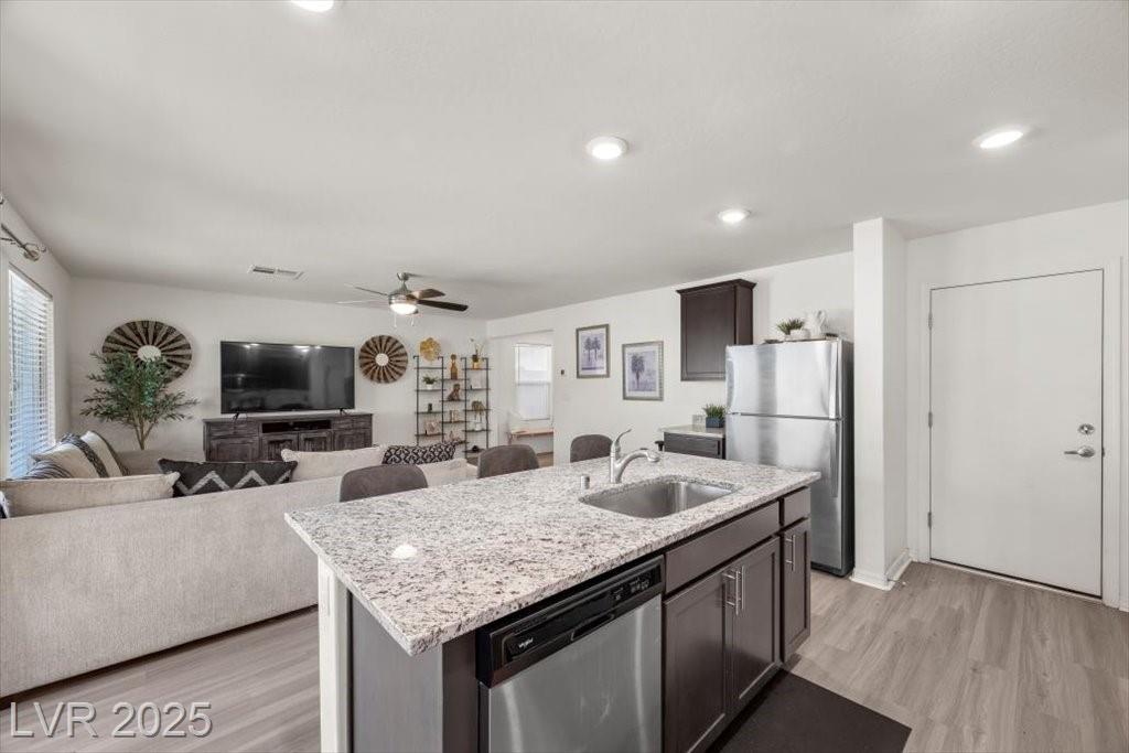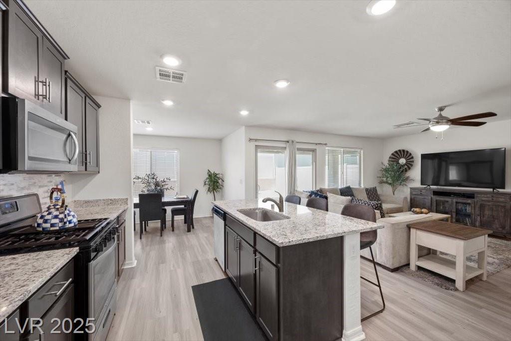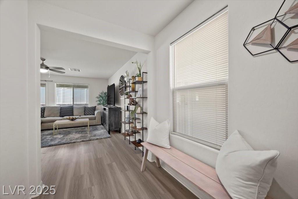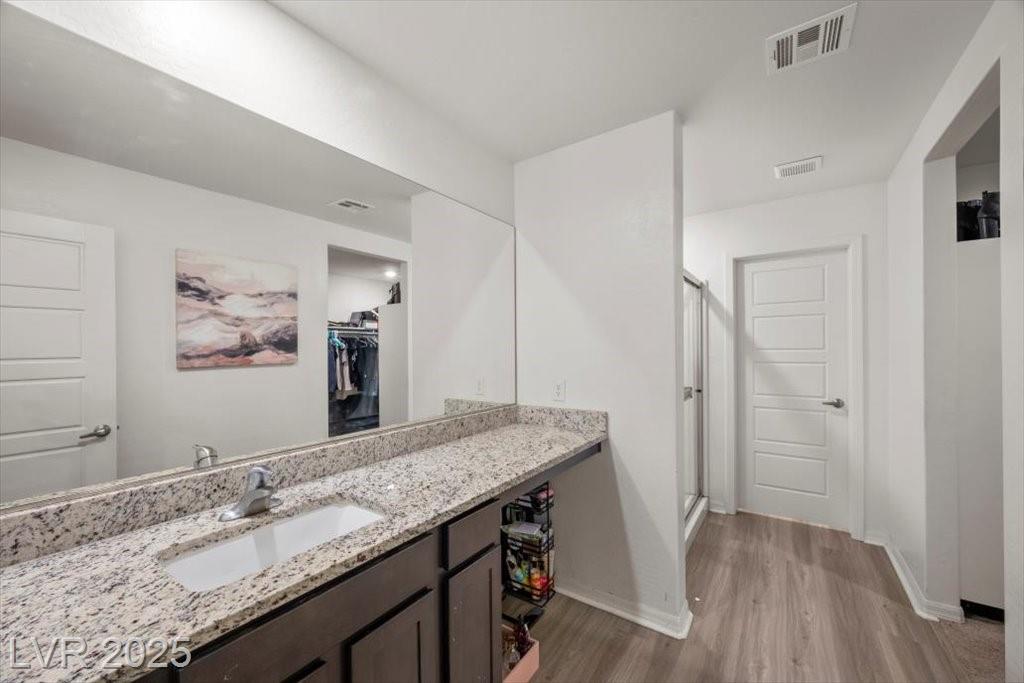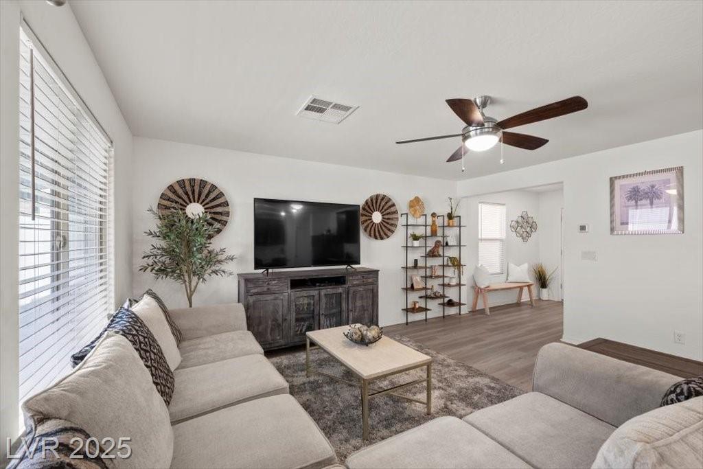 Envision yourself in this stunning, nearly-new North Las Vegas cul-de-sac beauty, where modern vibes meet cozy comfort. Walk into a wide-open living space with sleek LVP floors, fresh paint, and crisp new window coverings. The kitchen’s a total showstopper—think granite countertops, tall 42" cabinets, a fresh backsplash, and a large island that seats four, complete with a convenient, single basin sink and upgraded faucet. Upstairs, you’ve got roomy secondary bedrooms and a primary closet so huge it’ll blow your mind. The backyard? Low-maintenance perfection with a covered patio, artificial turf, and modern pavers—great for relaxing or entertaining. The garage has fresh epoxy flooring. This place is move-in ready, packed with upgrades, and sitting pretty in a lively neighborhood close to restaurants and grocery. Plus, this seller is willing to help out with your closing costs! Come check it out and fall in love!