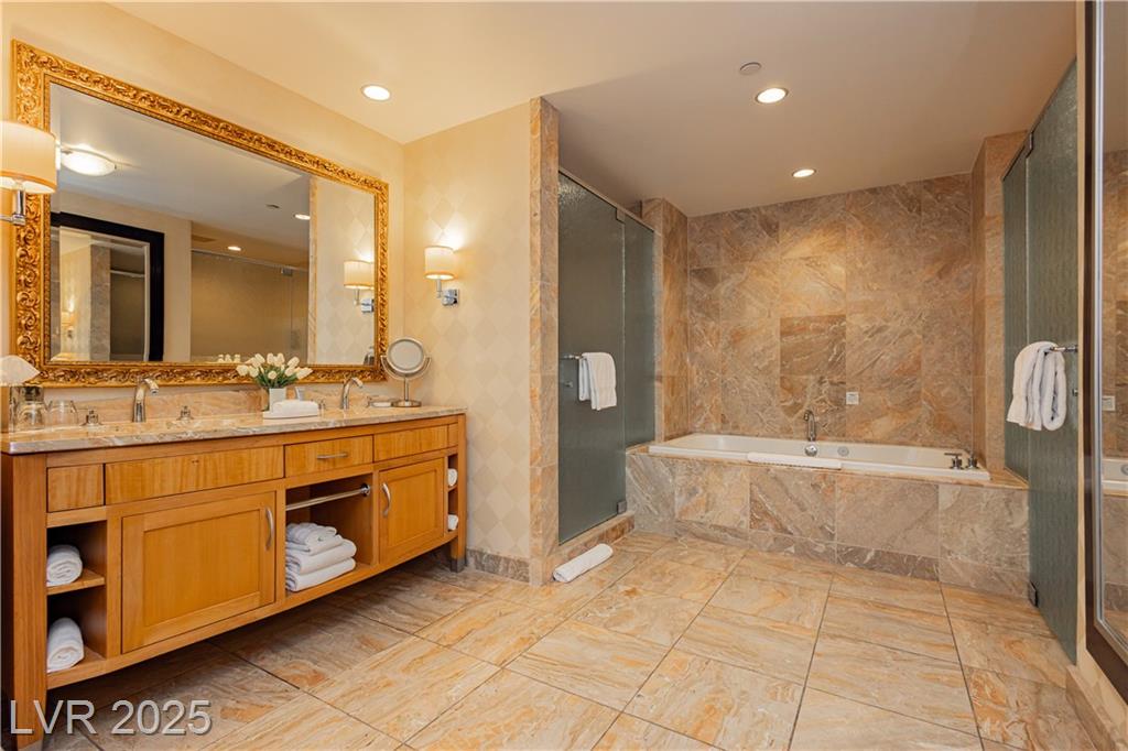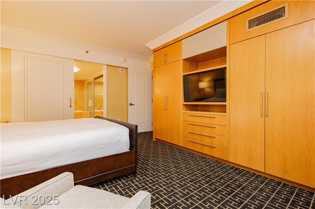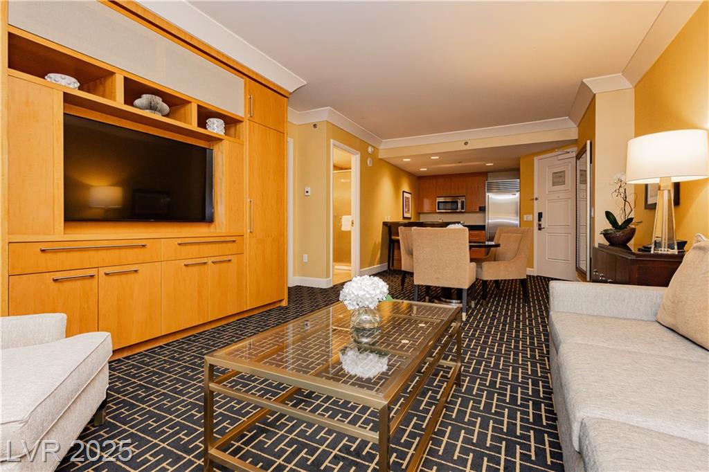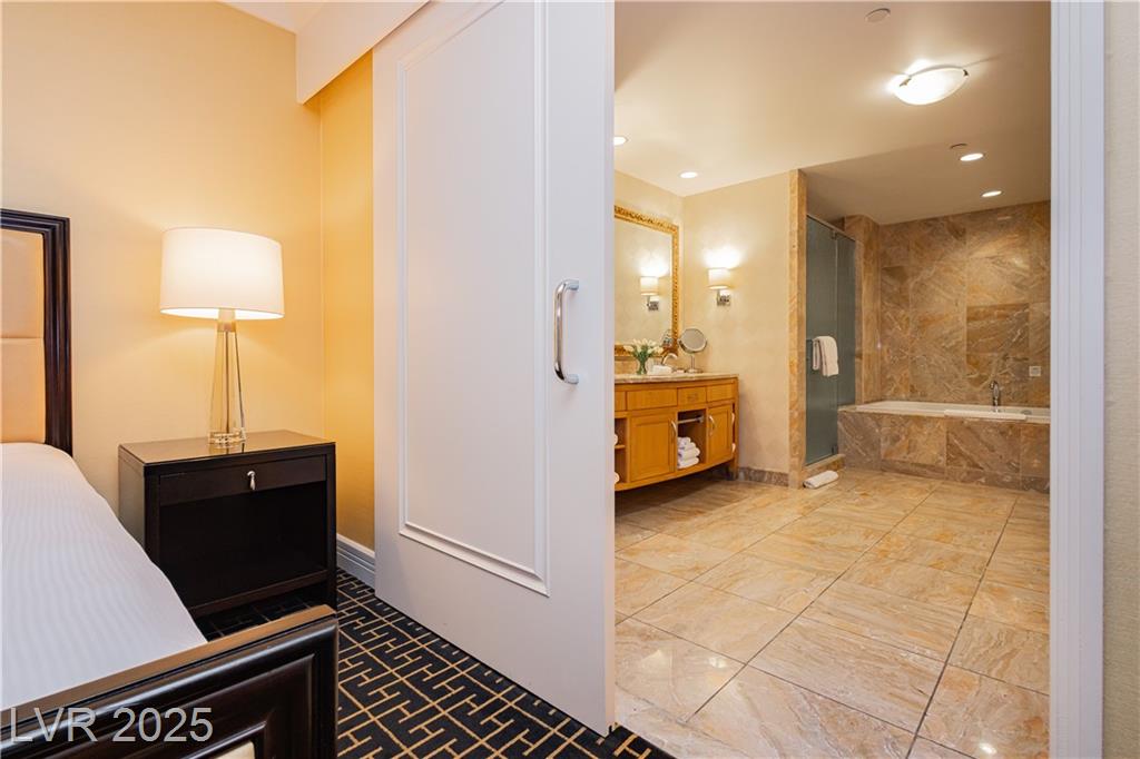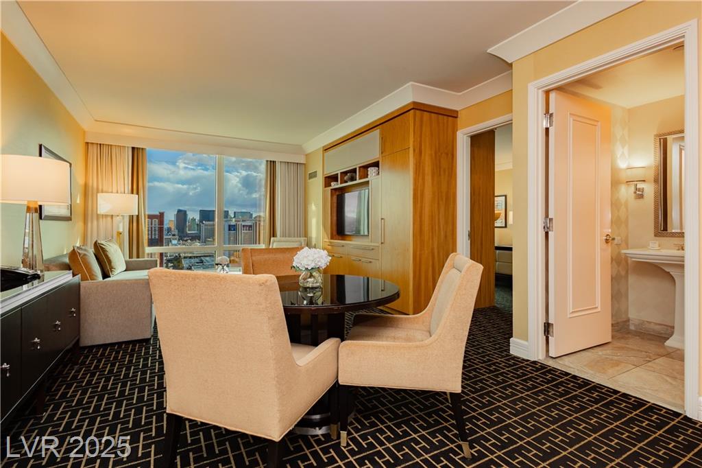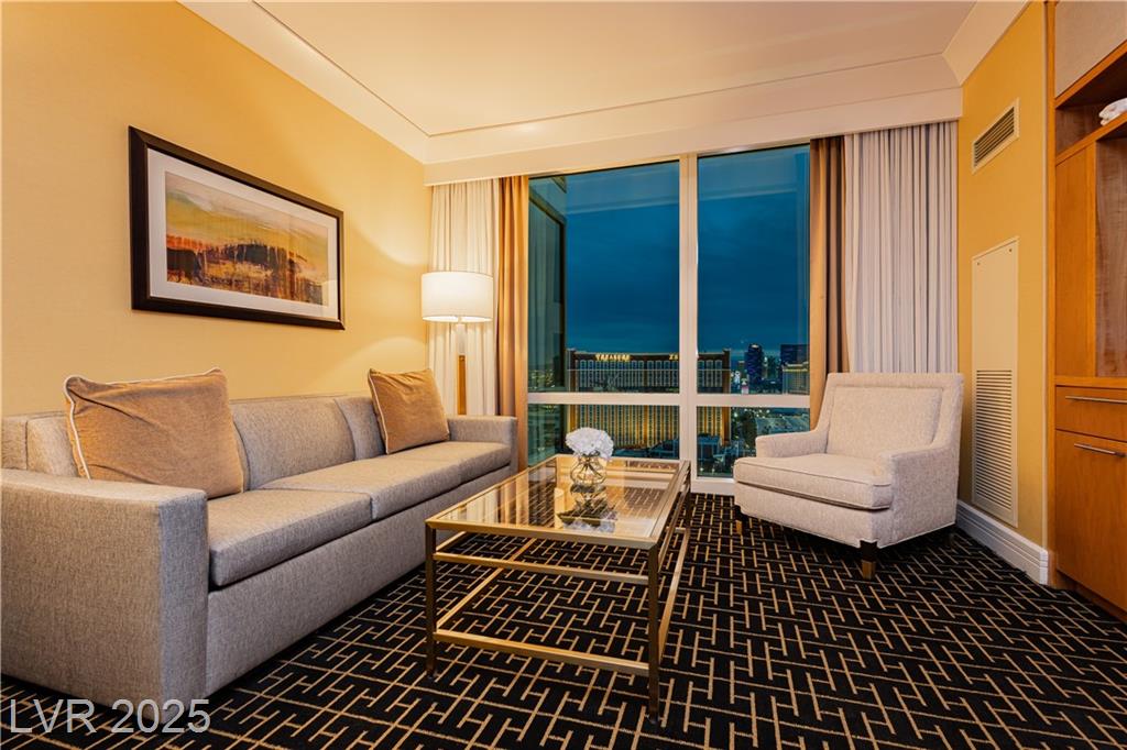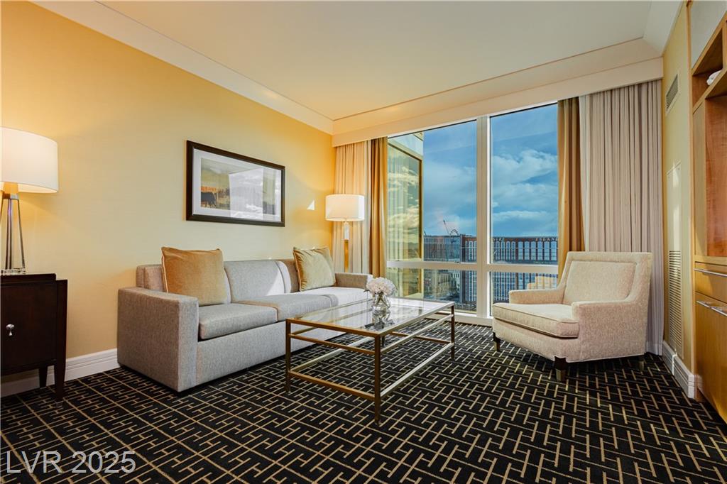 Experience unparalleled luxury and breathtaking views from this 910 square-foot condominium in the renowned Trump Las Vegas Residences. Floor-to-ceiling windows display captivating panoramic vistas of the Las Vegas Strip, including the iconic Sphere and shimmering city skyline. This sophisticated 1-bedroom, 2-bathroom residence boasts an impeccably designed gourmet kitchen, featuring top-of-the-line appliances, ideal for the discerning chef. Unwind and rejuvenate in the primary bathroom, a tranquil oasis with elegant marble flooring and countertops, dual vanities, and a luxurious six-foot soaking tub. Indulge in a world of refined opulence, quality, and comfort in this remarkable Las Vegas home.