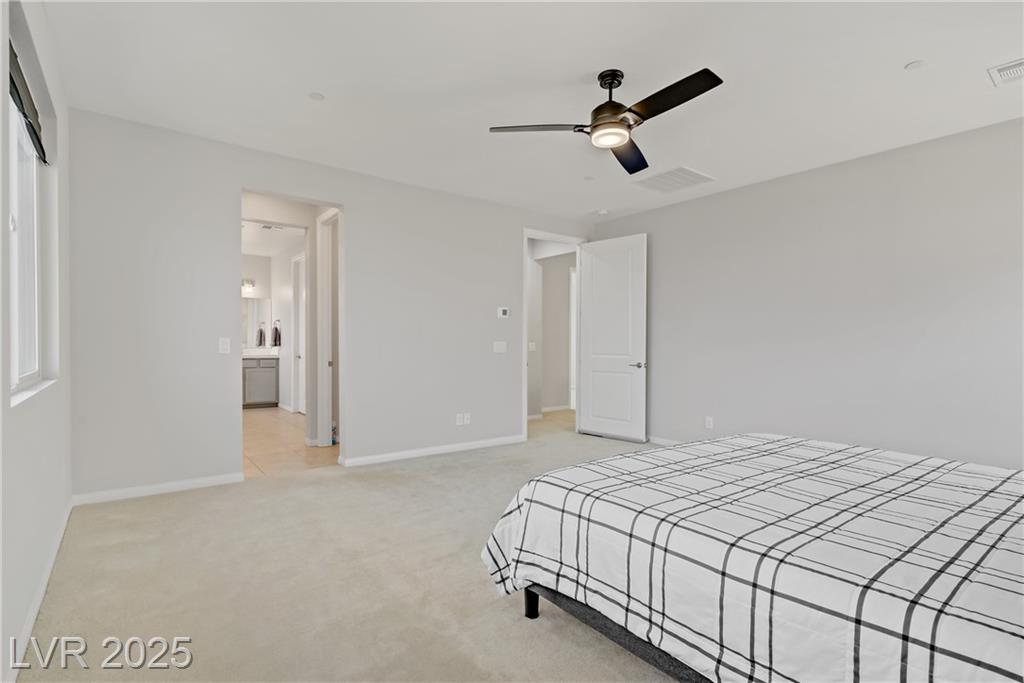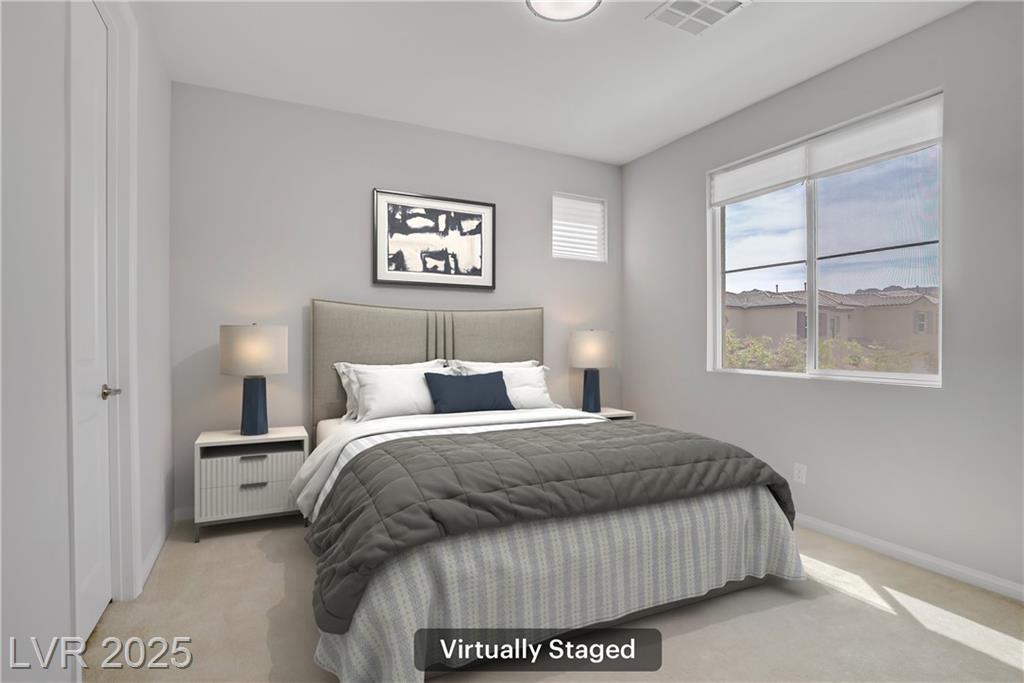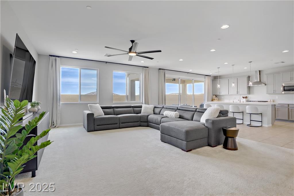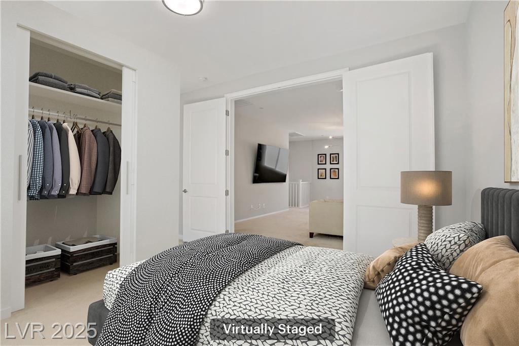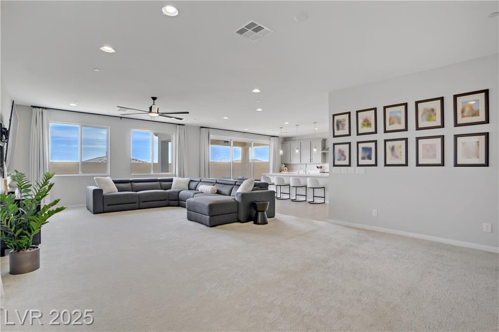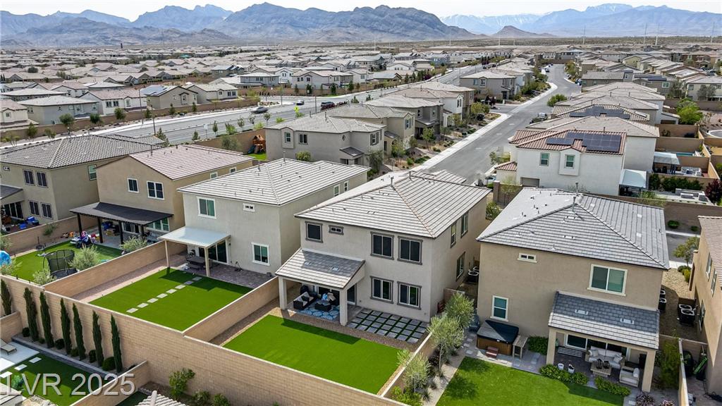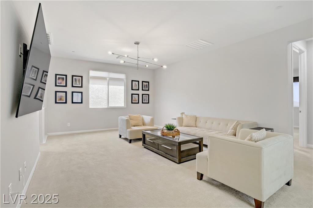 Stunning 3 year old Century home featuring unobstructed STRIP, CITY & MOUNTAIN VIEWS located in the beautiful gated community of Cantaro in Skye Canyon. This immaculate 3000 sq ft home features a 2 car + Tandem garage, 3 bedrooms, large loft, and laundry room upstairs as well as a den/office upstairs which could easily be converted to a bedroom. The spacious kitchen features and oversized island with quartz countertops, 42” upper cabinets, stainless steel appliances and more! The low maintenance pool sized backyard features pavers, artificial grass, patio cover and all single story homes directly behind! You will have full access to the Skye Canyon Community Center featuring a state-of-the-art fitness center, pool, spa, splash pad, park, pickleball, coffee shop & more! 25 minutes from Mount Charleston, and just minutes from shopping, parks, and fine dining!