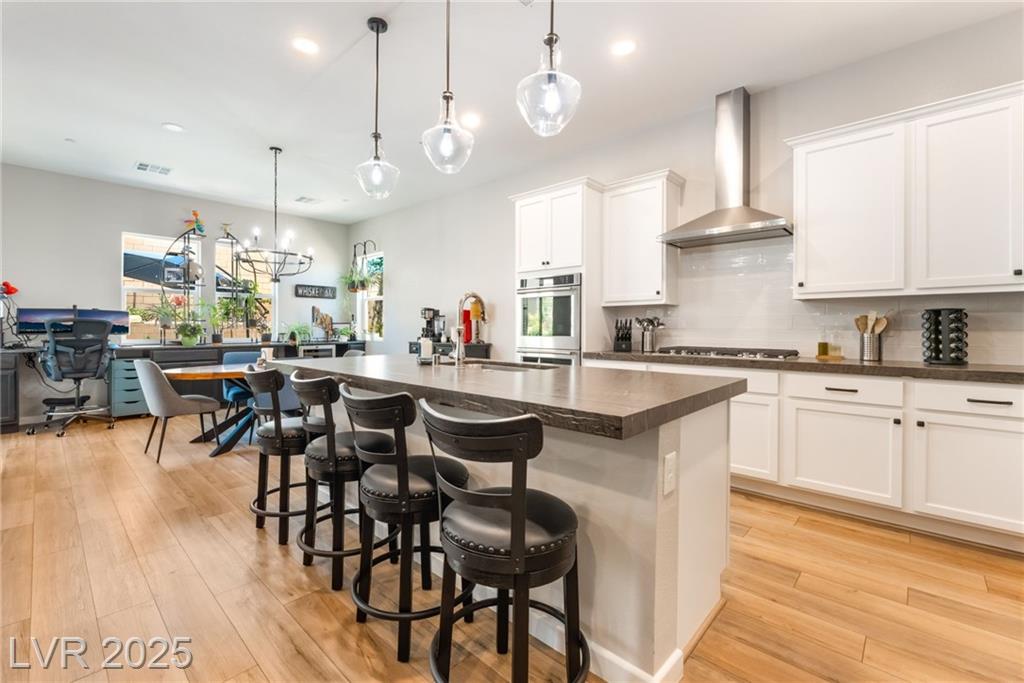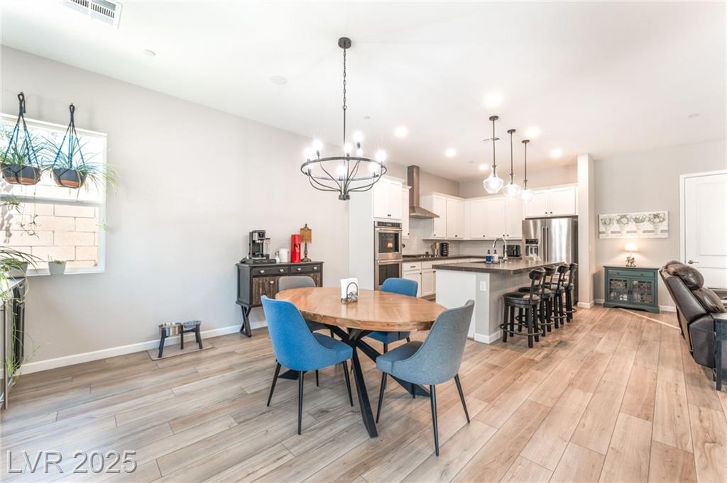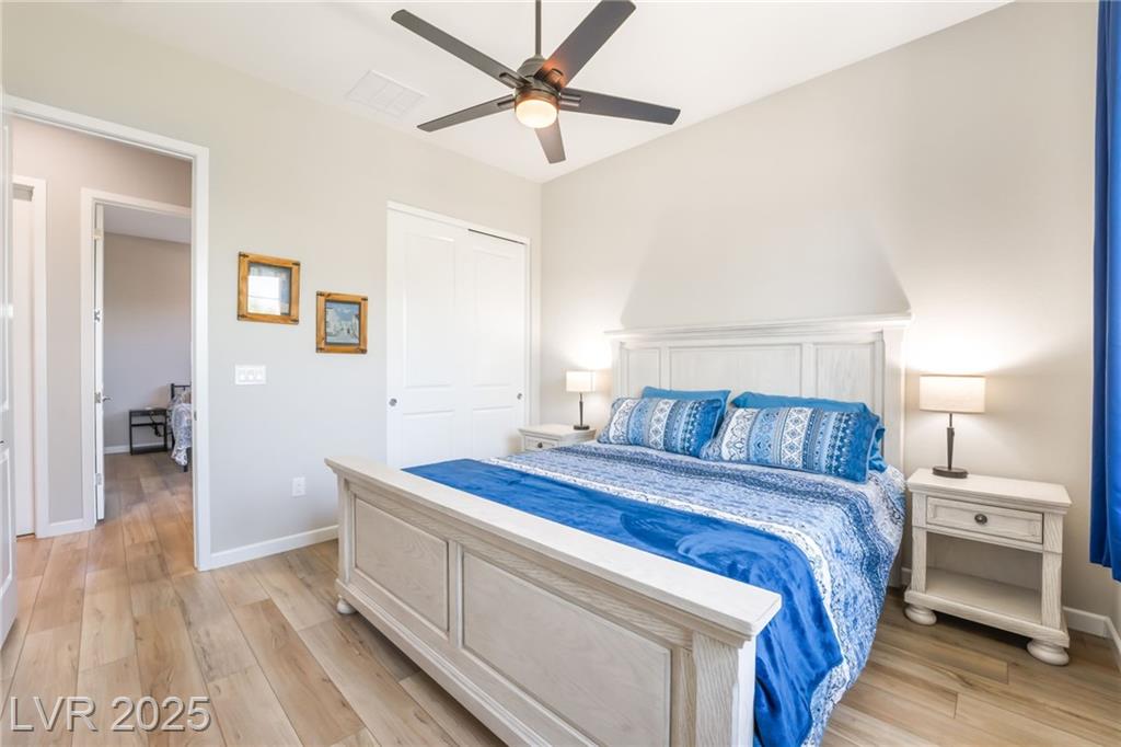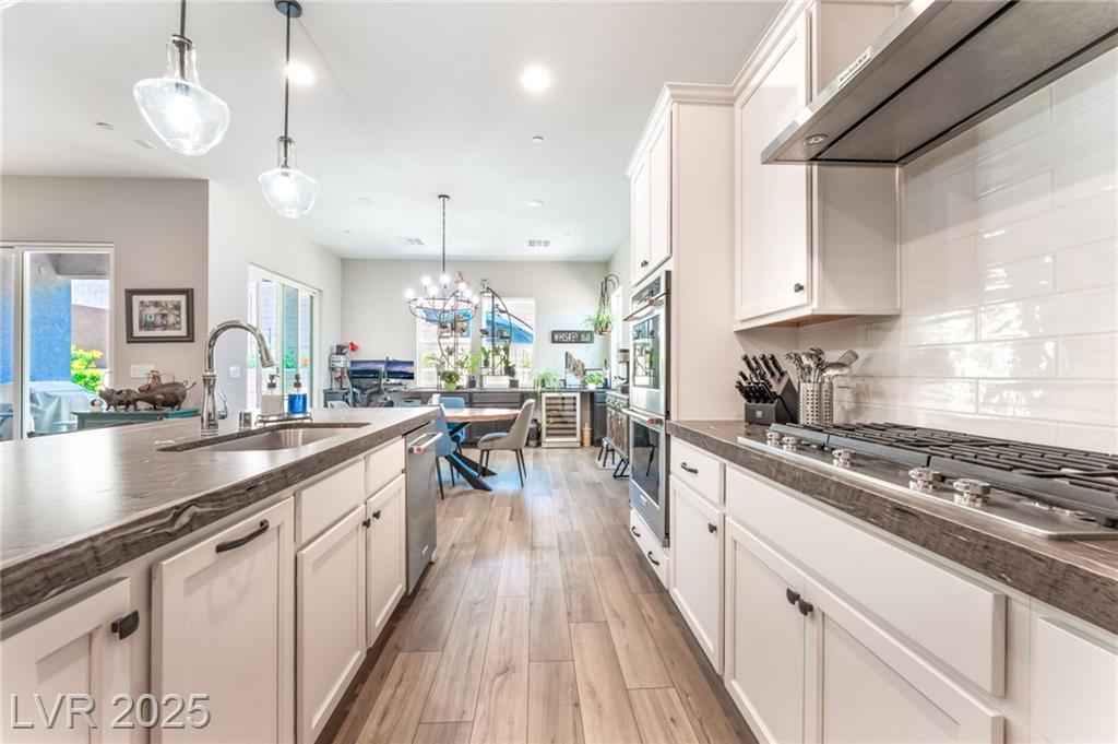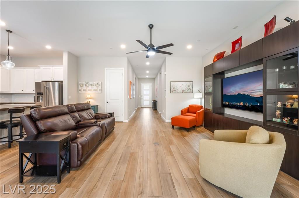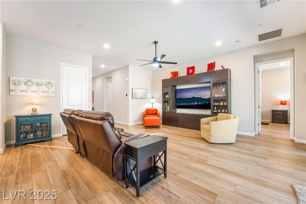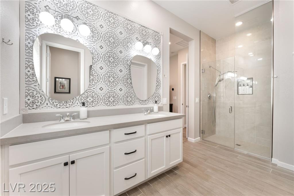 Welcome to this stunning single-level home nestled in the prestigious, gated community of Skye Canyon. Conveniently located near shopping, dining, and freeway access, this 3-bedroom, 2.5-bathroom residence offers a spacious 3-car tandem garage and an open-concept design perfect for modern living. Step inside to find beautiful LVP and tile flooring throughout, a generous laundry room with a sink, and a water softener. The chef’s kitchen boasts stainless steel appliances, dual ovens, a walk-in pantry, and ample cabinetry. The primary suite is a true retreat with a walk-in closet featuring built-in shelving, dual vanities, and a glass-enclosed shower with floor-to-ceiling tile. Enjoy the outdoors in a thoughtfully landscaped backyard with a covered patio, pavers, and low-maintenance artificial turf—perfect for relaxing or entertaining. As a resident, you’ll have access to the Skye Canyon Community Center with top-tier amenities. Don’t miss the chance to call this your new home!