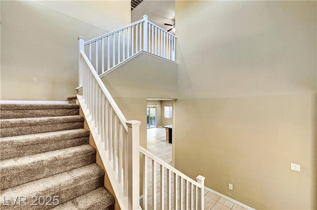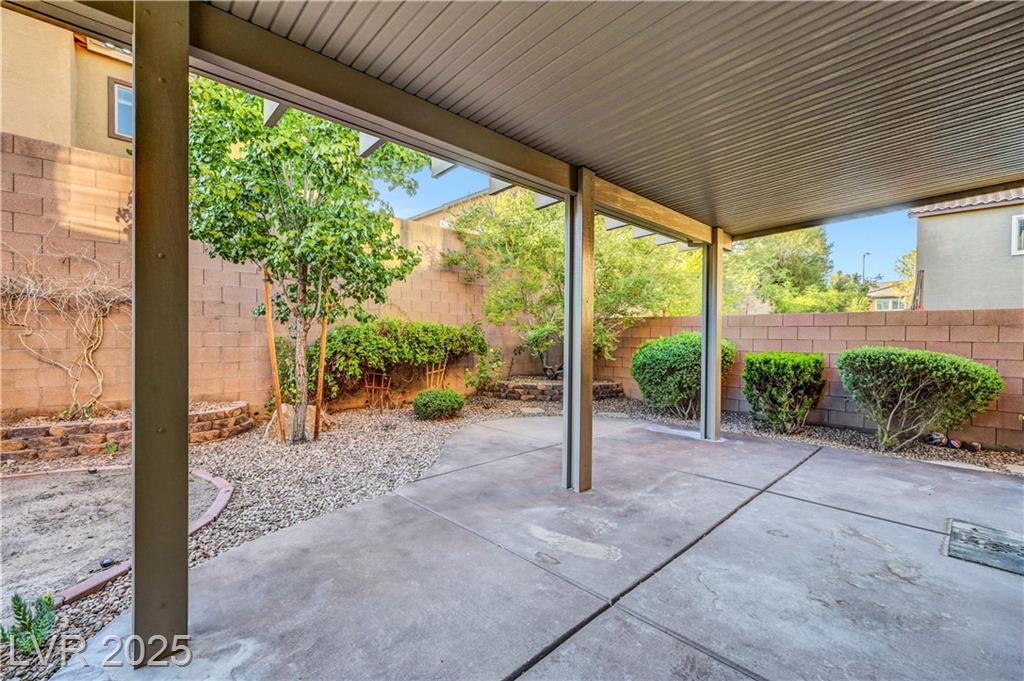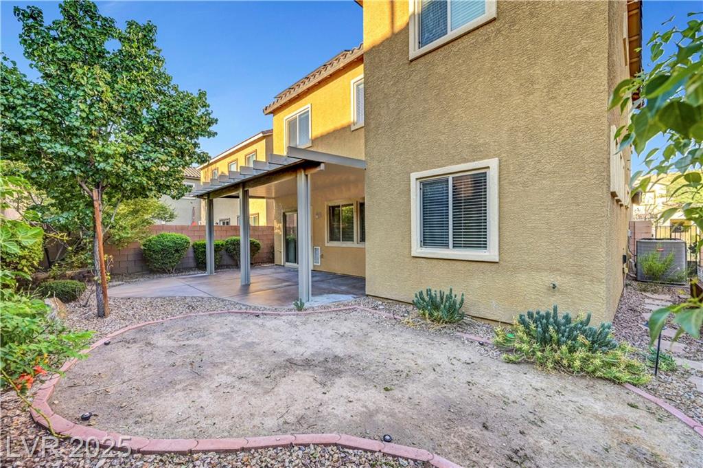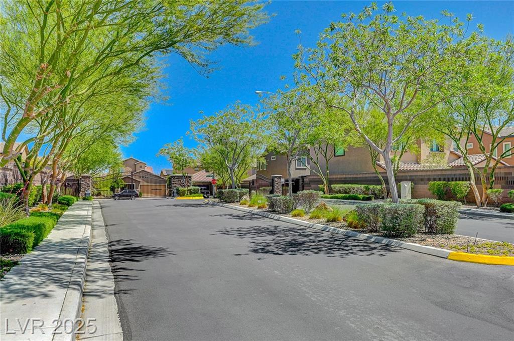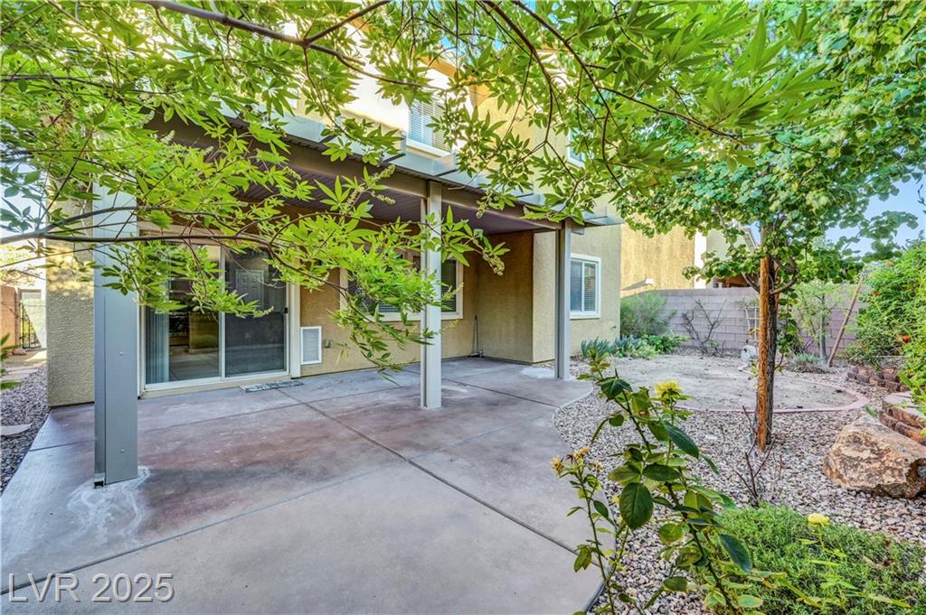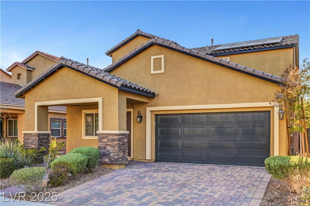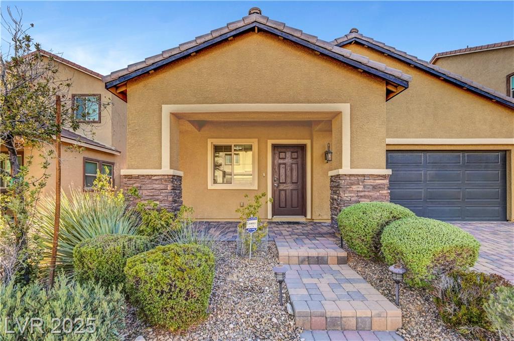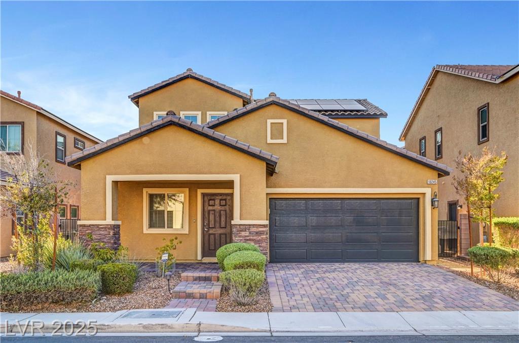 A cozy 2-story gated community home located in the heart of Mountain's Edge nearby friendly neighborhood parks and beautiful Paseos & walking trails. Functional home design layout with extensive storage spaces and walk-in closets, a separate living area for cozy gatherings, a wide-open kitchen, nook, great room and a downstairs bedroom perfect for guest stayover. Upstairs layout has a spacious primary BR, a good size 2nd BR, laundry room, and loft for office area. Home offers fresh interior paint, beautiful ceramic flooring, granite counter tops, modern kitchen backsplash, cabinets, blinds, and ceiling fans, energy efficient appliances, a cover patio, water softner, and owned solar panels. A simple modern exterior look with paver stones throughout the driveway and front entrance and a sizeable porch for outdoor seating. Minimal landscaping with planted shrubs and trees. Smart home package equipped with smart thermostat, alarm system, garage opener, sprinkler, and door-bell camera.