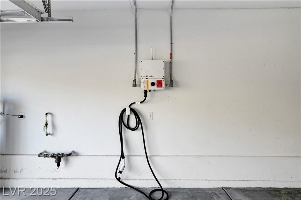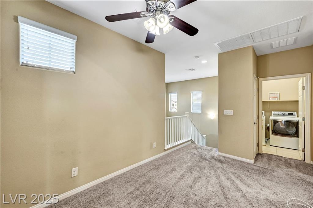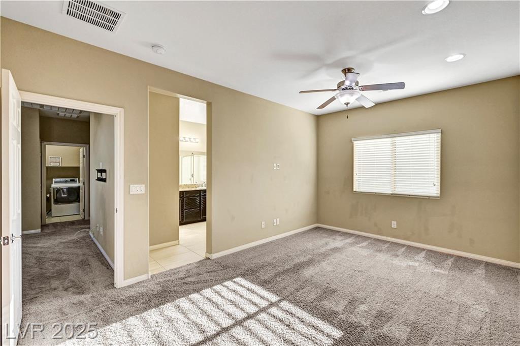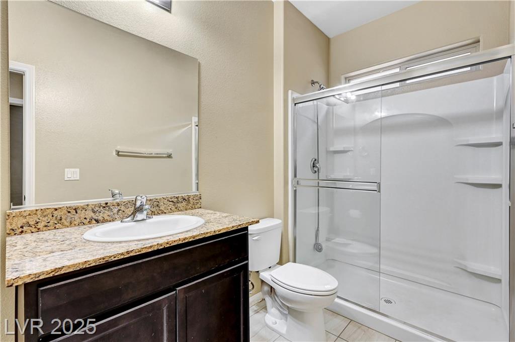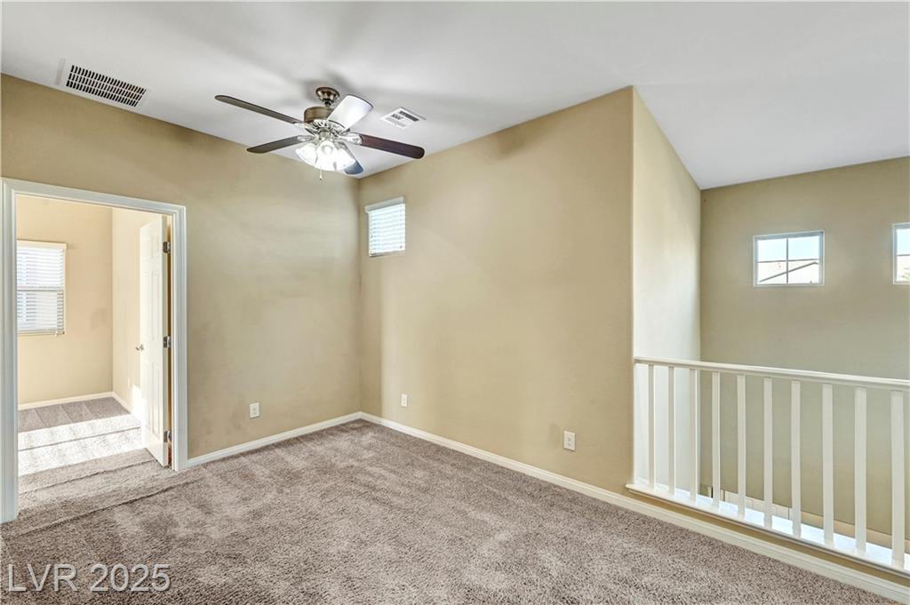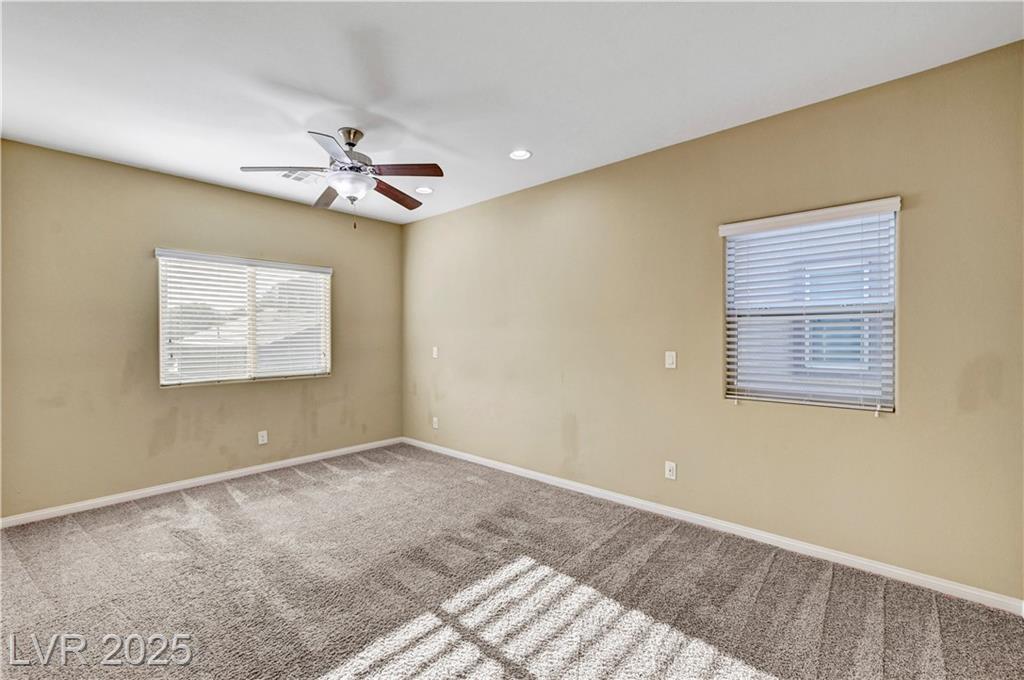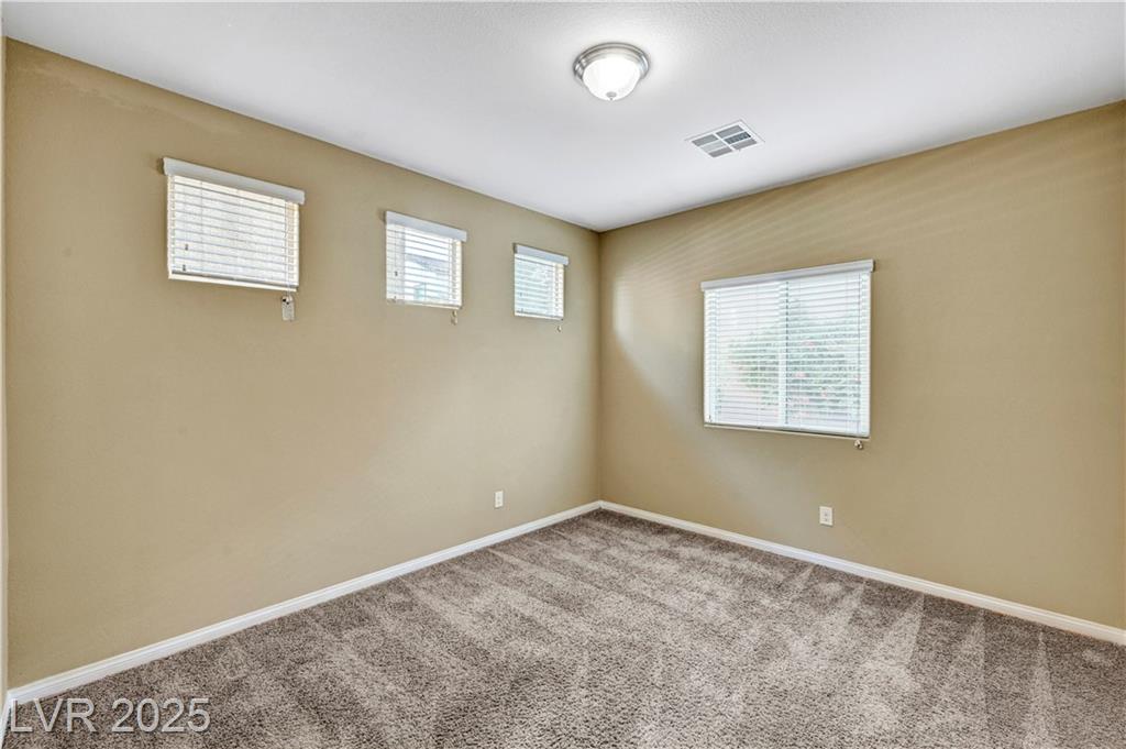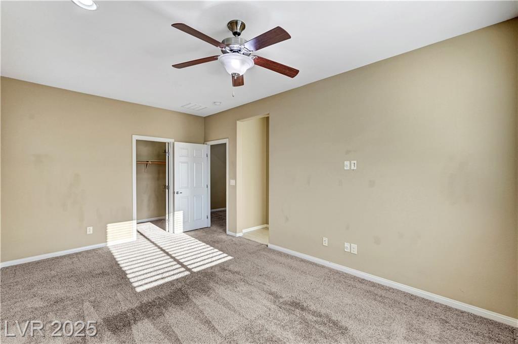 A cozy 2-story gated community home located in the heart of Mountain's Edge nearby friendly neighborhood parks and beautiful Paseos & walking trails. Functional home design layout with extensive storage spaces and walk-in closets, a separate living area for cozy gatherings, a wide-open kitchen, nook, great room and a downstairs bedroom perfect for guest stayover. Upstairs layout has a spacious primary BR, a good size 2nd BR, laundry room, and loft for office area. Home offers fresh interior paint, beautiful ceramic flooring, granite counter tops, modern kitchen backsplash, cabinets, blinds, and ceiling fans, energy efficient appliances, a cover patio, water softner, and owned solar panels. A simple modern exterior look with paver stones throughout the driveway and front entrance and a sizeable porch for outdoor seating. Minimal landscaping with planted shrubs and trees. Smart home package equipped with smart thermostat, alarm system, garage opener, sprinkler, and door-bell camera.