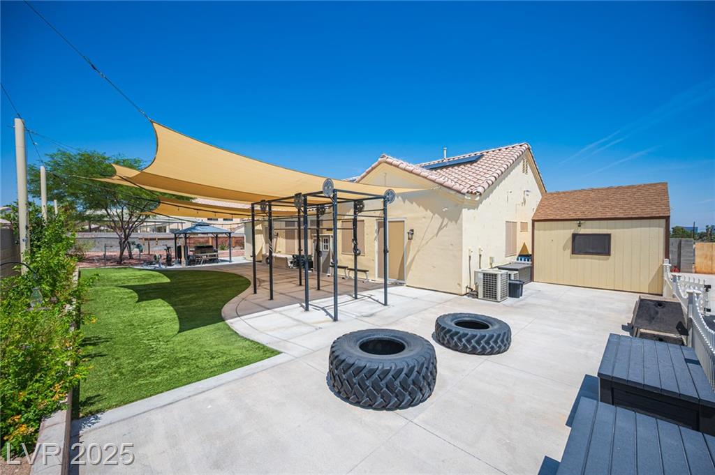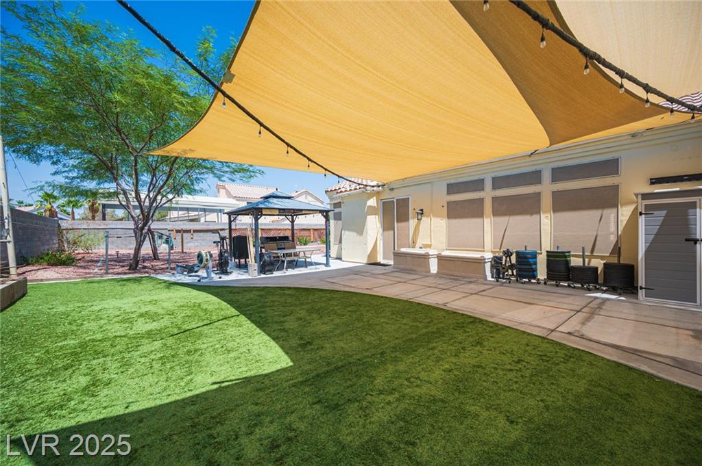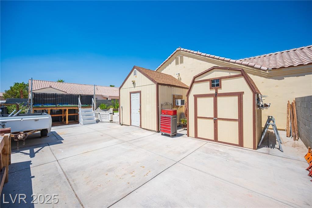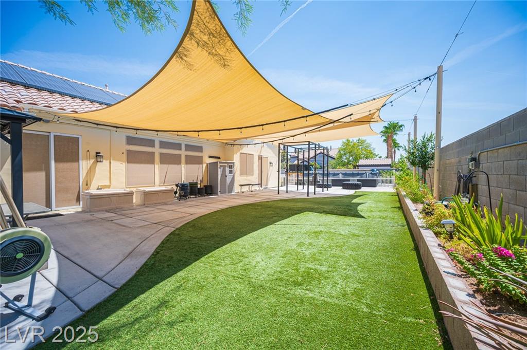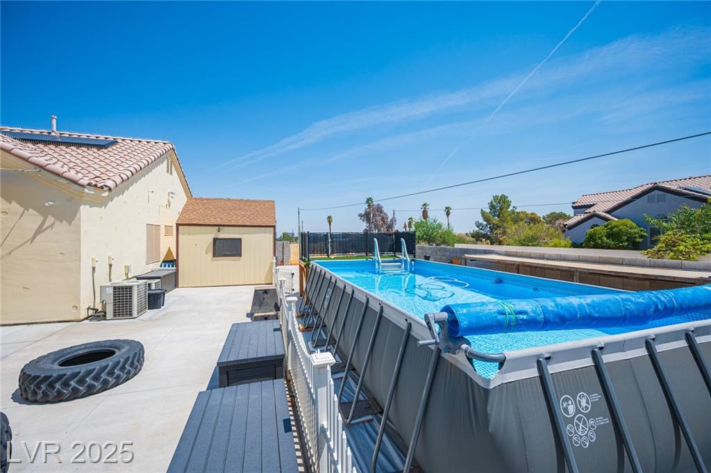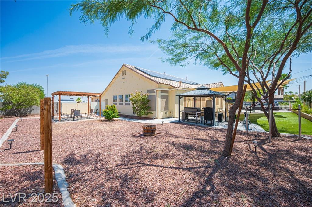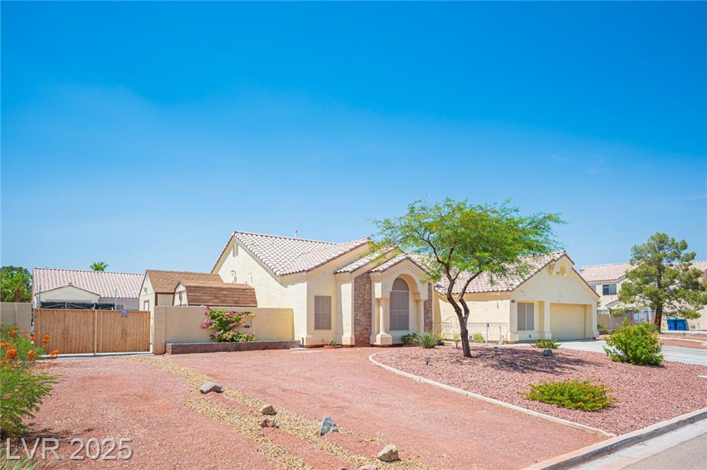 Pride of ownership shines in this immaculate single-story 5 bed, 3 bath home on a spacious 1/3 acre lot with no HOA. Interior features tile plank & marble flooring, upgraded white cabinetry, plantation shutters, and all appliances included. Energy efficient with solar panels, solar screens, and a brand new water heater. Garage features a temperature controlled exhaust fan plus gated RV parking. Potential for additional RV on other side of the home. Backyard offers the perfect combination of desert landscaping and turf, along with a fully insulated workshop with electrical & AC, additional shed, shaded above-ground pool with upgraded filter, and plenty of space for pets, gardening, or hobbies. Includes hardwired alarm system, security cameras, water softener & RO system. Beautiful front courtyard and multiple awnings create inviting outdoor spaces. This home is ready for you to move in and enjoy!