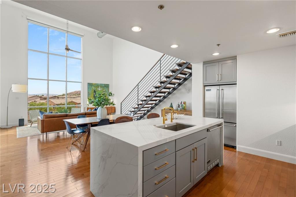 This recently remodeled 2,547 sqft, 3 bed, 3 bath stylish loft is conveniently located minutes away from Downtown Summerlin, Red Rock Casino and the Las Vegas Baseball Park. Featuring a double master floor plan, one downstairs and one upstairs, a third bedroom can also be utilized as a home office. Built by renowned Christopher Homes, every detail reflects quality craftsmanship and modern elegance. A rare corner unit offering both mountain and city views, it combines open-concept elegance with unbeatable walkability to Downtown Summerlin’s dining, shopping, and entertainment. If you are looking for contemporary loft living in the heart of Summerlin that is safe, secure, and convenient, this is it