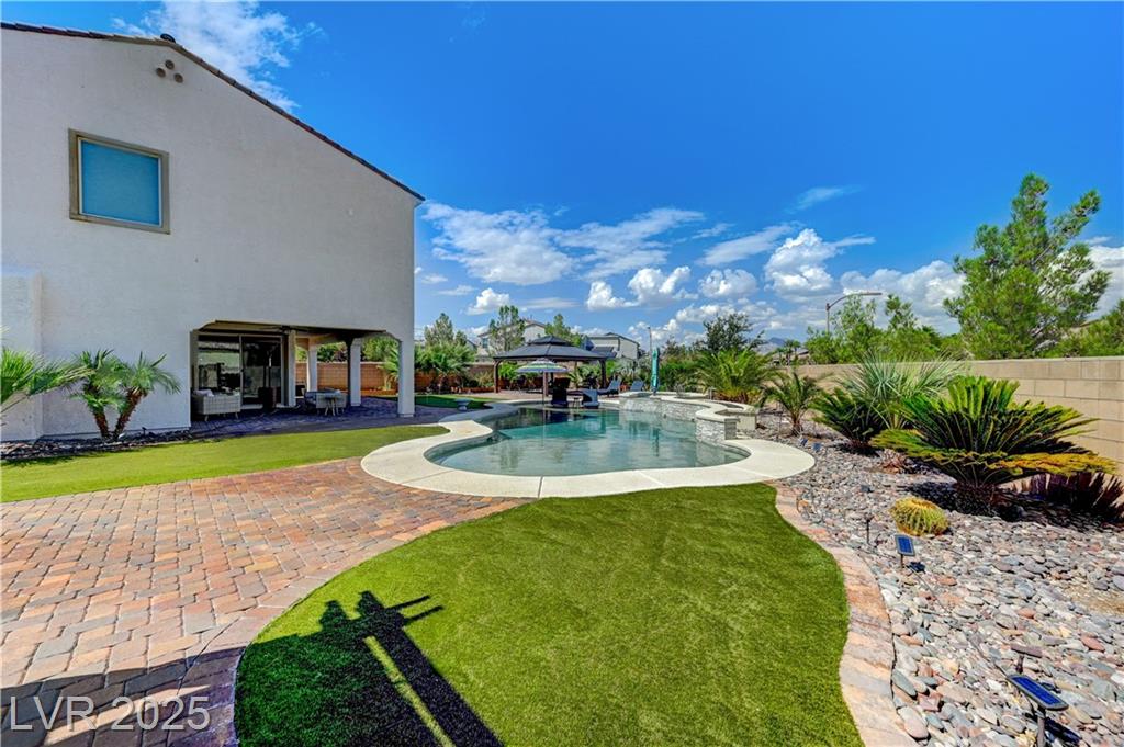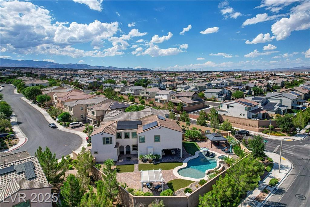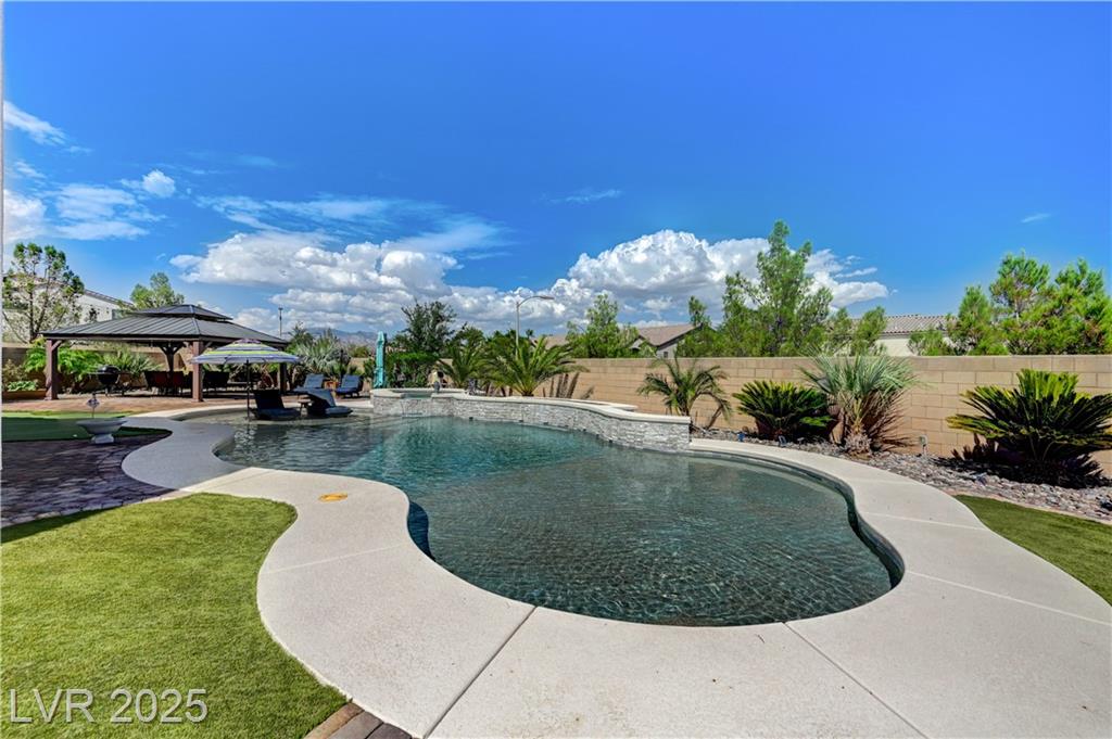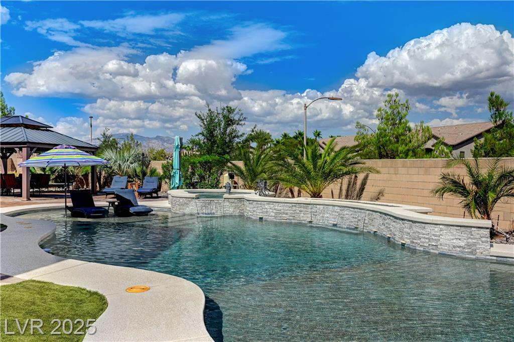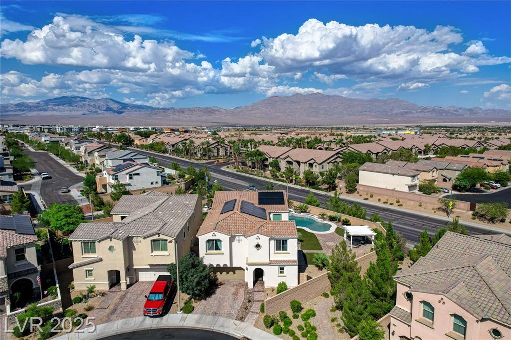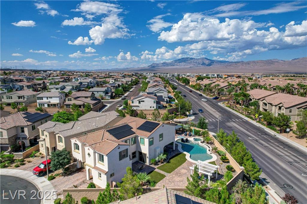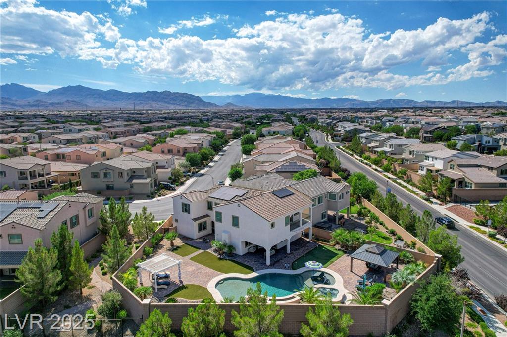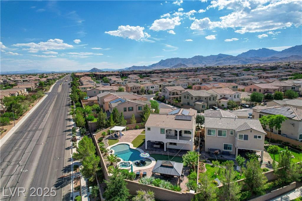This stunning 1/4-acre property showcases a beautifully upgraded 3,235 sq. ft. two-story home with a private-entry casita/in-law suite featuring a full bath and tile flooring. Inside, enjoy herringbone wood-style tile, soaring ceilings, and an open-concept layout with a spacious family room, gourmet kitchen with quartz counters, walk-in pantry, and dining area. Upstairs offers wood laminate, a luxurious primary suite with spa-like bath, dual walk-in closets, and a covered balcony with mountain views. A loft, two bedrooms with walk-in closets, a third bedroom with en-suite bath, dual vanity guest bath, and laundry room complete the second floor. Step outside to your own oasis—covered patio, custom pool & spa, two gazebos (one outdoor kitchen-ready), plus a serene courtyard with gas/firepit hookup. Ideally located near Skye Canyon amenities, shopping, and freeway access—with no SIDS/LIDS. Call today for your private tour!