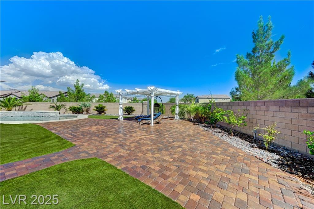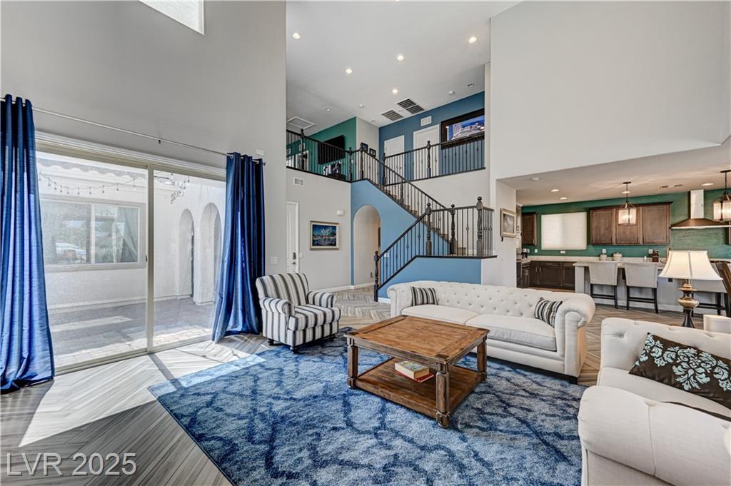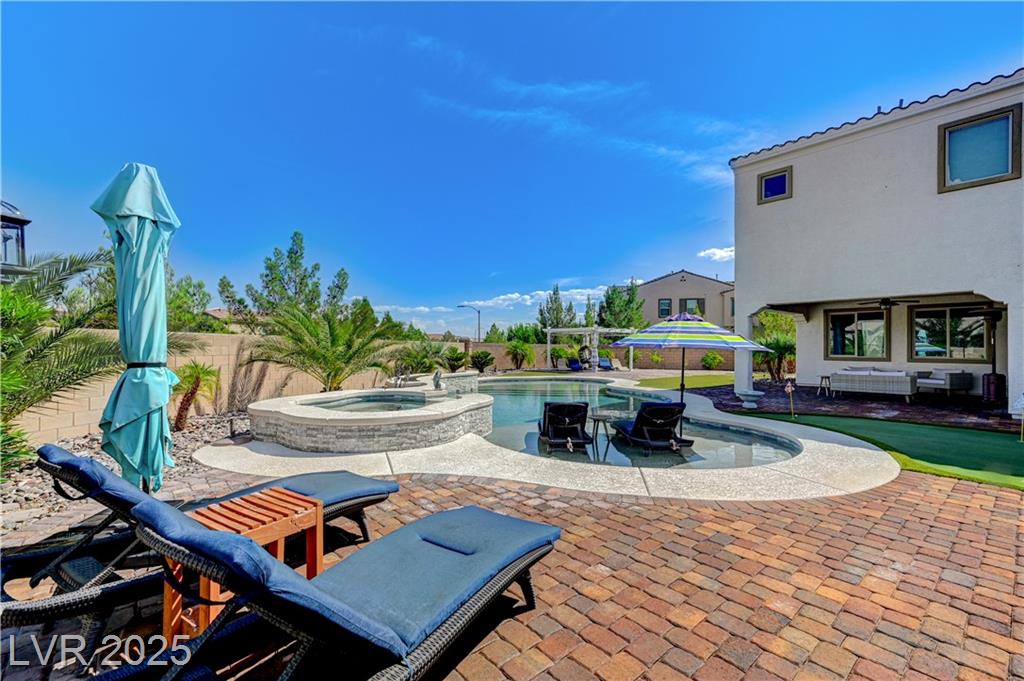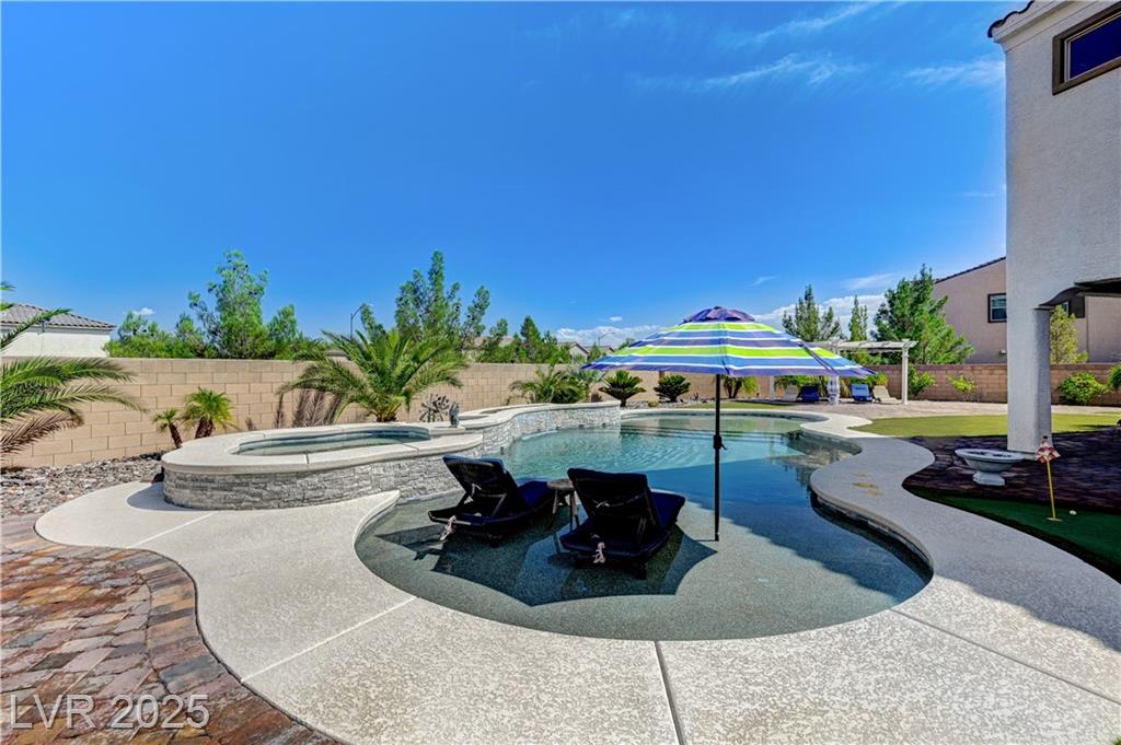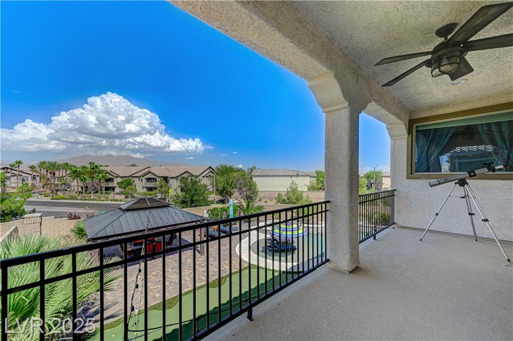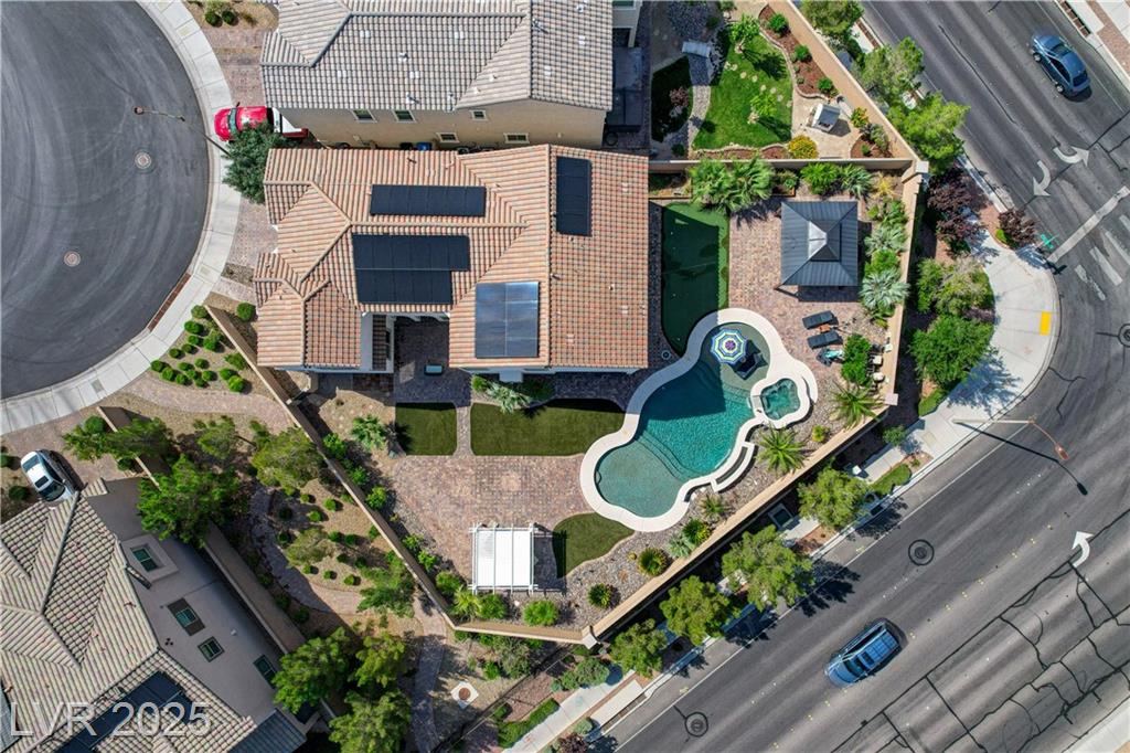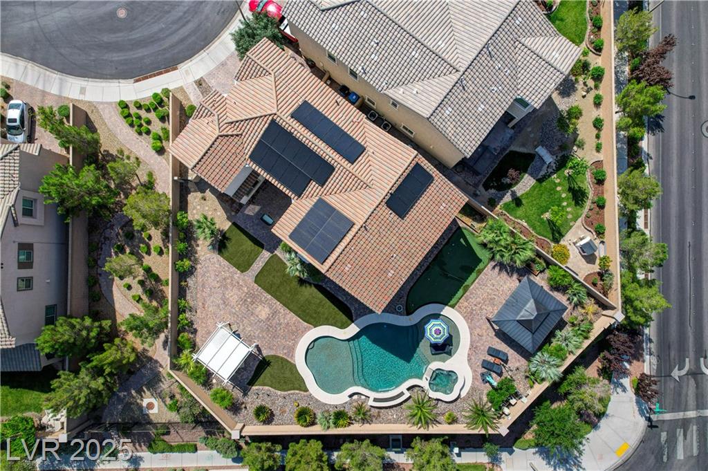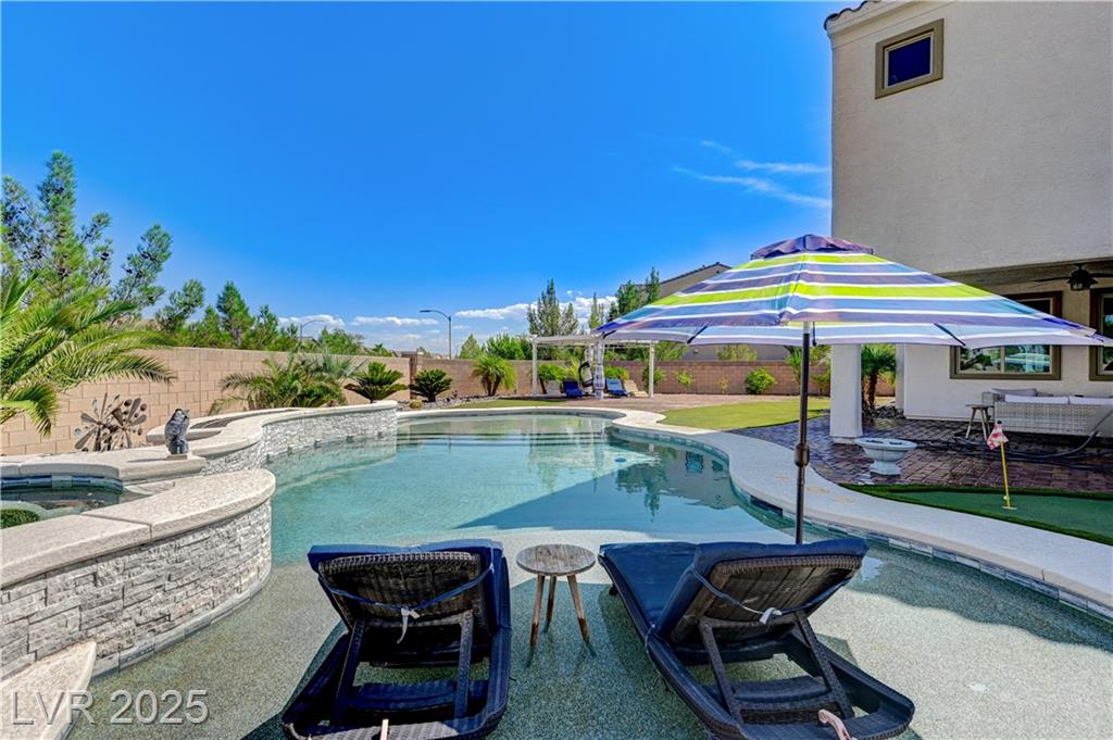 This stunning 1/4-acre property showcases a beautifully upgraded 3,235 sq. ft. two-story home with a private-entry casita/in-law suite featuring a full bath and tile flooring. Inside, enjoy herringbone wood-style tile, soaring ceilings, and an open-concept layout with a spacious family room, gourmet kitchen with quartz counters, walk-in pantry, and dining area. Upstairs offers wood laminate, a luxurious primary suite with spa-like bath, dual walk-in closets, and a covered balcony with mountain views. A loft, two bedrooms with walk-in closets, a third bedroom with en-suite bath, dual vanity guest bath, and laundry room complete the second floor. Step outside to your own oasis—covered patio, custom pool & spa, two gazebos (one outdoor kitchen-ready), plus a serene courtyard with gas/firepit hookup. Ideally located near Skye Canyon amenities, shopping, and freeway access—with no SIDS/LIDS. Call today for your private tour!
