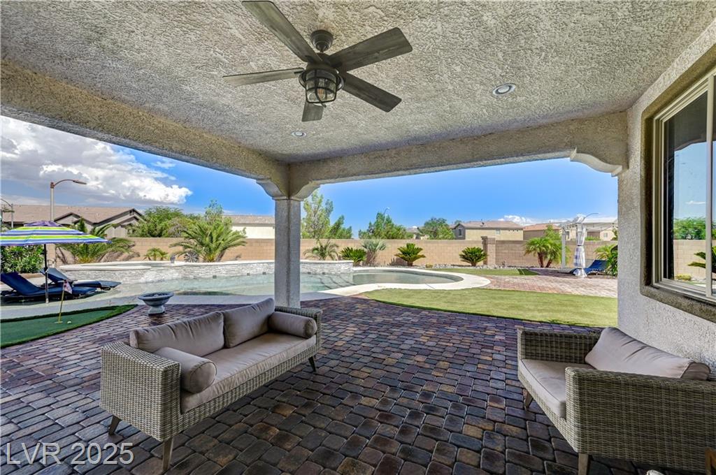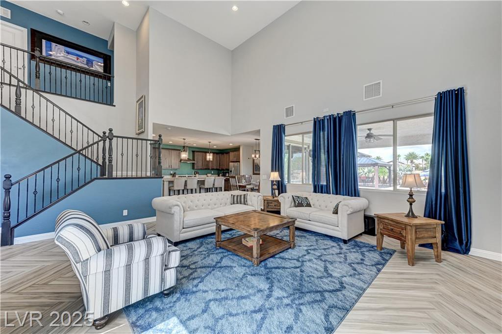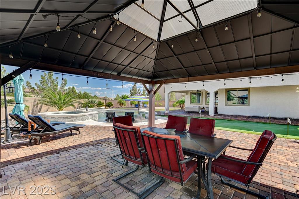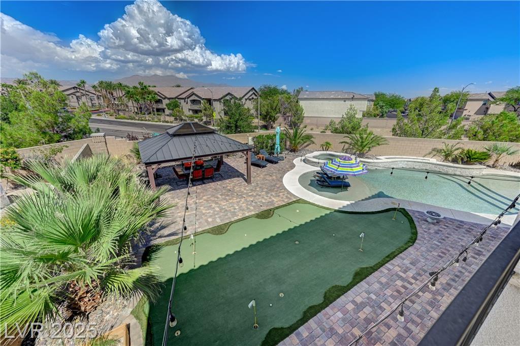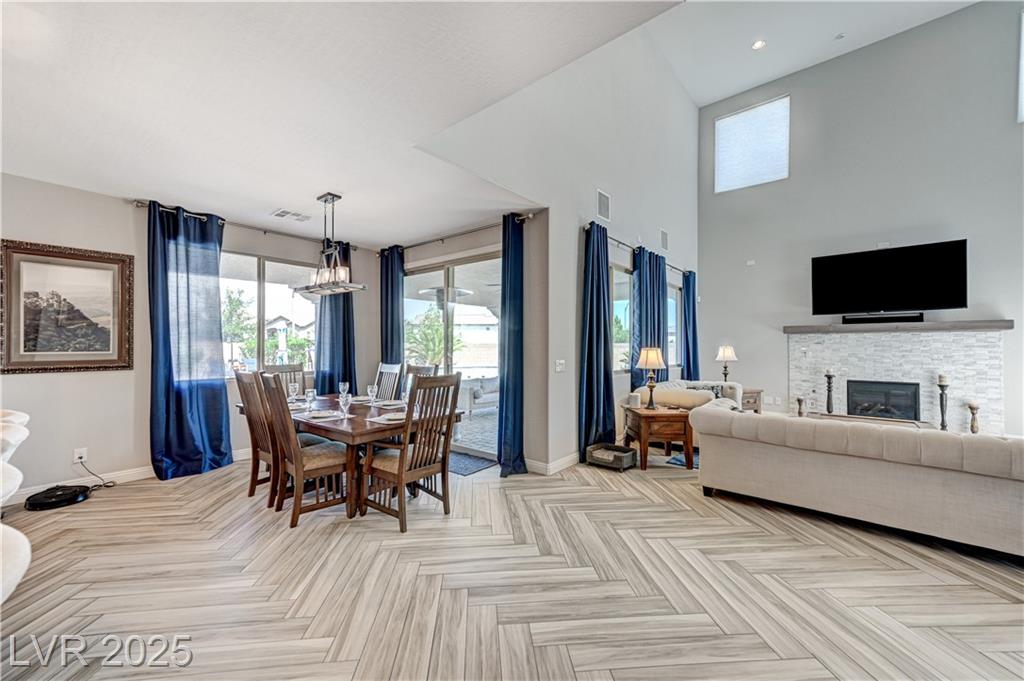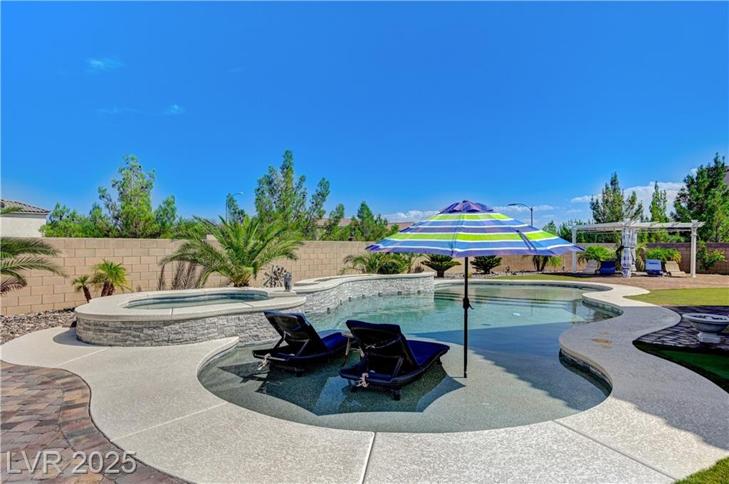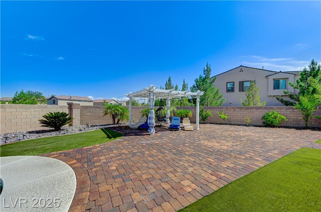 This stunning 1/4-acre property showcases a beautifully upgraded 3,235 sq. ft. two-story home with a private-entry casita/in-law suite featuring a full bath and tile flooring. Inside, enjoy herringbone wood-style tile, soaring ceilings, and an open-concept layout with a spacious family room, gourmet kitchen with quartz counters, walk-in pantry, and dining area. Upstairs offers wood laminate, a luxurious primary suite with spa-like bath, dual walk-in closets, and a covered balcony with mountain views. A loft, two bedrooms with walk-in closets, a third bedroom with en-suite bath, dual vanity guest bath, and laundry room complete the second floor. Step outside to your own oasis—covered patio, custom pool & spa, two gazebos (one outdoor kitchen-ready), plus a serene courtyard with gas/firepit hookup. Ideally located near Skye Canyon amenities, shopping, and freeway access—with no SIDS/LIDS. Call today for your private tour!