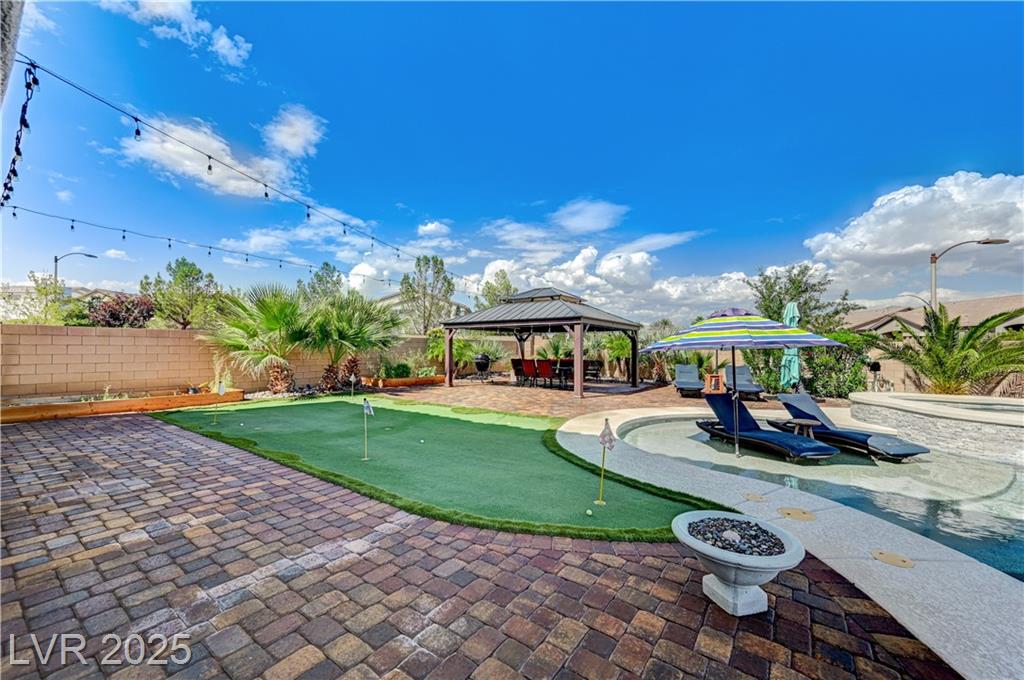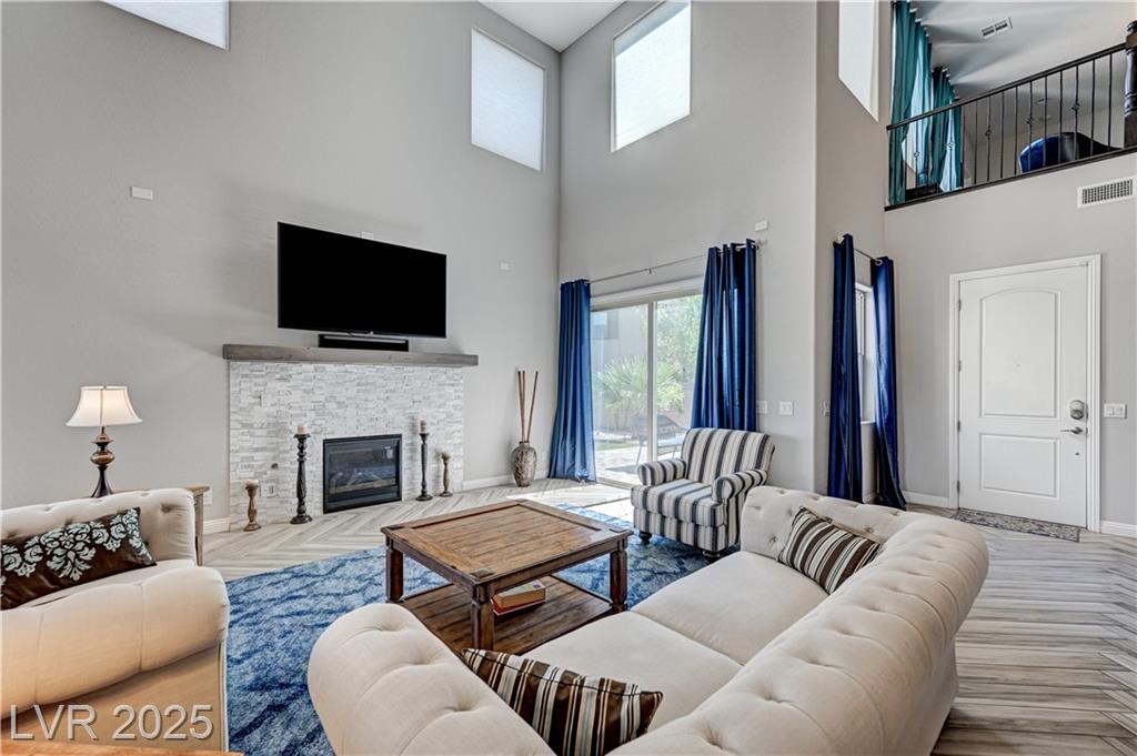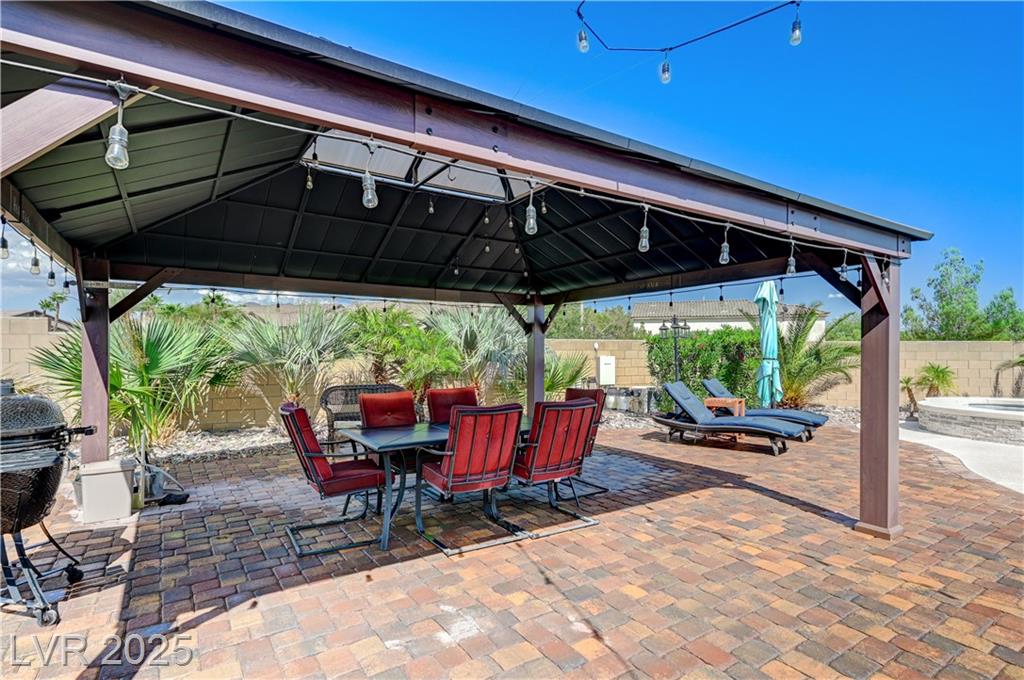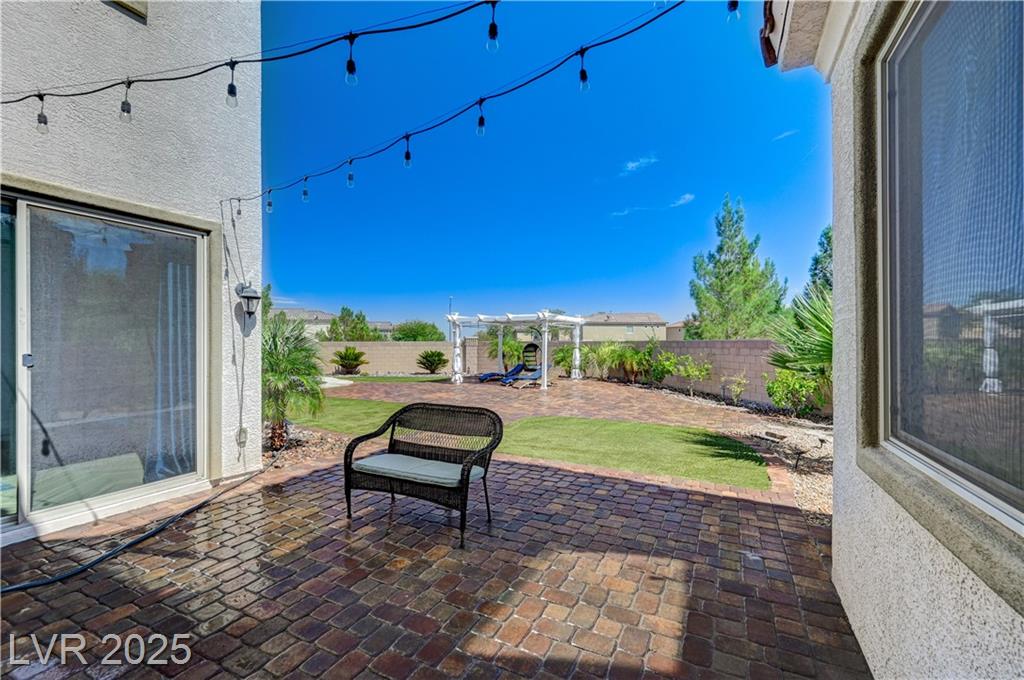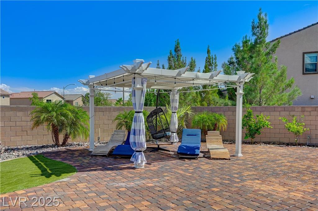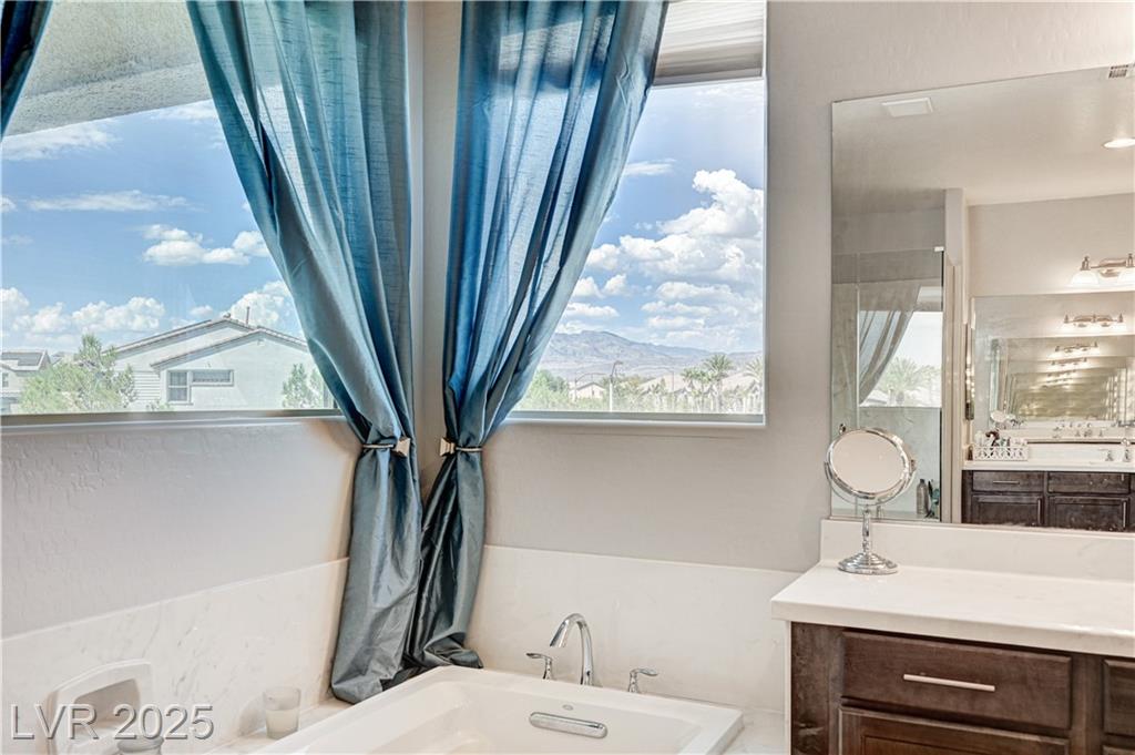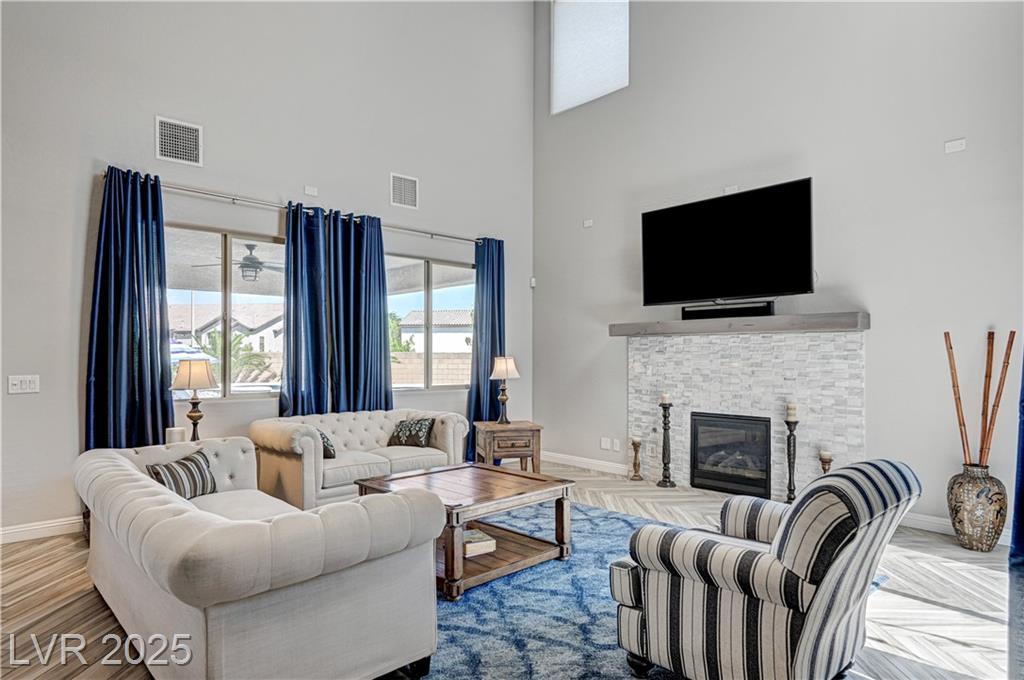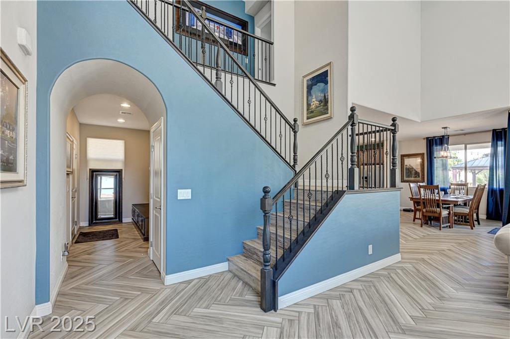This stunning 1/4-acre property showcases a beautifully upgraded 3,235 sq. ft. two-story home with a private-entry casita/in-law suite featuring a full bath and tile flooring. Inside, enjoy herringbone wood-style tile, soaring ceilings, and an open-concept layout with a spacious family room, gourmet kitchen with quartz counters, walk-in pantry, and dining area. Upstairs offers wood laminate, a luxurious primary suite with spa-like bath, dual walk-in closets, and a covered balcony with mountain views. A loft, two bedrooms with walk-in closets, a third bedroom with en-suite bath, dual vanity guest bath, and laundry room complete the second floor. Step outside to your own oasis—covered patio, custom pool & spa, two gazebos (one outdoor kitchen-ready), plus a serene courtyard with gas/firepit hookup. Ideally located near Skye Canyon amenities, shopping, and freeway access—with no SIDS/LIDS. Call today for your private tour!