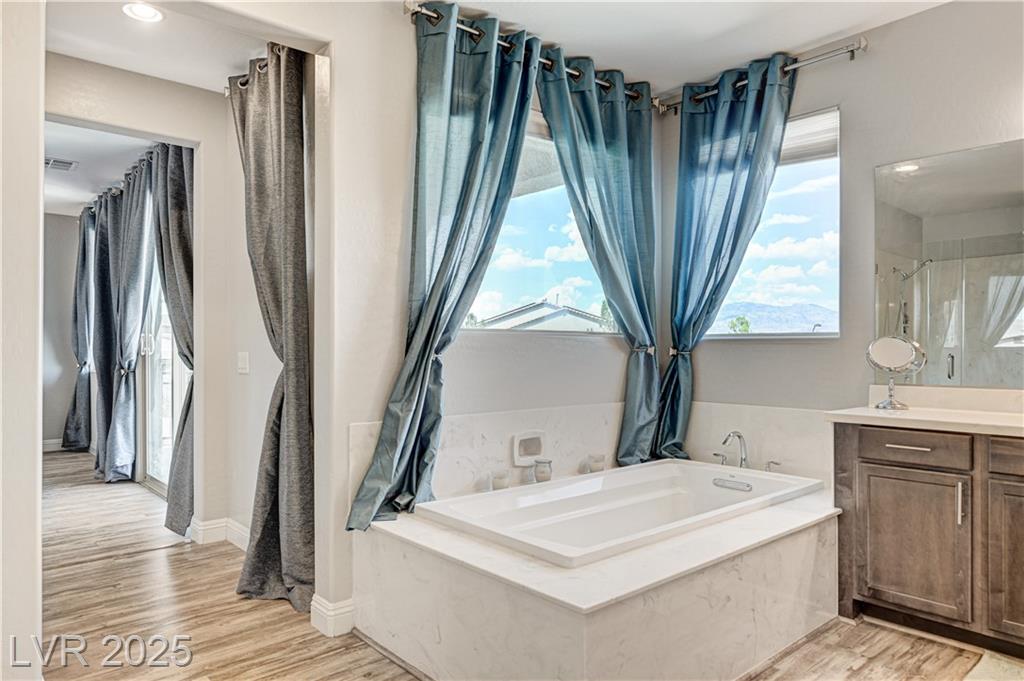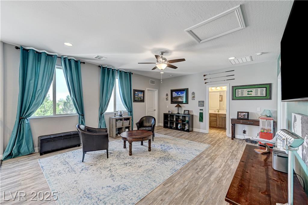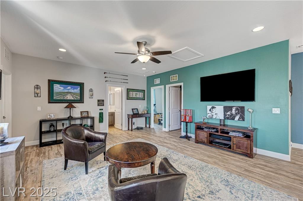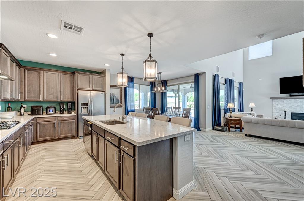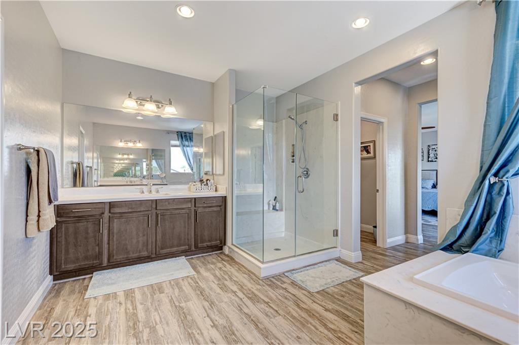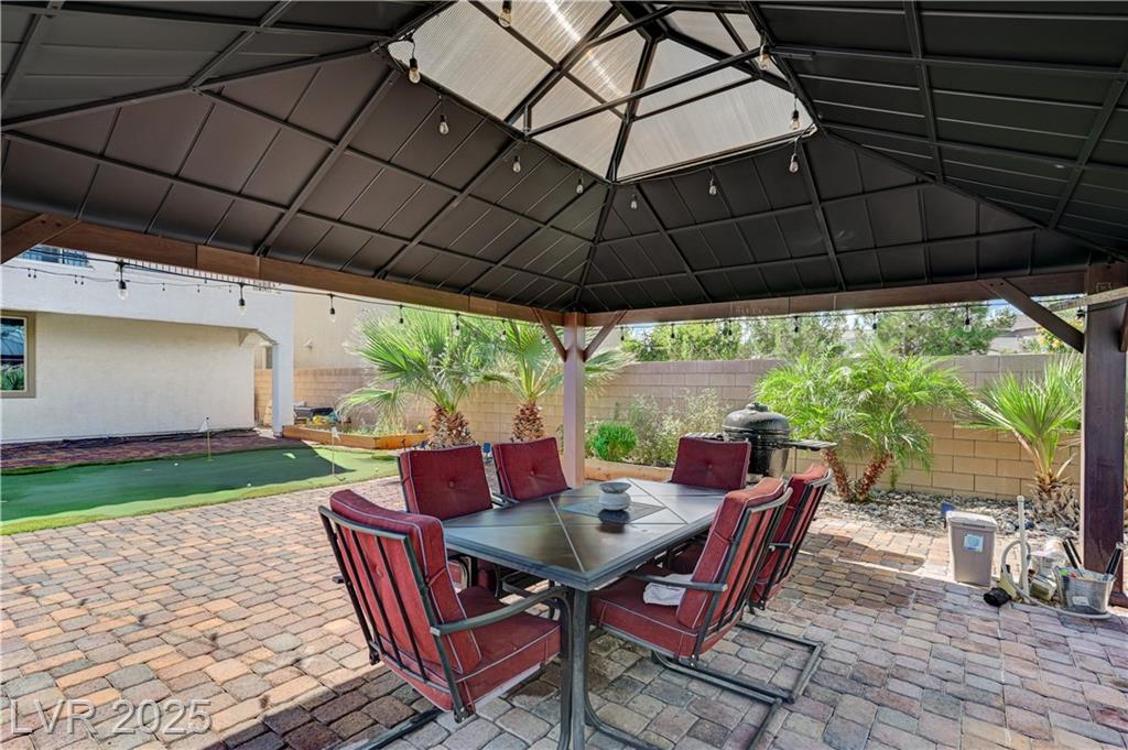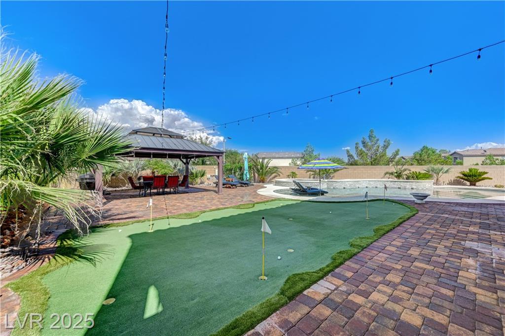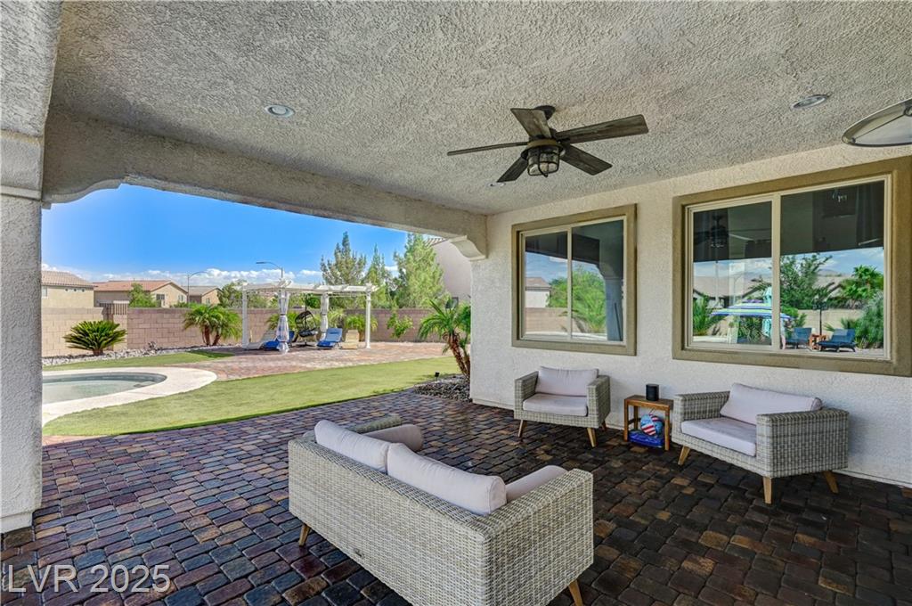 This stunning 1/4-acre property showcases a beautifully upgraded 3,235 sq. ft. two-story home with a private-entry casita/in-law suite featuring a full bath and tile flooring. Inside, enjoy herringbone wood-style tile, soaring ceilings, and an open-concept layout with a spacious family room, gourmet kitchen with quartz counters, walk-in pantry, and dining area. Upstairs offers wood laminate, a luxurious primary suite with spa-like bath, dual walk-in closets, and a covered balcony with mountain views. A loft, two bedrooms with walk-in closets, a third bedroom with en-suite bath, dual vanity guest bath, and laundry room complete the second floor. Step outside to your own oasis—covered patio, custom pool & spa, two gazebos (one outdoor kitchen-ready), plus a serene courtyard with gas/firepit hookup. Ideally located near Skye Canyon amenities, shopping, and freeway access—with no SIDS/LIDS. Call today for your private tour!