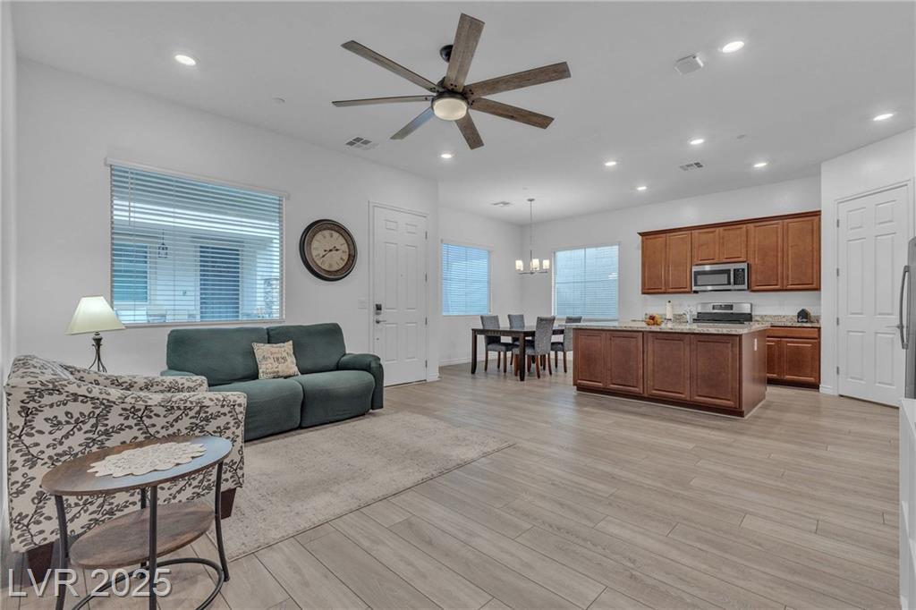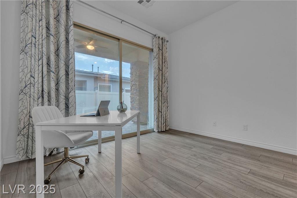 Beautiful, Modern and Move-In-Ready 2BR + Den / 2BA home in 55+ Guard-Gated Heritage at Cadence featuring a popular single-story courtyard design and open-concept floor plan. The kitchen boasts granite countertops, large island, stainless steel appliances and walk-in pantry. Additional features include luxury vinyl plank flooring throughout, decorative ceiling fans, Rheem water softener, Brisa retractable screen door and LV Pro Tint on select windows for heat/UV protection. Garage includes NEMA outlet for EV/golf cart charging and Genie Garage Door opener compatible w/Aladdin Connect. Enjoy resort-style amenities: clubhouse, indoor/outdoor pools, pickleball, tennis, fitness center, dog parks, social events and more. Located in Cadence - ranked in 2025 as a Top 3 U.S. master-planned community—near trails, parks, golf, shopping, world class dining and entertainment!